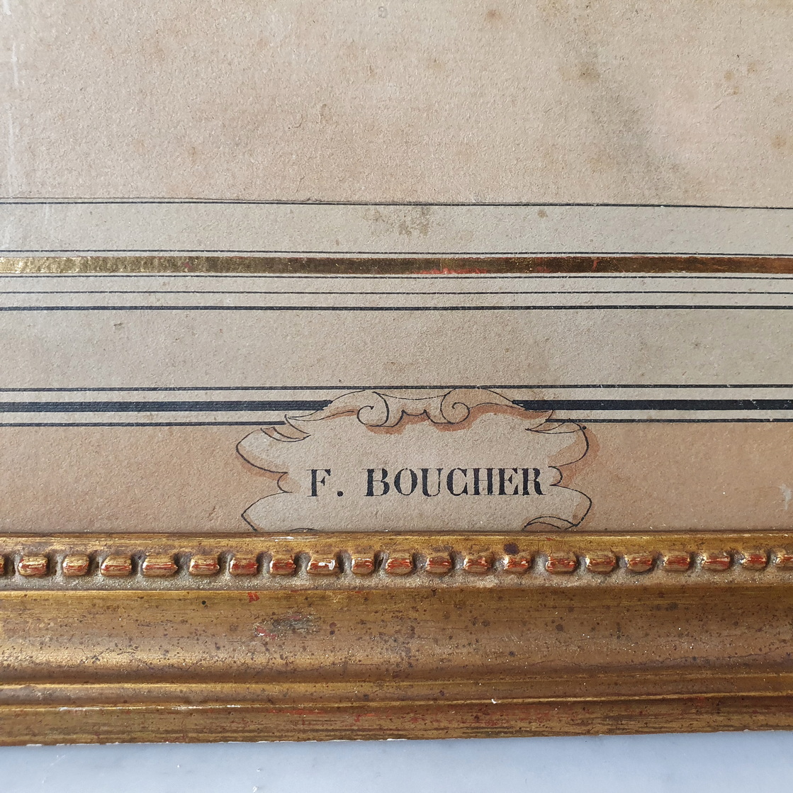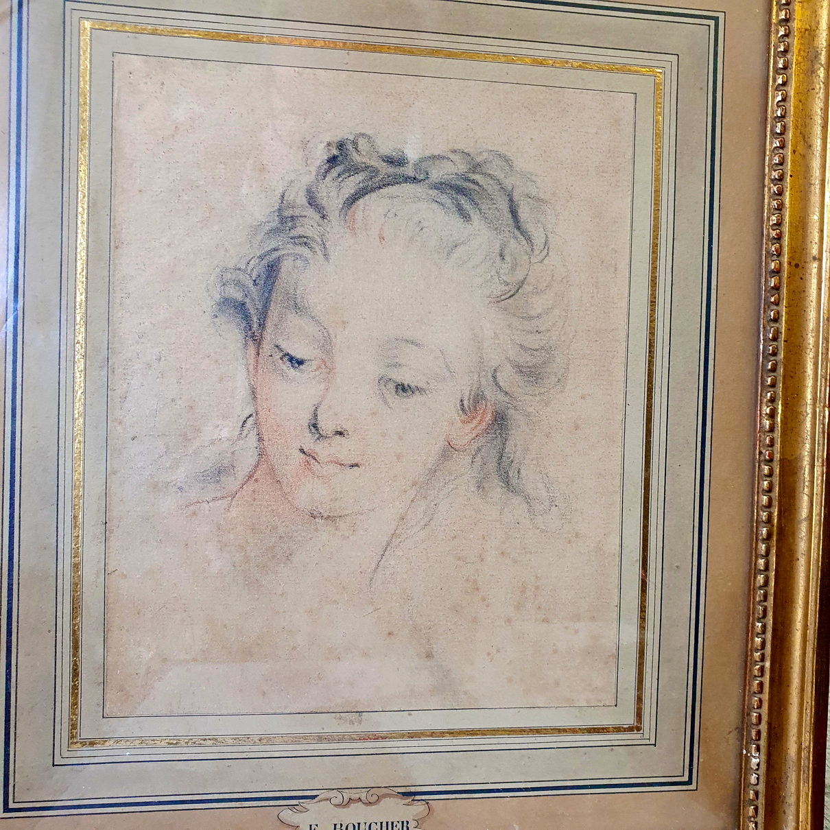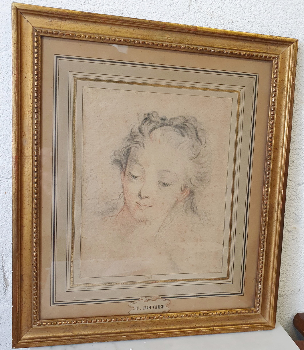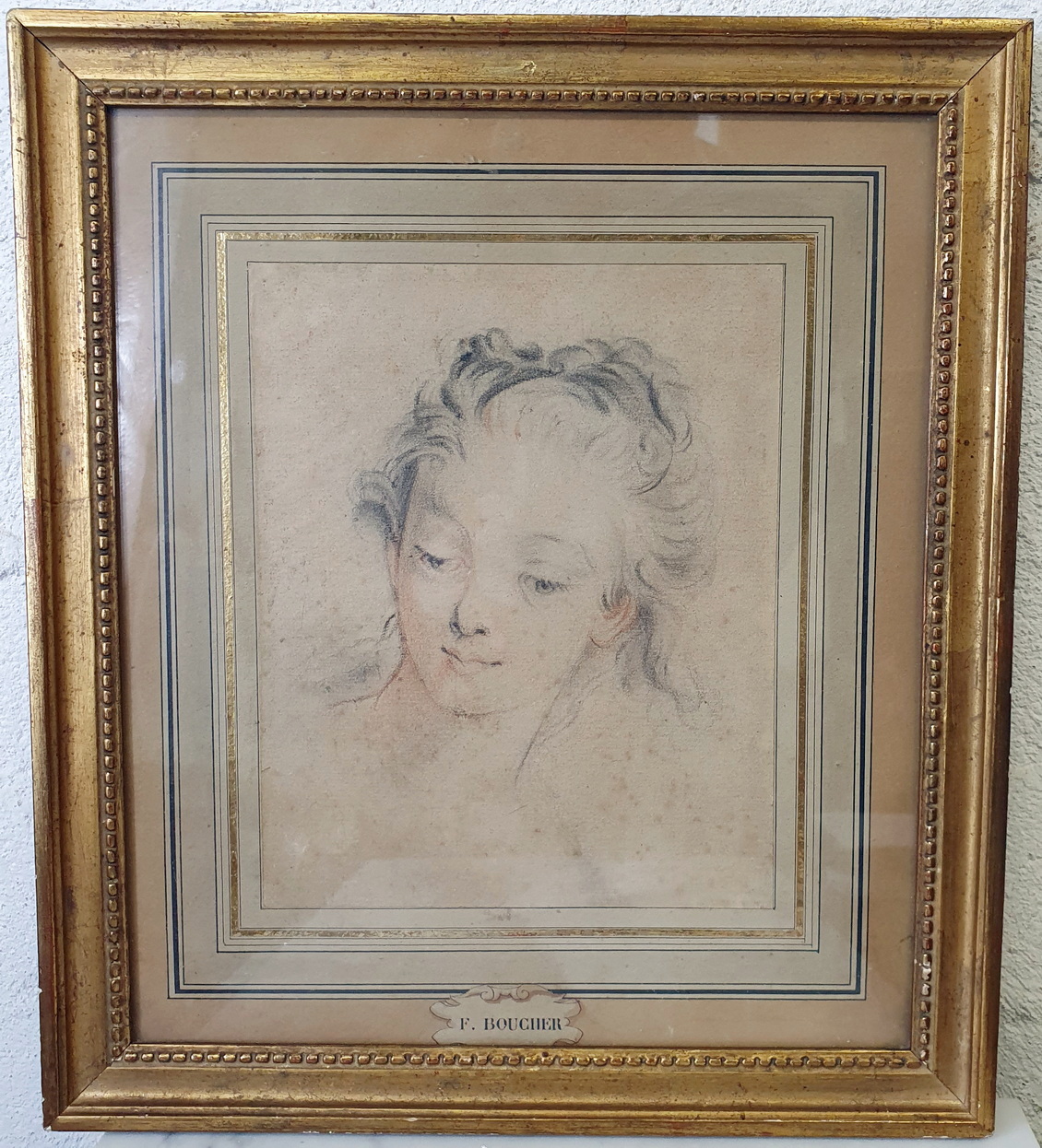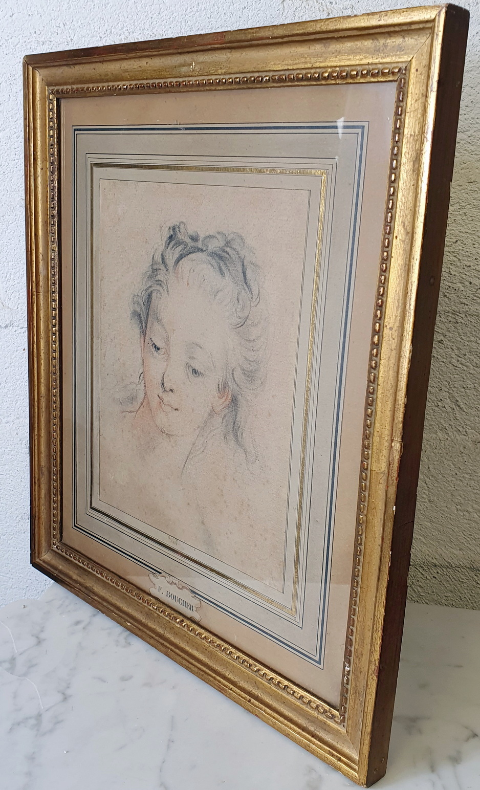 A framed, 18th century graphite on paper portrait of a young girl in the style of François Boucher (1703-1770), the Parisian Rococo style painter renown for his delicate and sensuous portraits and idyllic scenes. The rear of the gilt frame with a sticker of the famous Galerie Legrip, an art gallery in Rouen that hosted important artists and exhibitions in the early 1900s. The drawing's mount has a hand-drawn cartouche inscribed with "F. Boucher". Area of Paris, circa 1750.