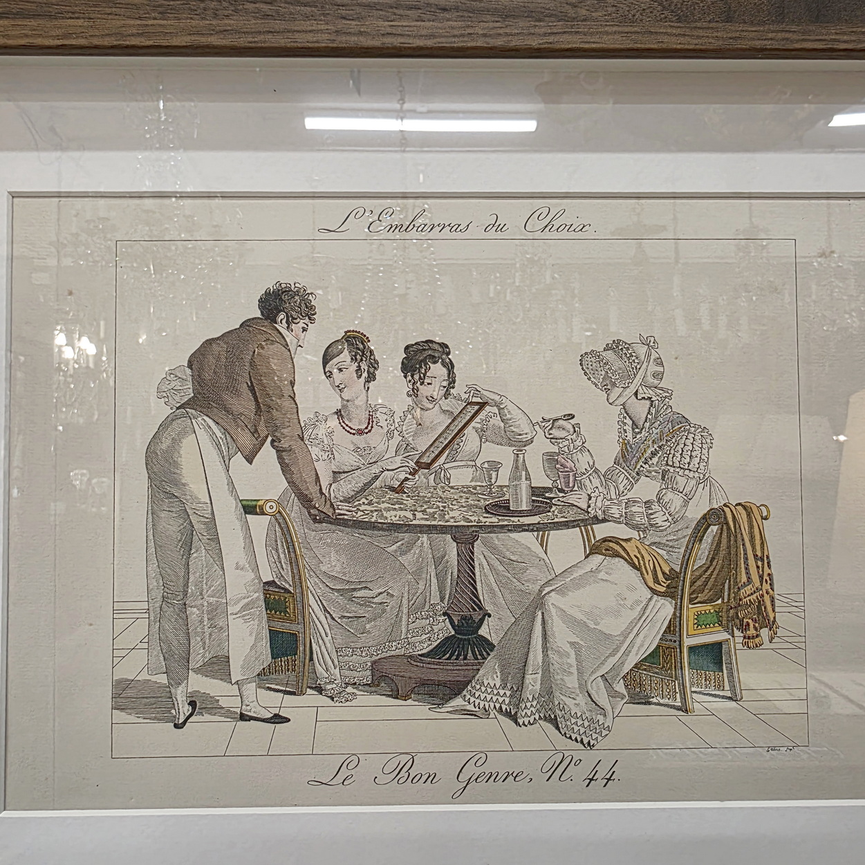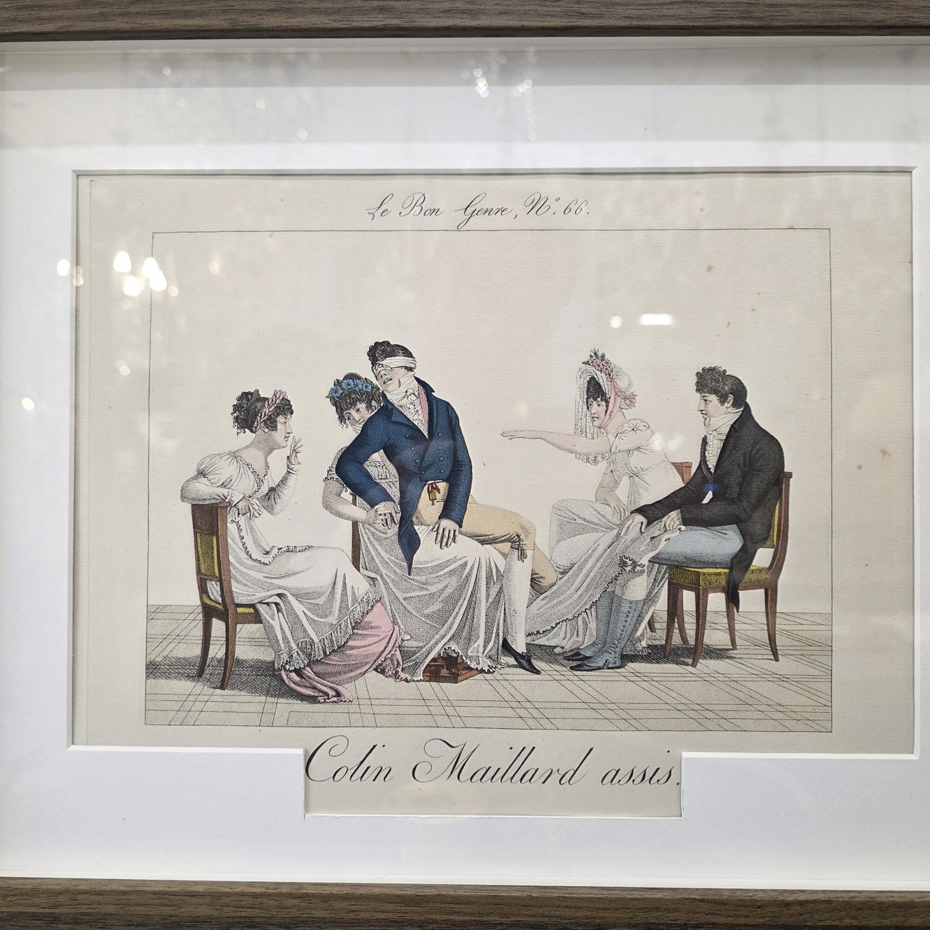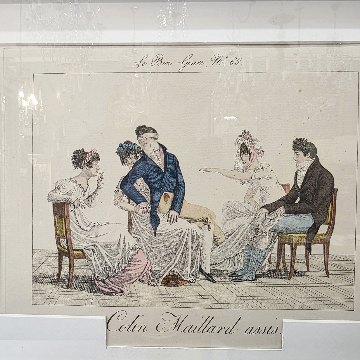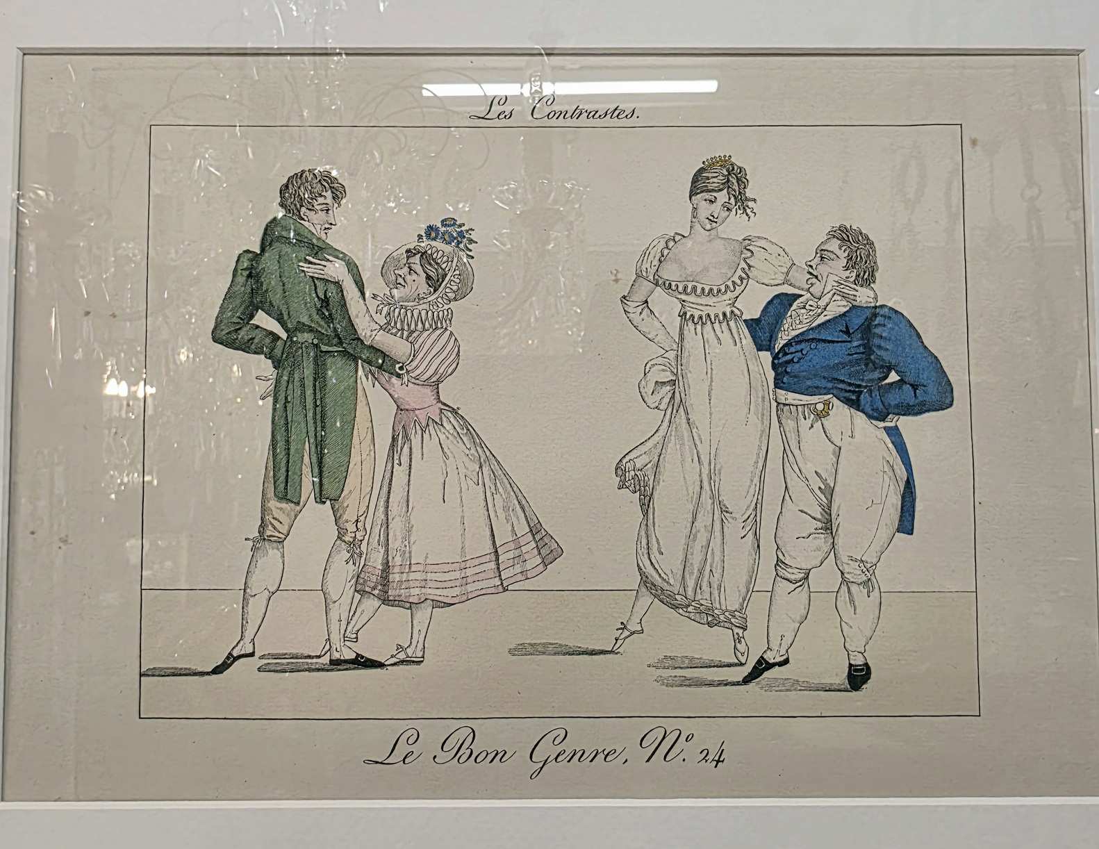 A set of twelve early 20th century hand-coloured French fashion prints, depicting elegantly dressed figures engaged in typical high-society games and activities, depicted with, and commented on with humour. These prints are labelled nr. 605, in a run of 750 prints. They are a 1931 re-edition of the 1827 "Le Bon Genre" (Good Style, Good Class) prints. Area of Paris, 1931.