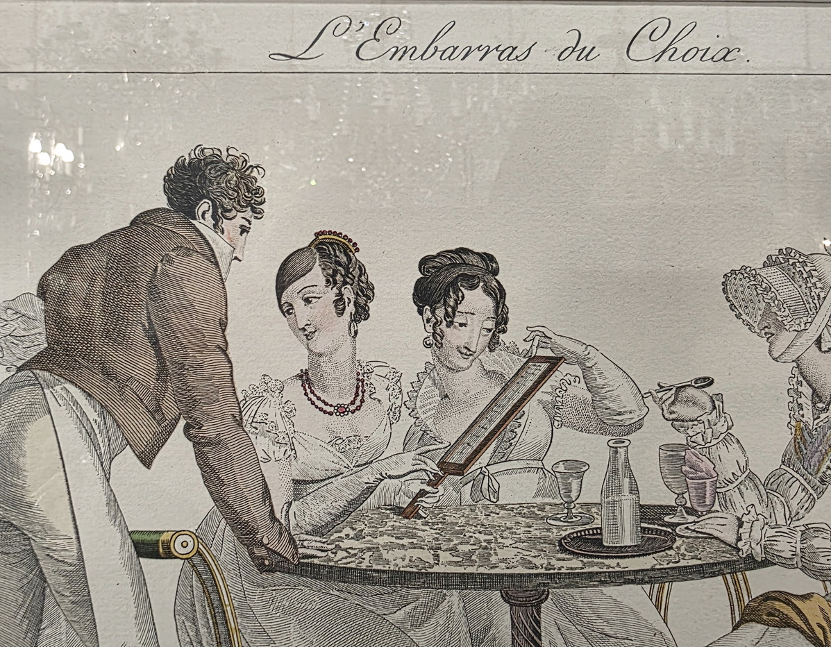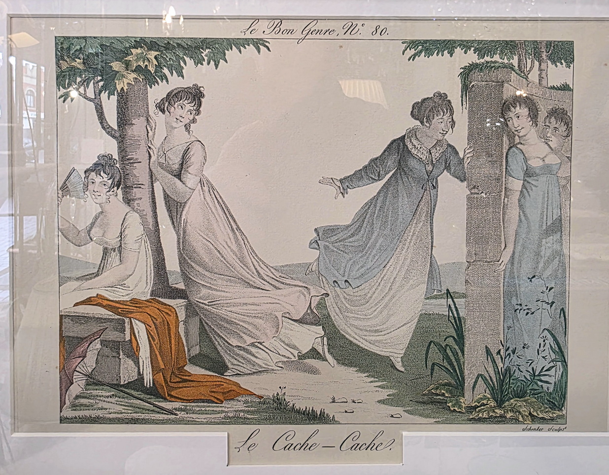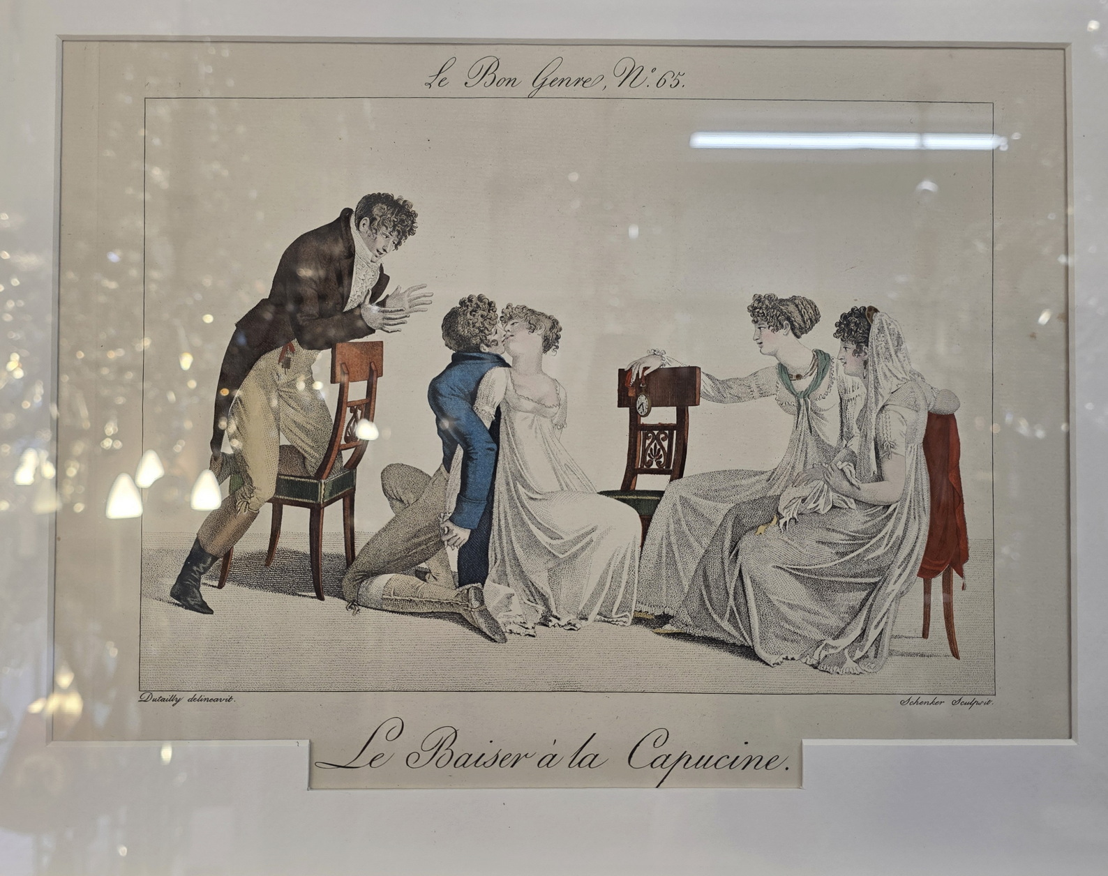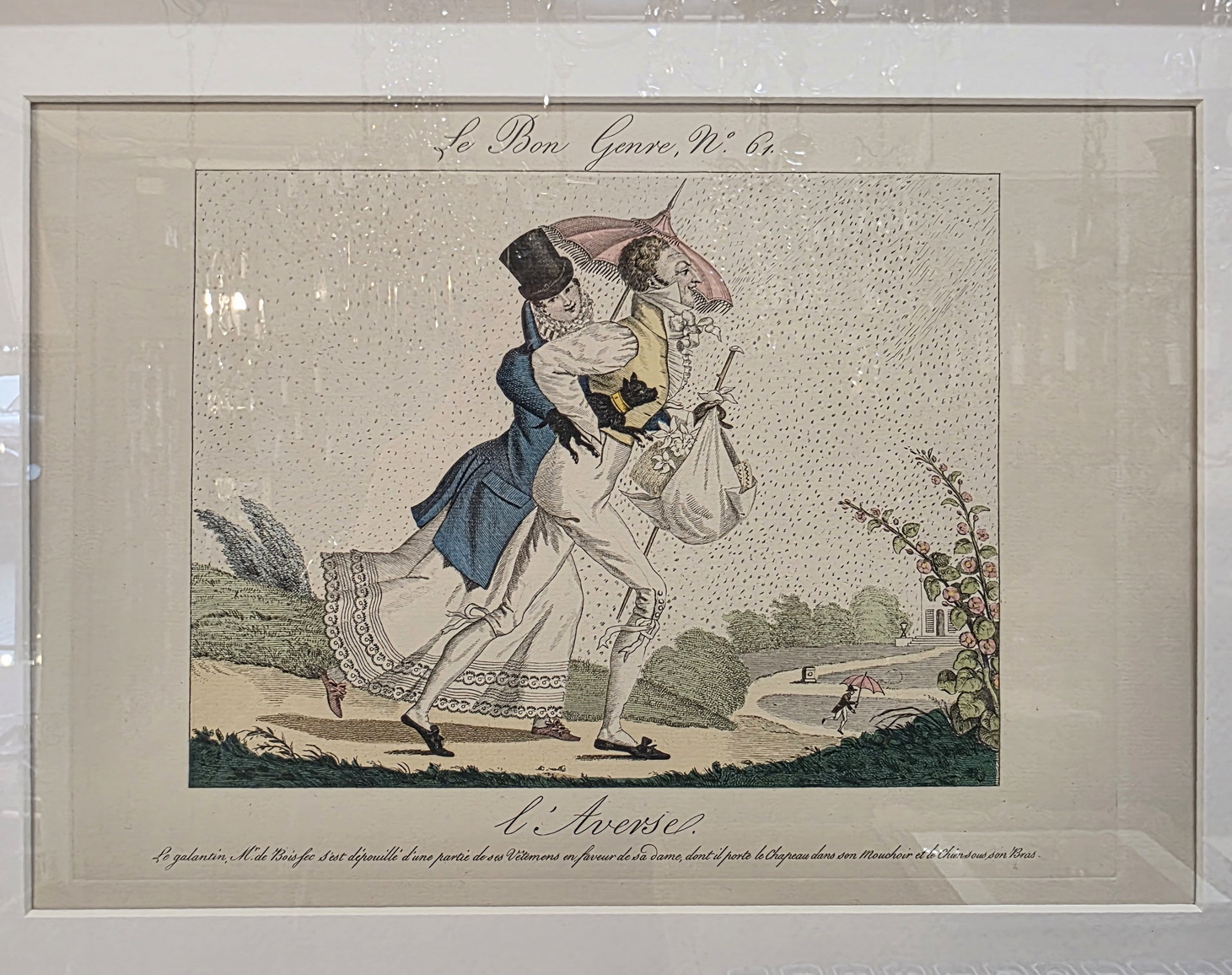 A set of twelve early 20th century hand-coloured French fashion prints, depicting elegantly dressed figures engaged in typical high-society games and activities, depicted with, and commented on with humour. These prints are labelled nr. 605, in a run of 750 prints. They are a 1931 re-edition of the 1827 "Le Bon Genre" (Good Style, Good Class) prints. Area of Paris, 1931.