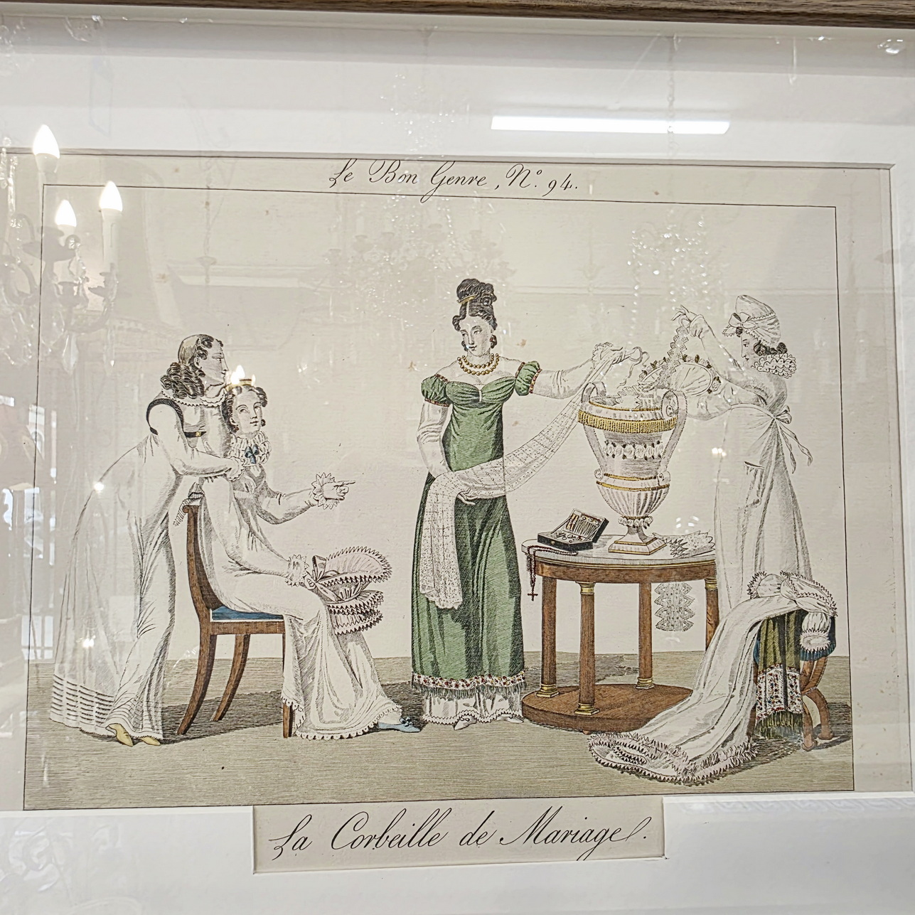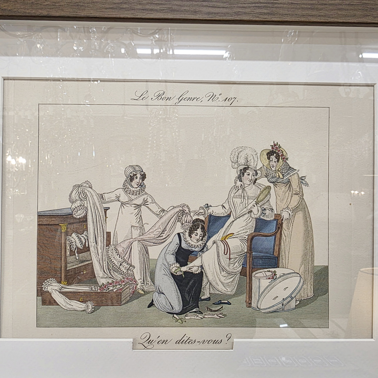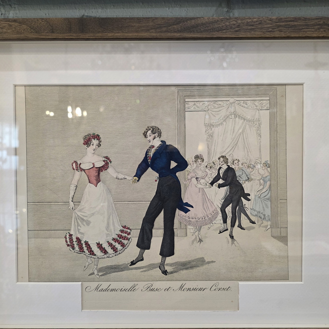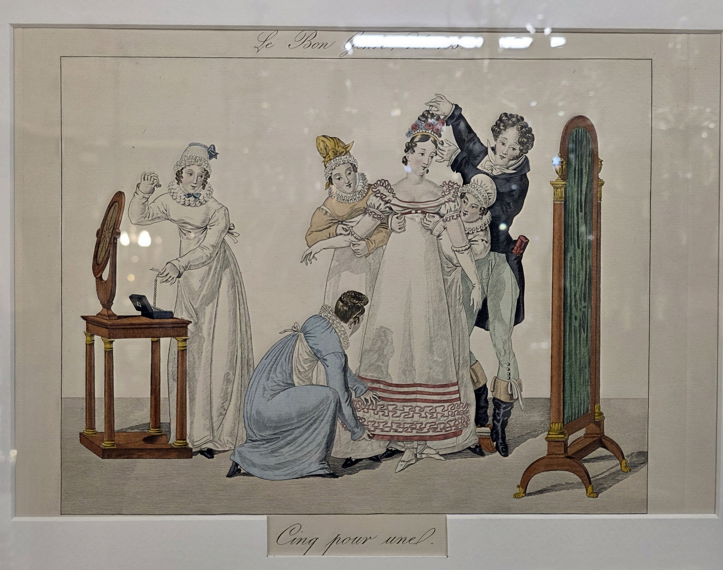 A set of twelve early 20th century hand-coloured French fashion prints, depicting elegantly dressed figures engaged in typical high-society games and activities, depicted with, and commented on with humour. These prints are labelled nr. 605, in a run of 750 prints. They are a 1931 re-edition of the 1827 "Le Bon Genre" (Good Style, Good Class) prints. Area of Paris, 1931.