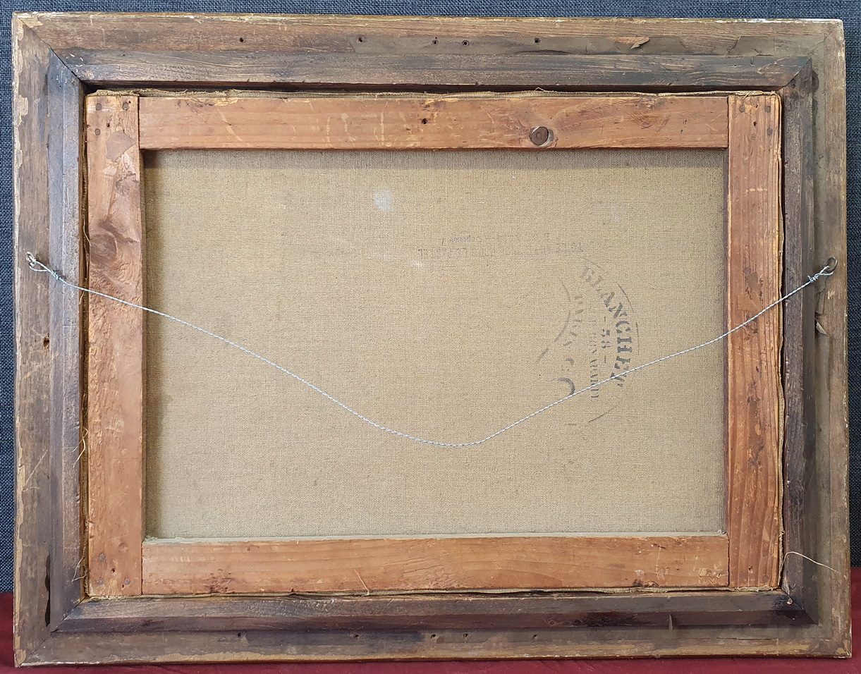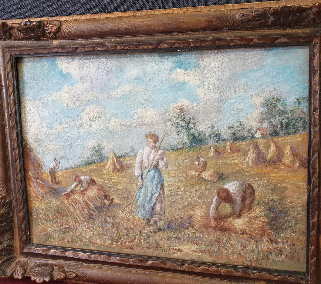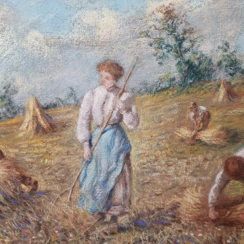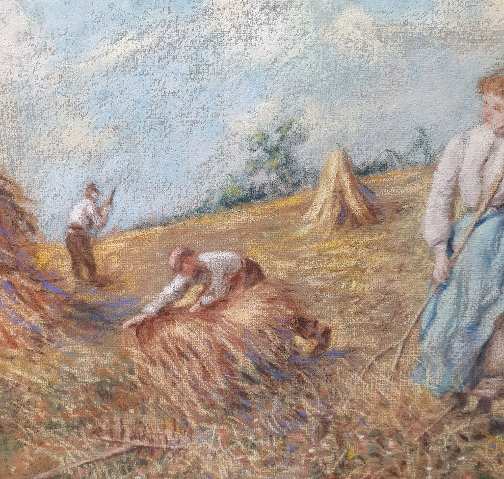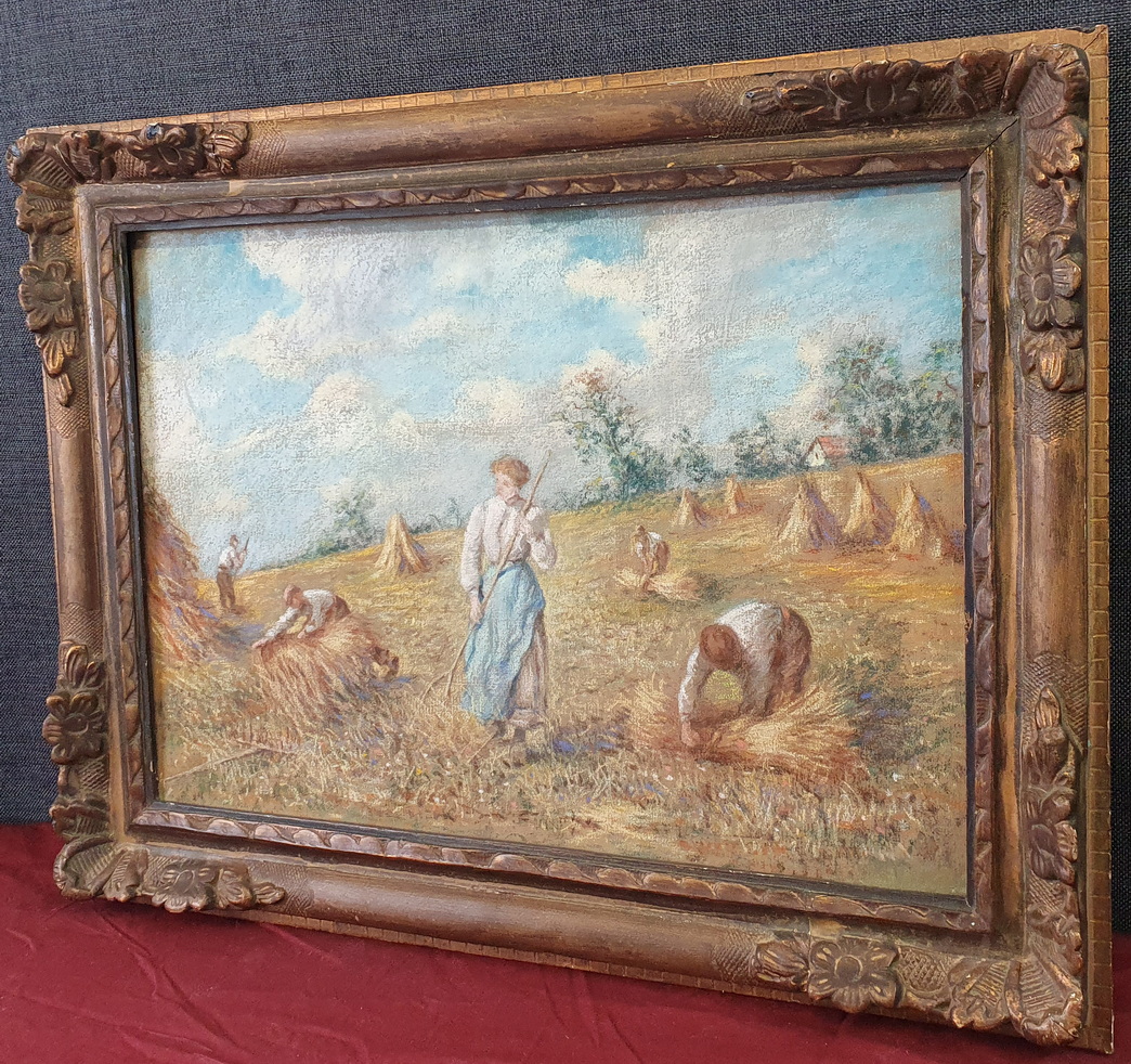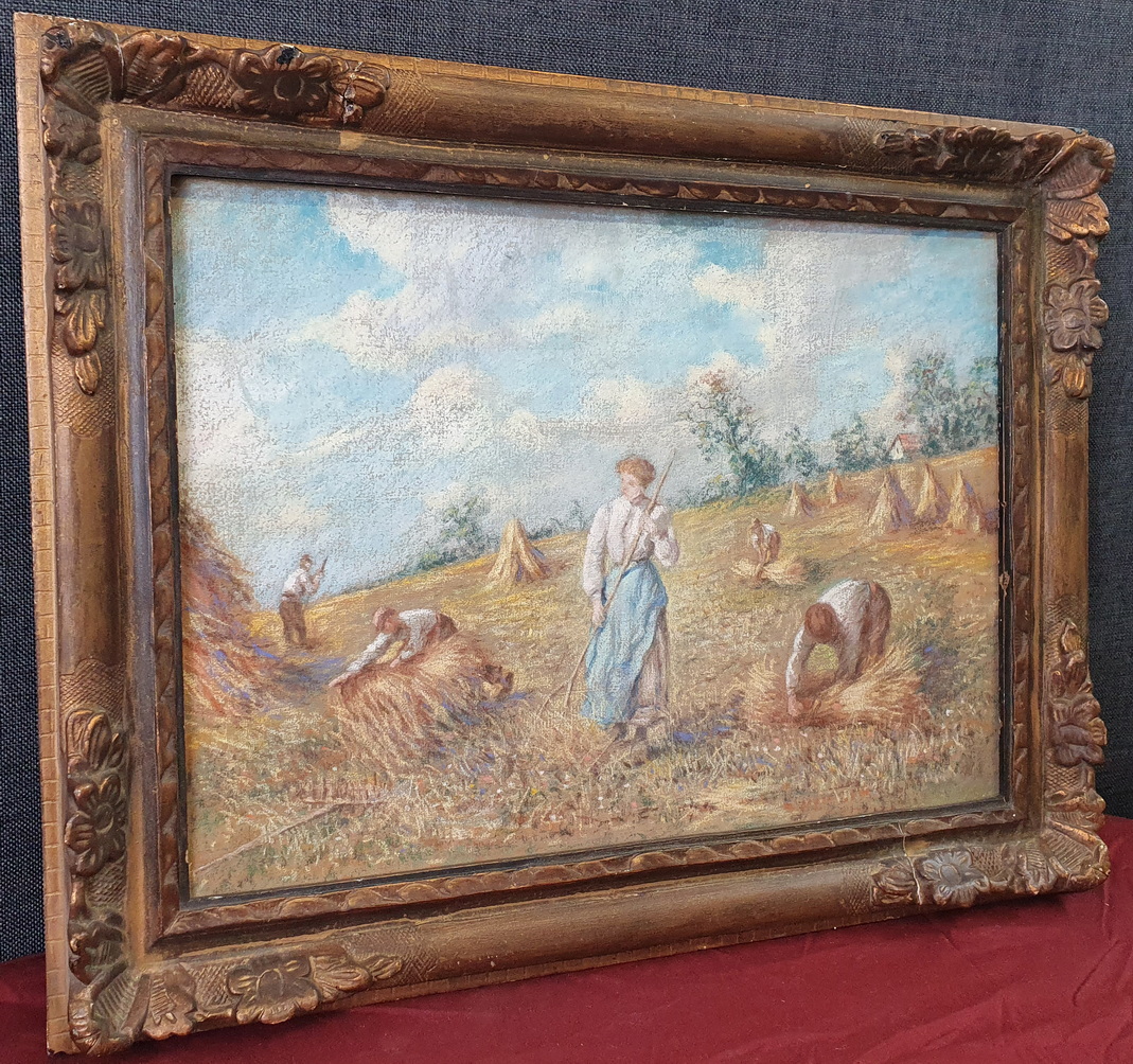 A 19th century pastel on paper landscape depicting a harvest scene in France, mounted on its original stretched canvas support and fitted into its original carved and gilt frame. Unsigned. The style and the luminous quality of this painting is very close to the works by Léon-Augustin Lhermitte (1844-1925), a French naturalist painter who was known for his scenes of peasants working in fields, many of them executed with pastels on paper. The rear of the pastel with the original Parisian canvas maker's stamp. Area of Paris, circa 1890.