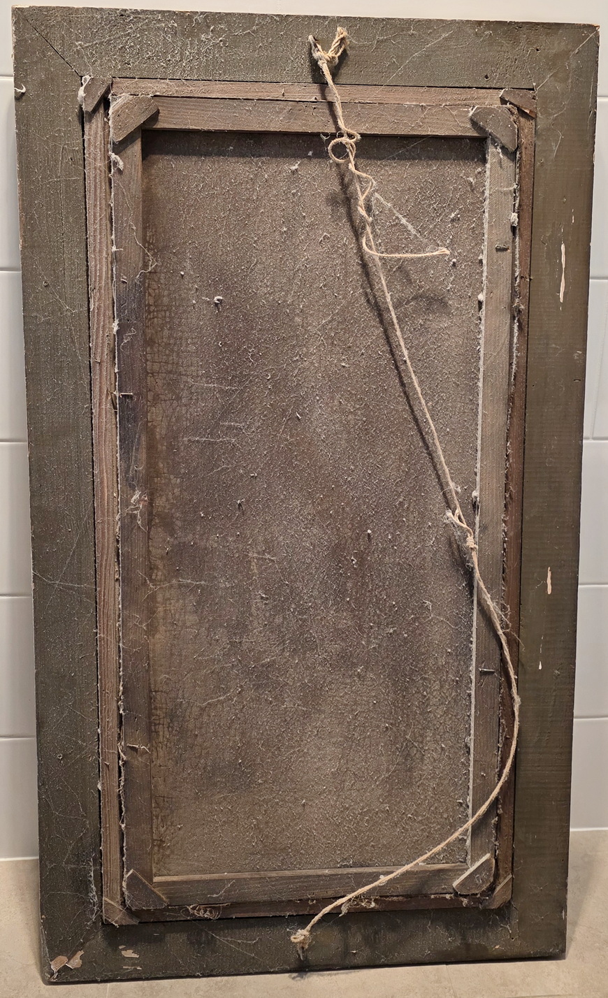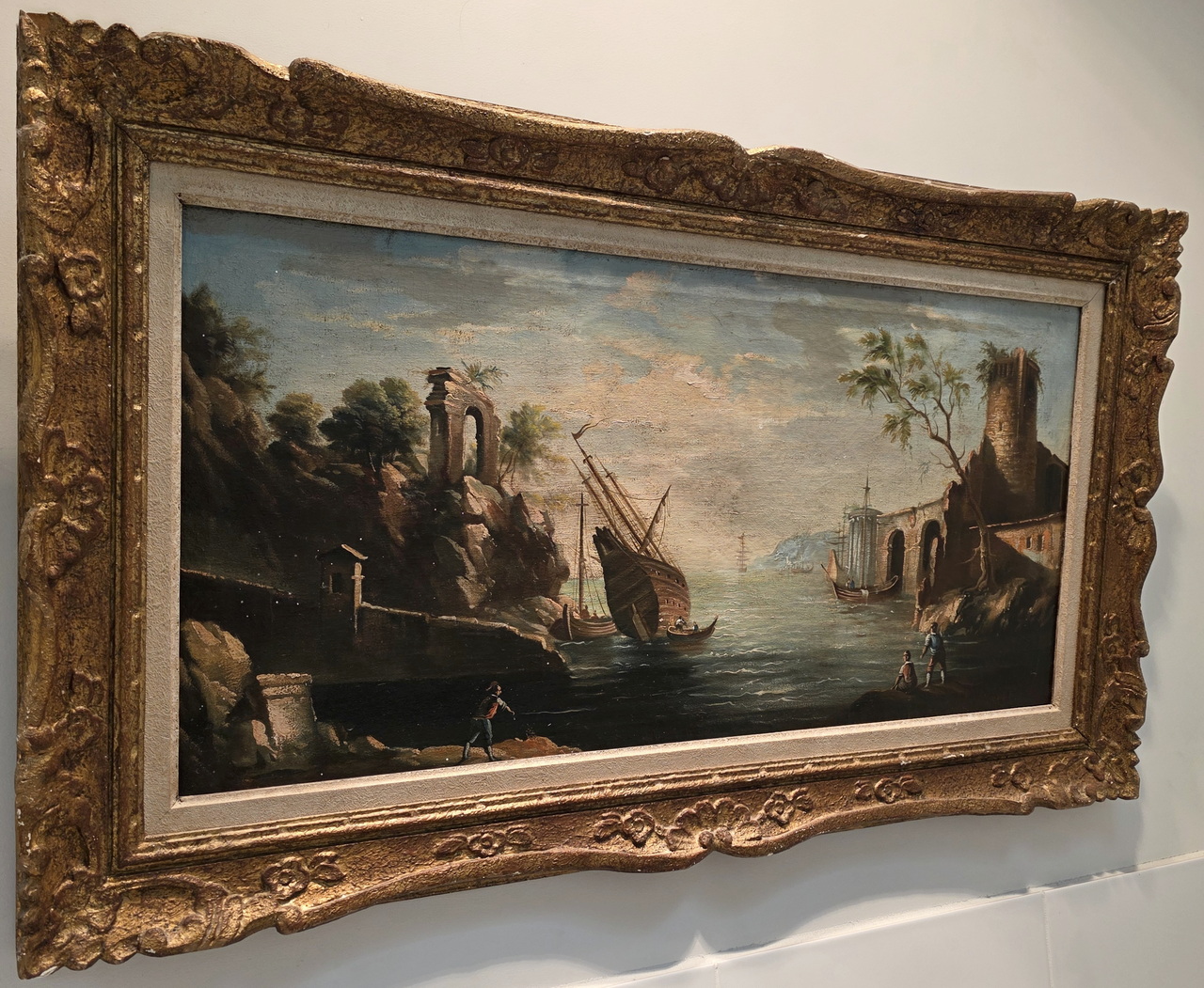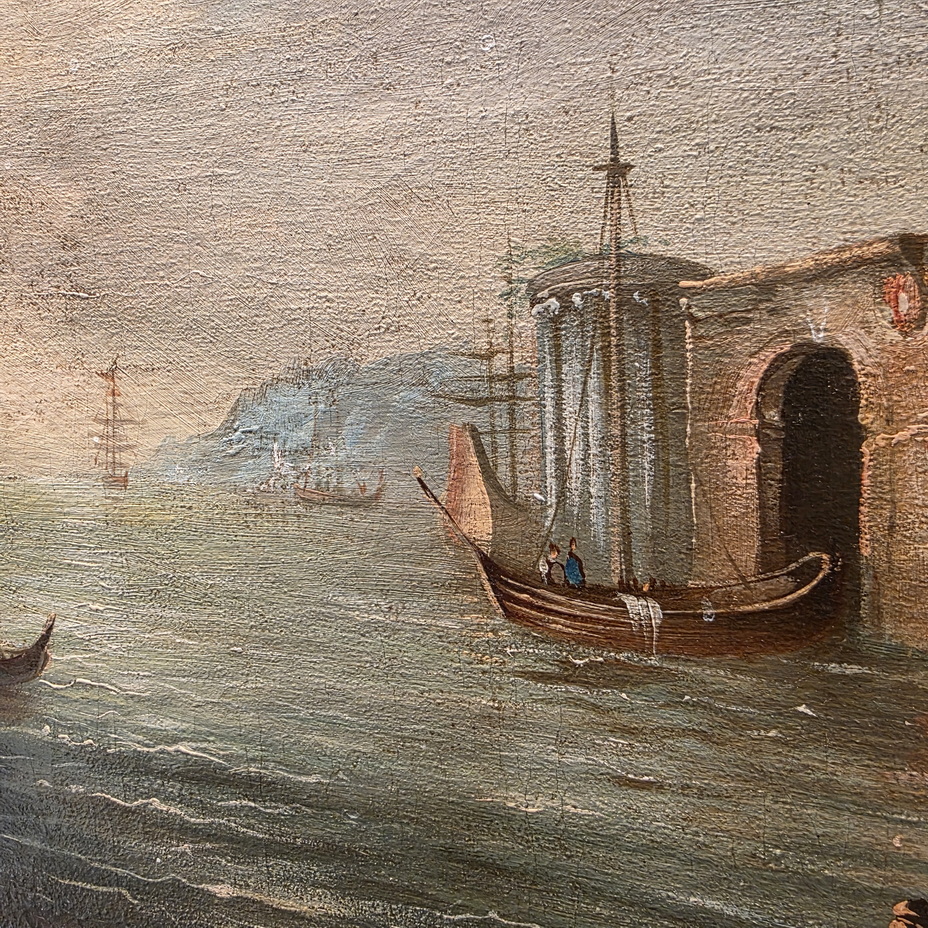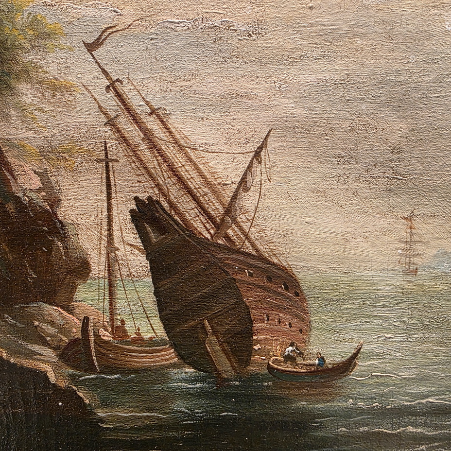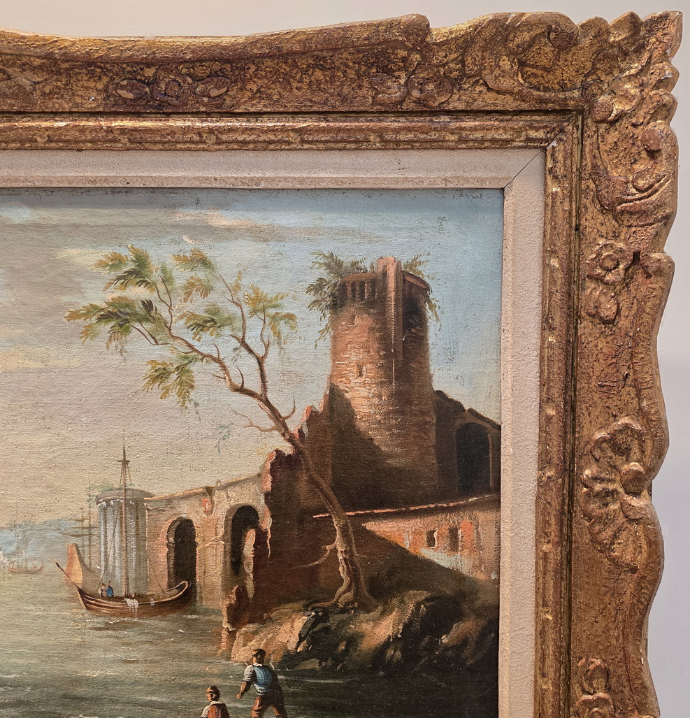 A 19th century Italian oil on canvas seascape in the manner of Salvator Rosa (Naples 1615 - Rome 1673) depicting a Marina rendered in the romantic style, with towers, arches and ruins, and with sailing ships at anchor in the foreground. Fitted into a later, carved and gilt frame. Area of Naples, circa 1860.