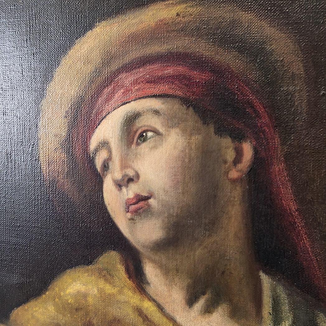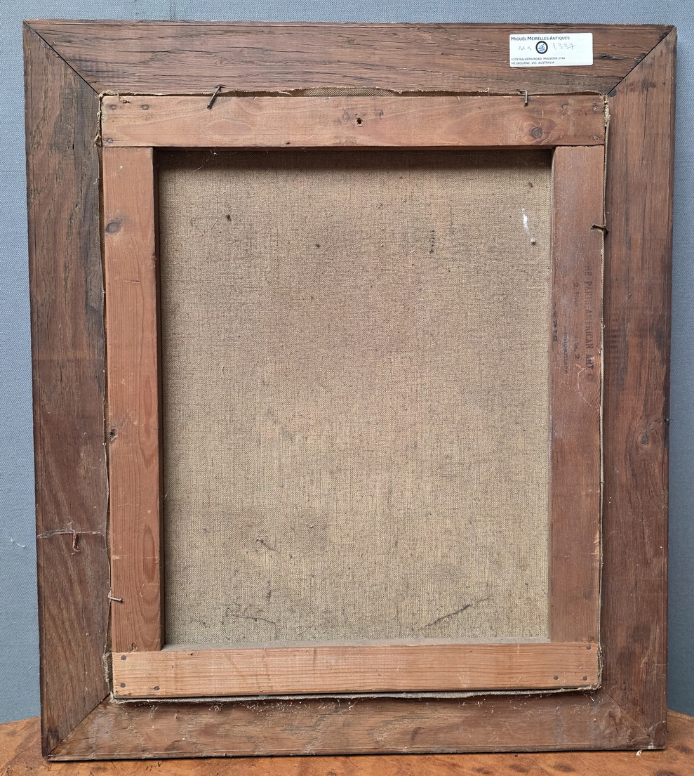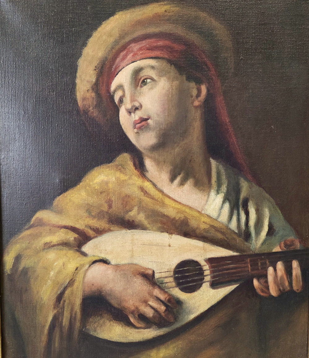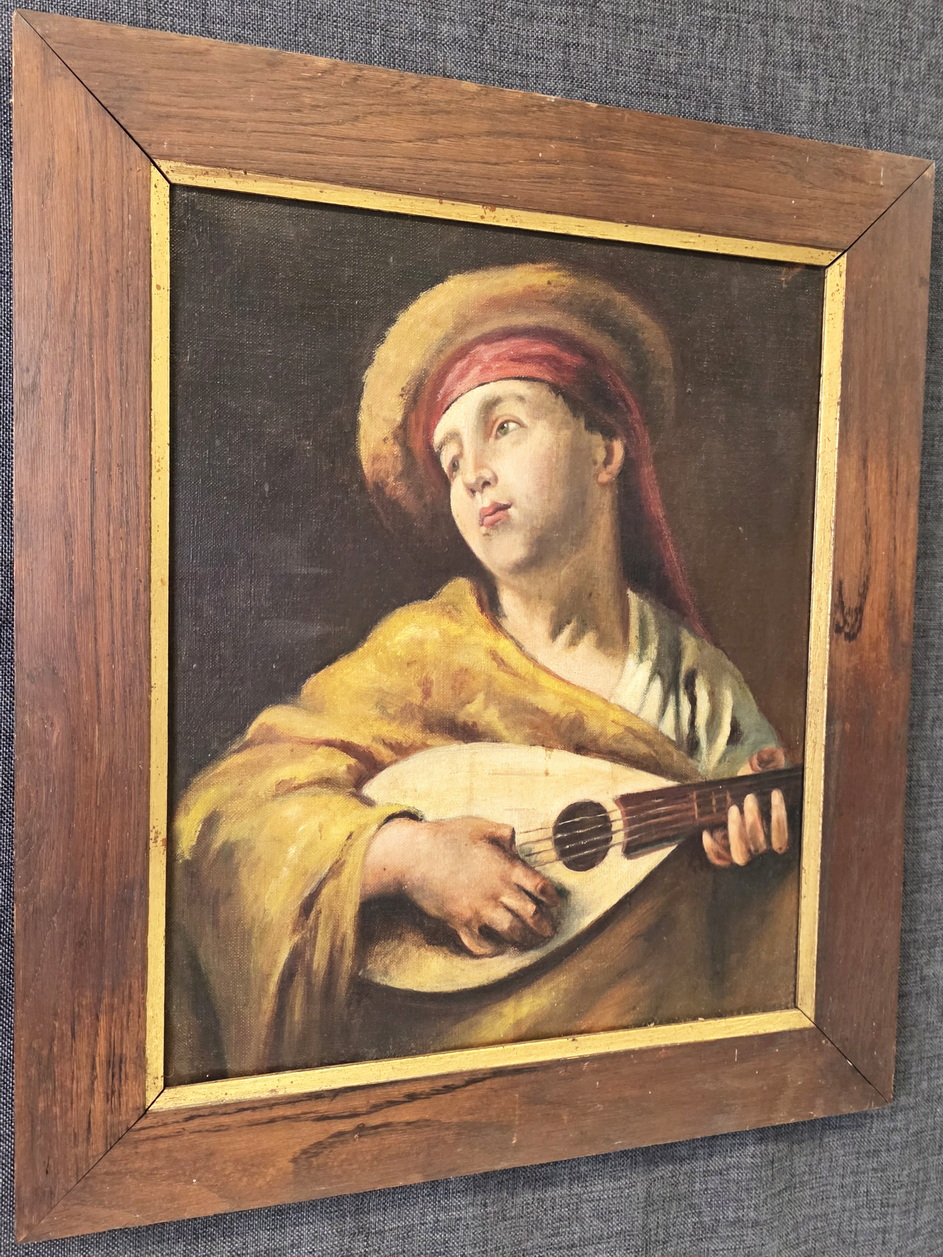 A French oil on canvas painting depicting a lute player dressed in Renaissance style clothing. Fitted into its original oak and parcel gilt frame. Area of Greater Paris, circa 1900.