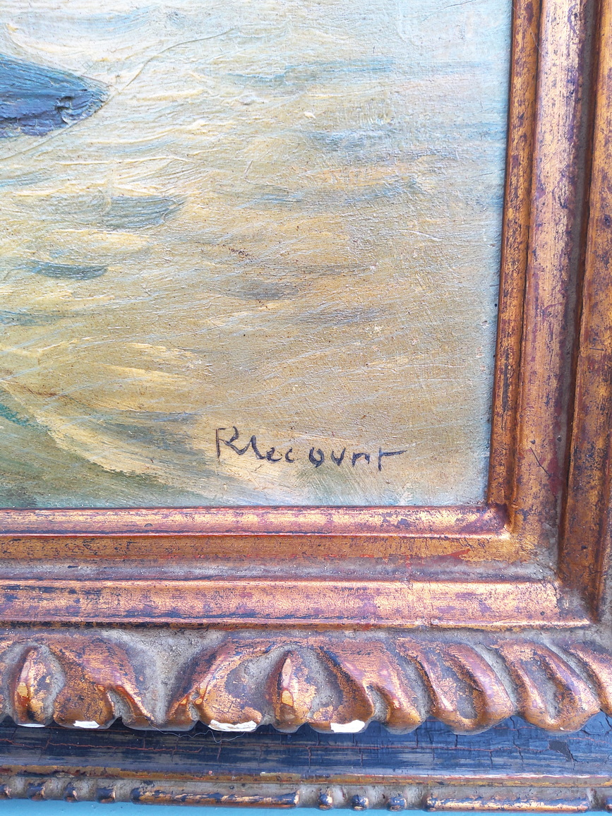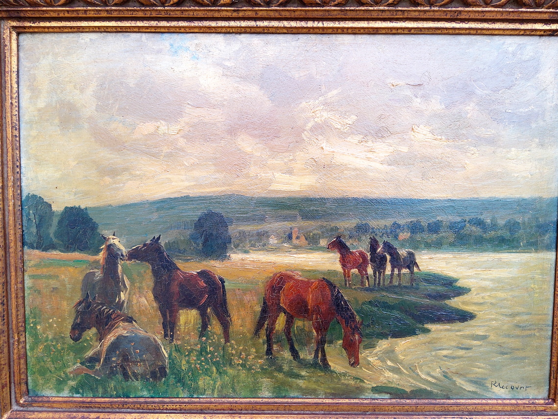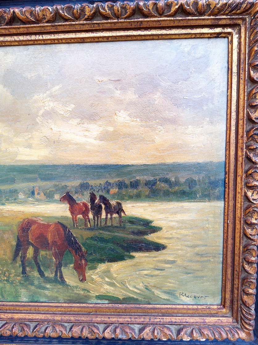 A large, French oil on board framed landscape painting depicting agricultural fields, a group of horses in the foreground. Signed at the bottom right 'R. Lecourt' (Raymond Louis Lecourt , France 1882-1946). Please note the high quality of the original, carved and gilt frame. Area of Normandy, circa 1930.