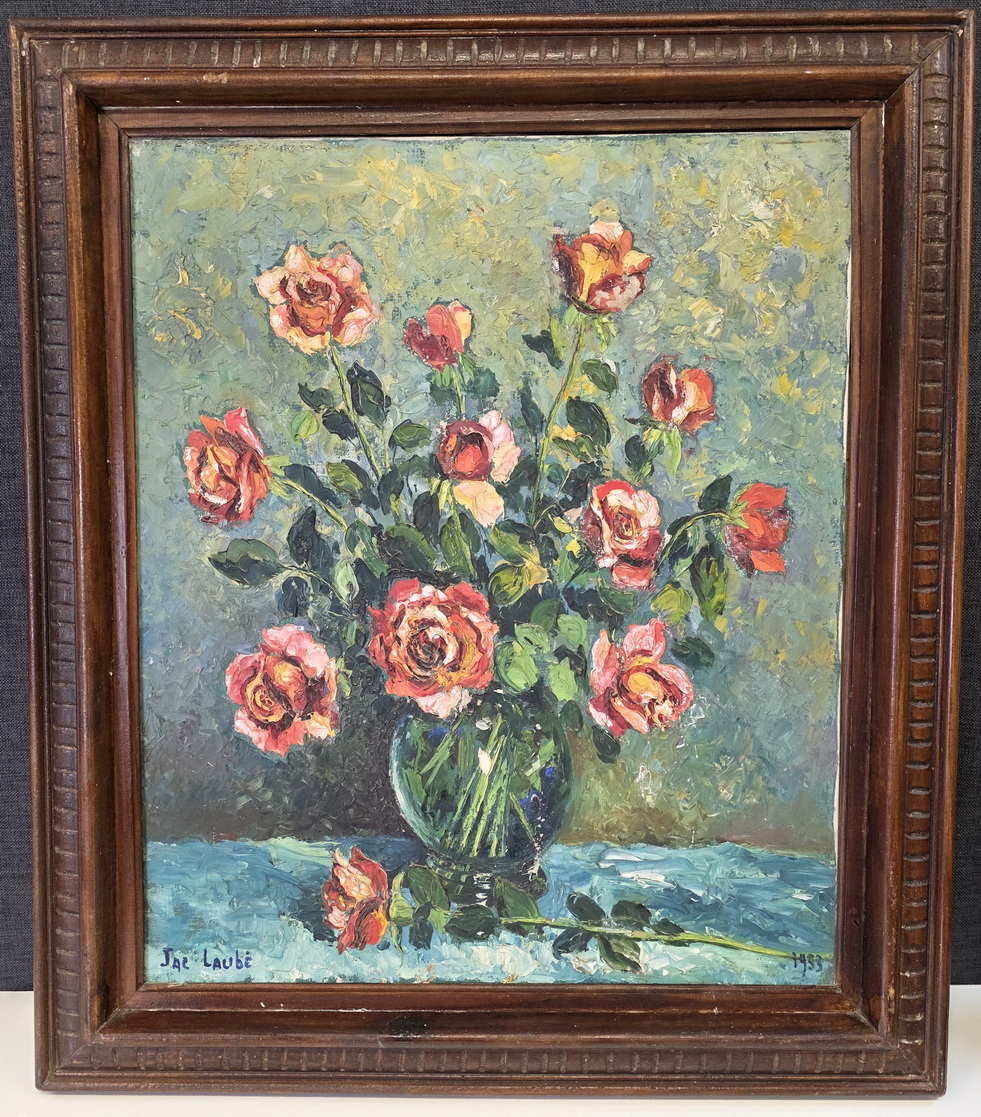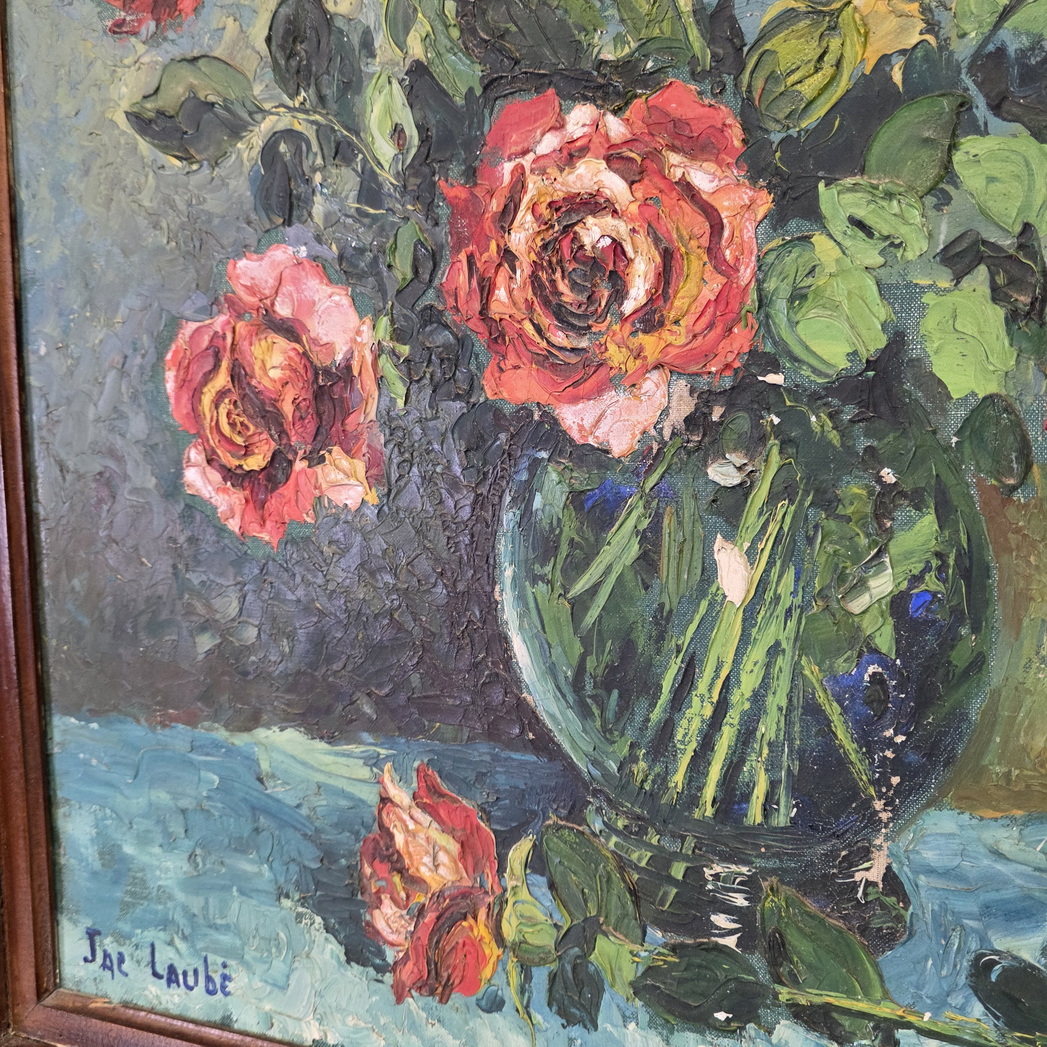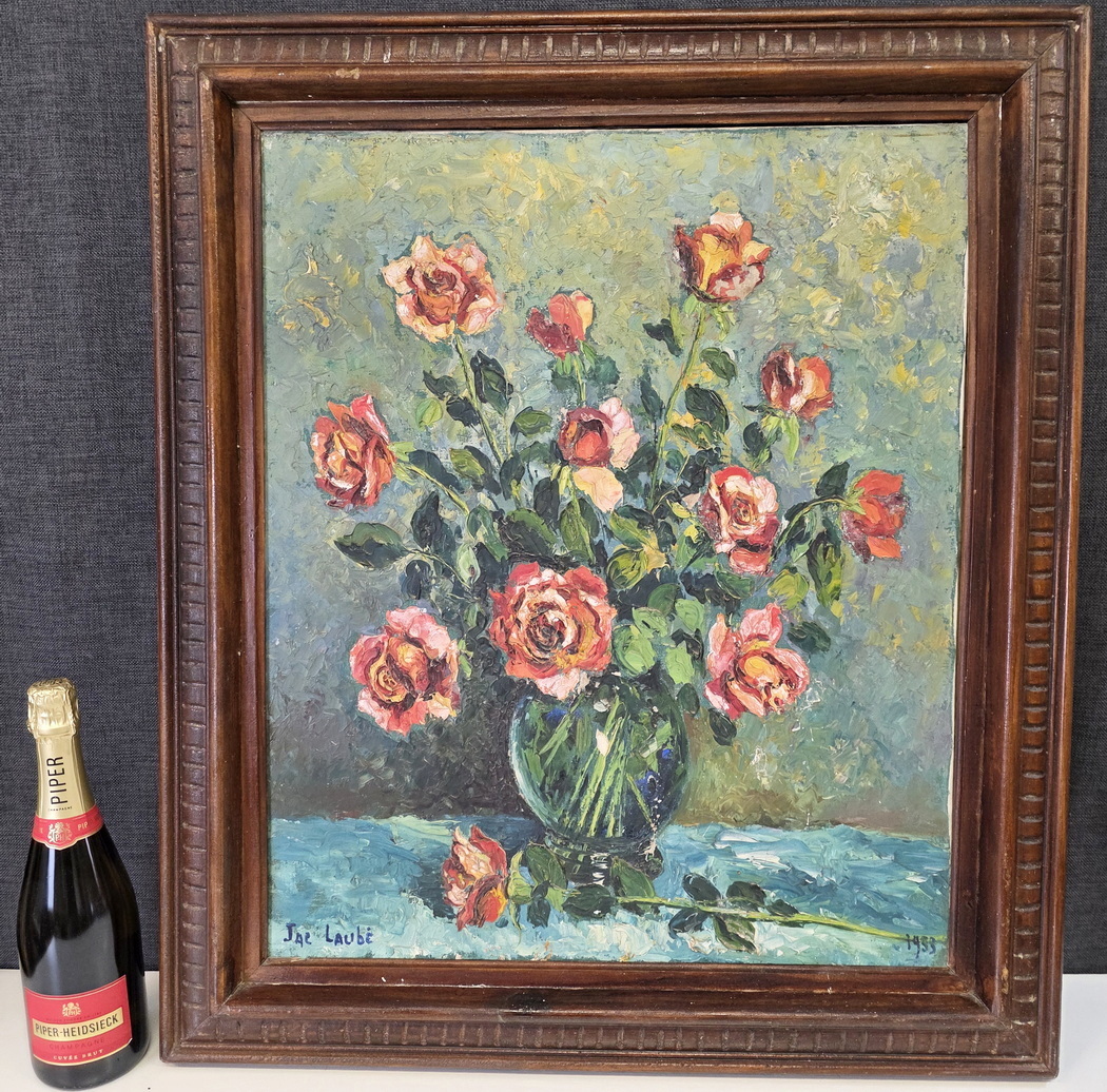 A large, mid 20th century French oil-on-canvas still life of good composition and colour, depicting roses in a glass vase - painted on an unprimed canvas, using a spatula. Retaining the original vintage frame. Signed on the lower left-hand corner "Jac Laubé" (born in Paris in 1904). Area of Paris, dated 1953.