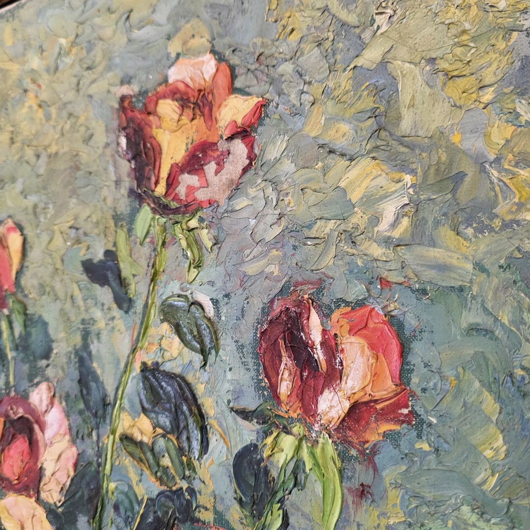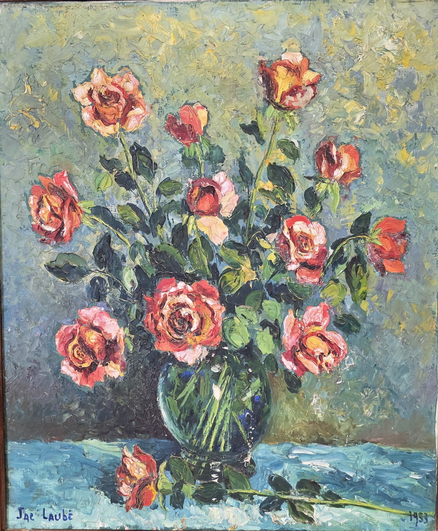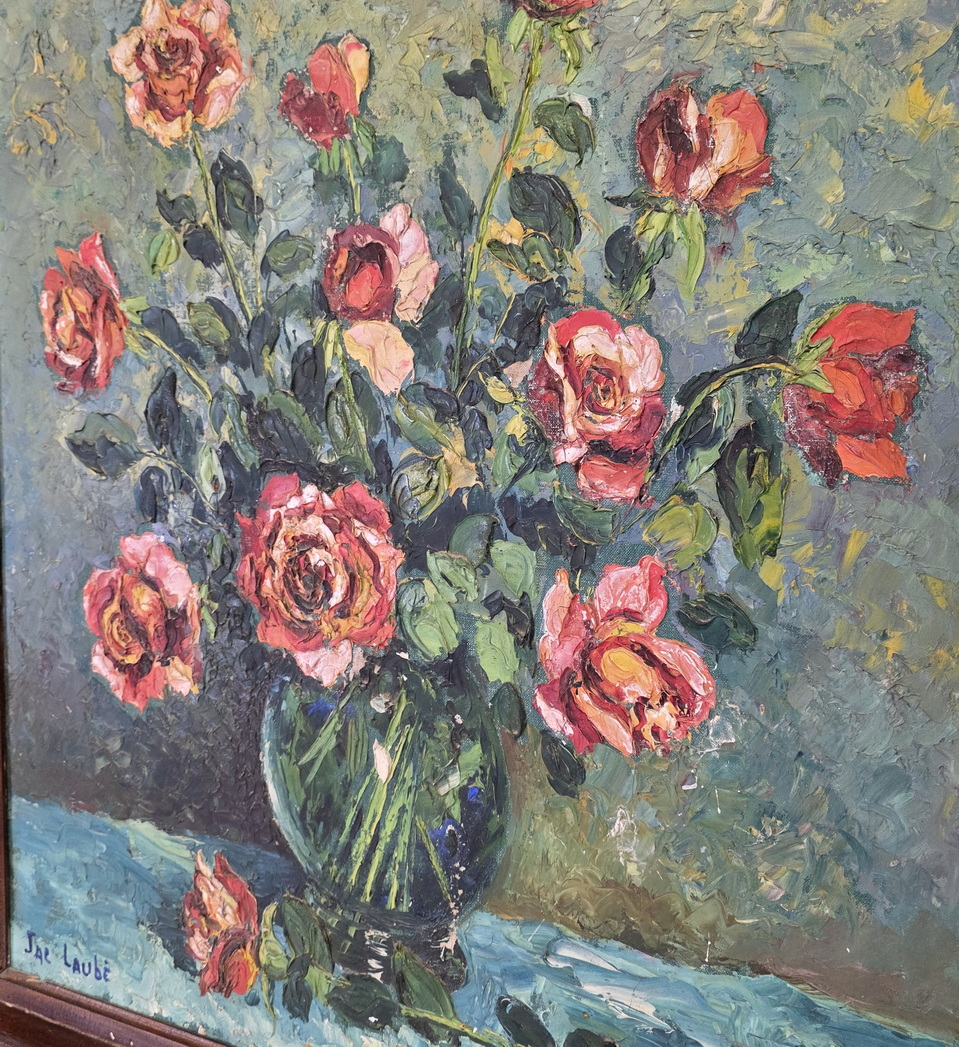 A large, mid 20th century French oil-on-canvas still life of good composition and colour, depicting roses in a glass vase - painted on an unprimed canvas, using a spatula. Retaining the original vintage frame. Signed on the lower left-hand corner "Jac Laubé" (born in Paris in 1904). Area of Paris, dated 1953.