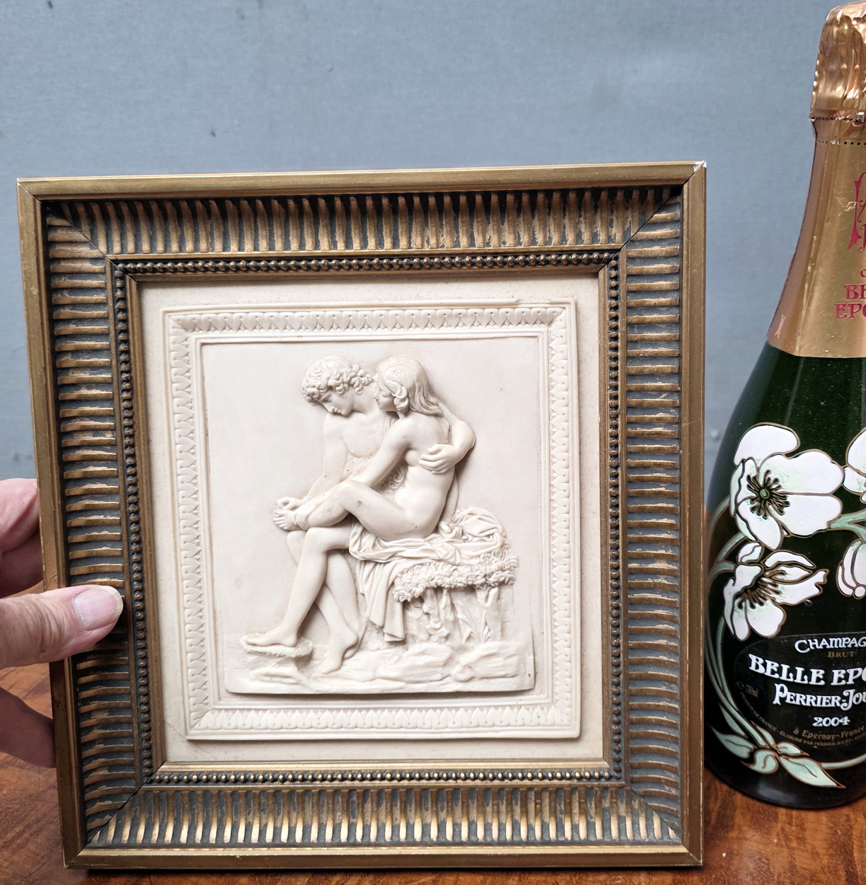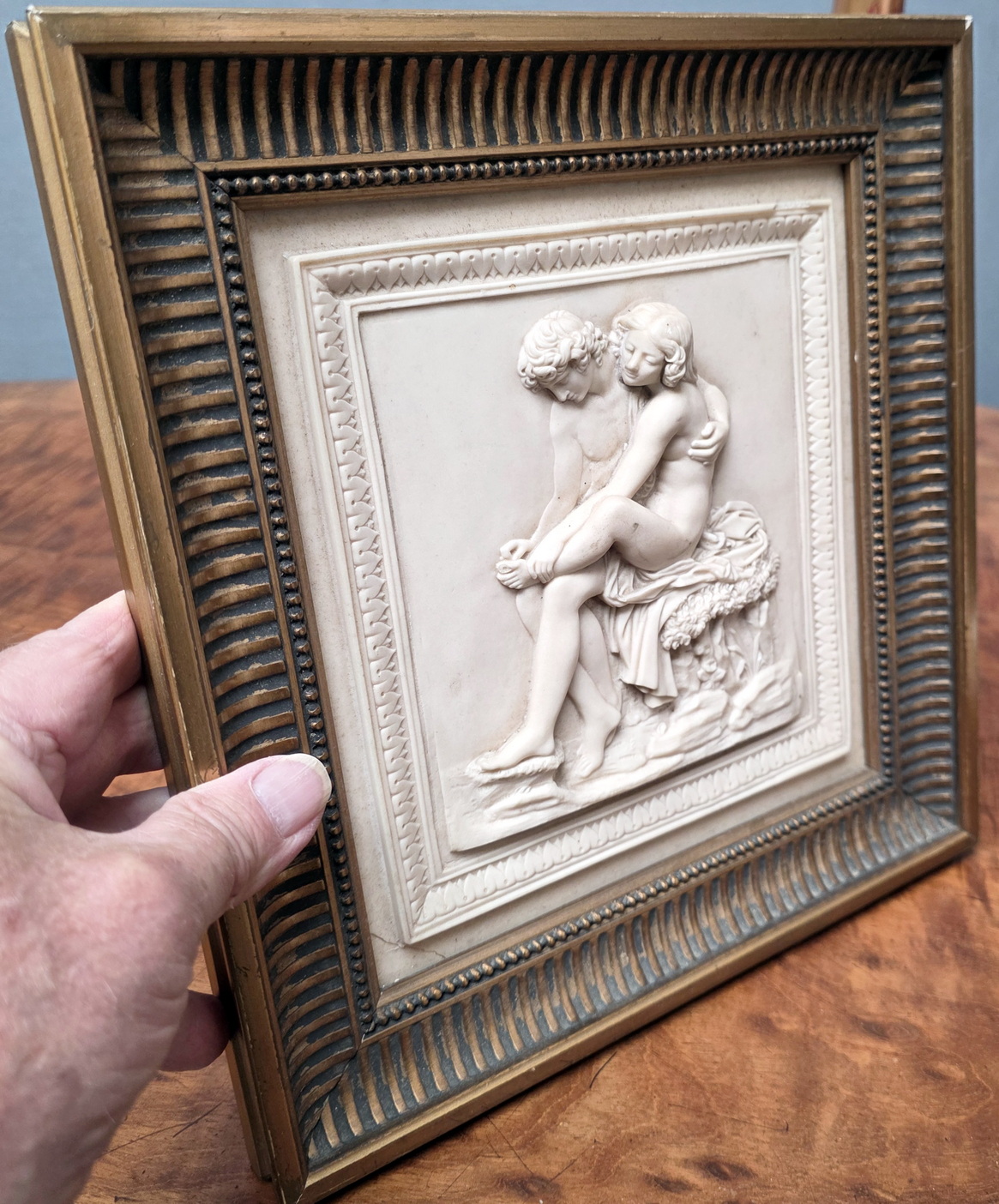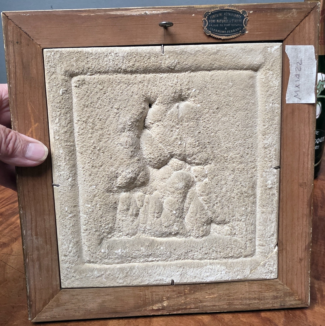An early 20th century French Neoclassical wall plaque depicting Daphnis and Chloe in a tender embrace, Daphnis gently removing a thorn from her foot. This plaque is hand carved from limestone and the rear shows the original calcium carbonate taken from a cave in the St. Alyre region - as states the label at the rear of the original carved and gilt frame. Area of Clermont-Ferrand, circa 1930.