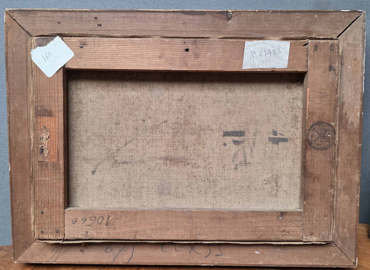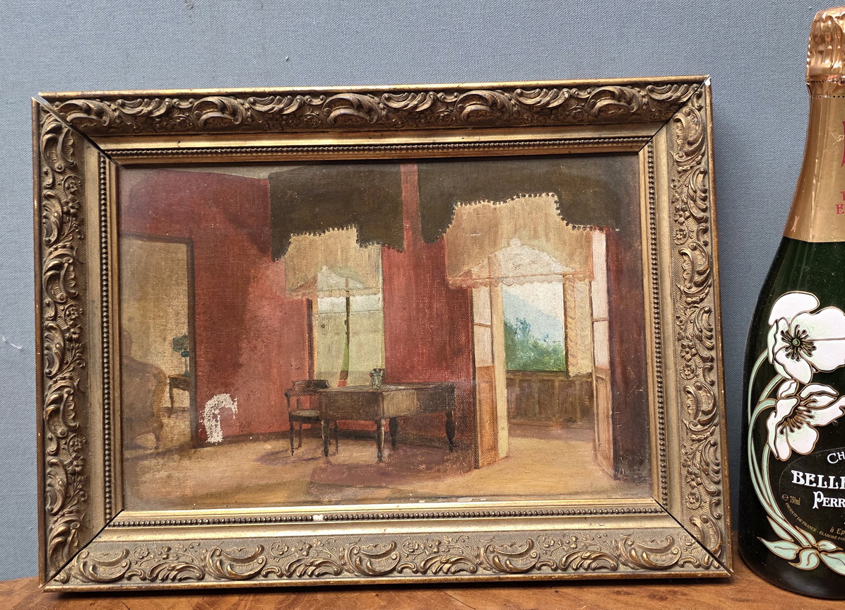 A French oil on canvas interior scene depicting a studio room decorated with a Louis Philippe period desk and armchair, the background with elegant curtains and windows looking out to a sunny garden. Framed in its original gilt pastille work frame. Area of Paris, circa 1900.
