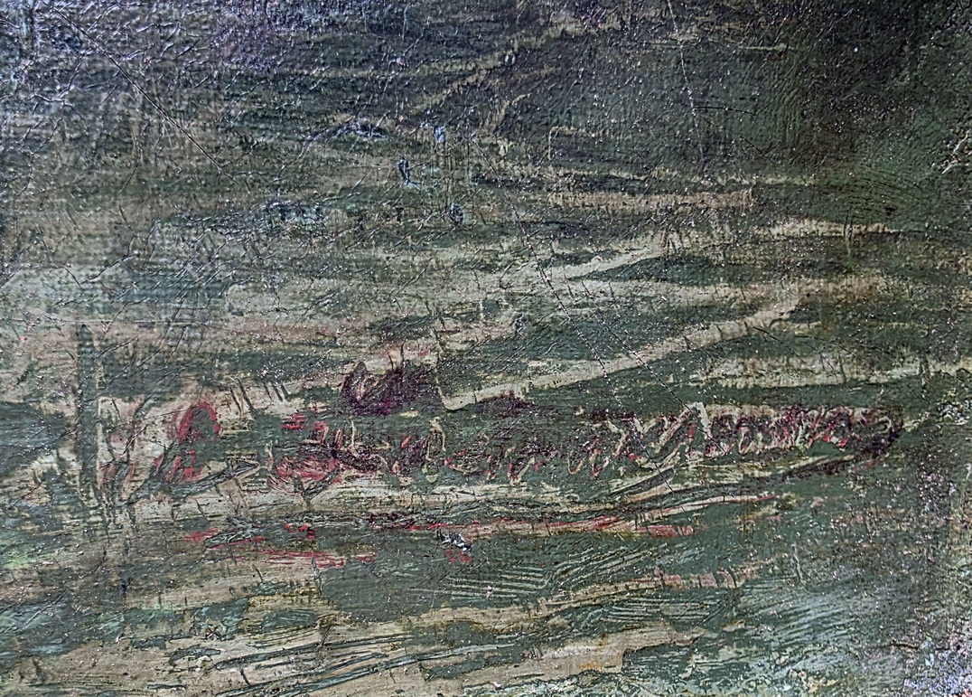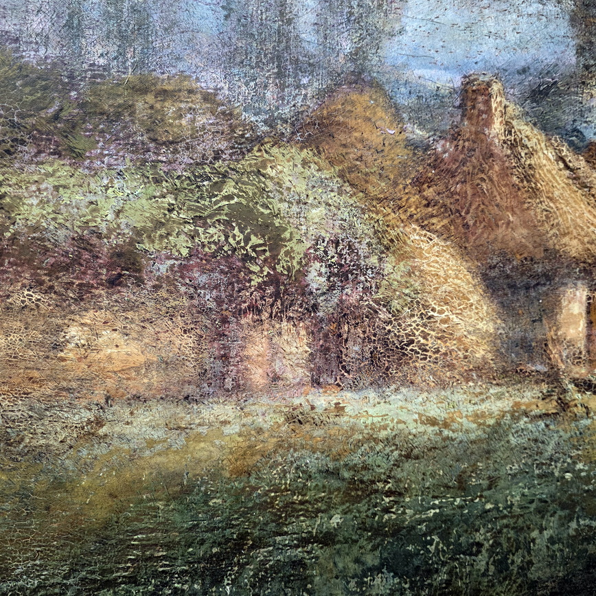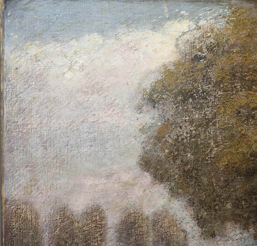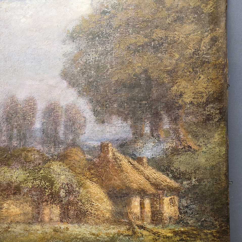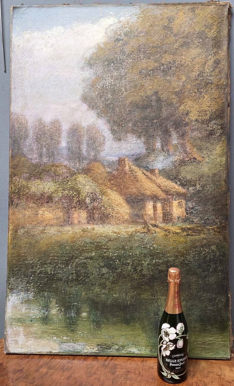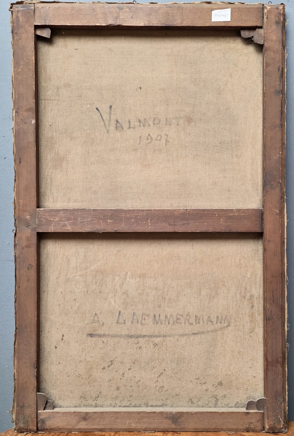 A French oil on canvas landscape painting depicting Normandy cottages, a pond featured in the foreground. The rear with a handwritten location note for this painting: "Valmont", a village in Normandy. Signed on the bottom-right and at the rear "A. Laemmermann". Area of Normandy, circa 1907.