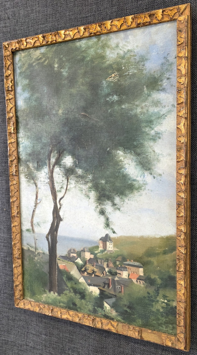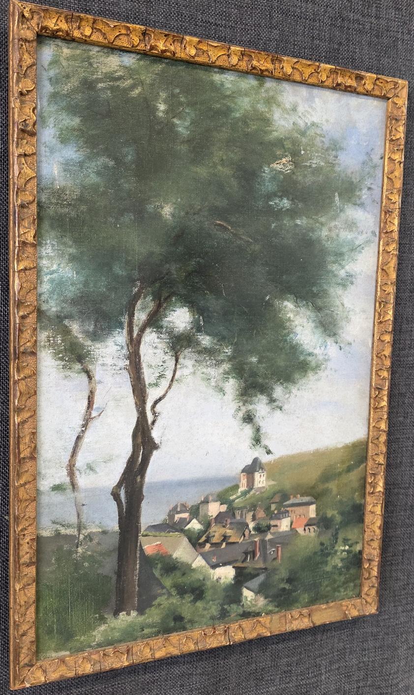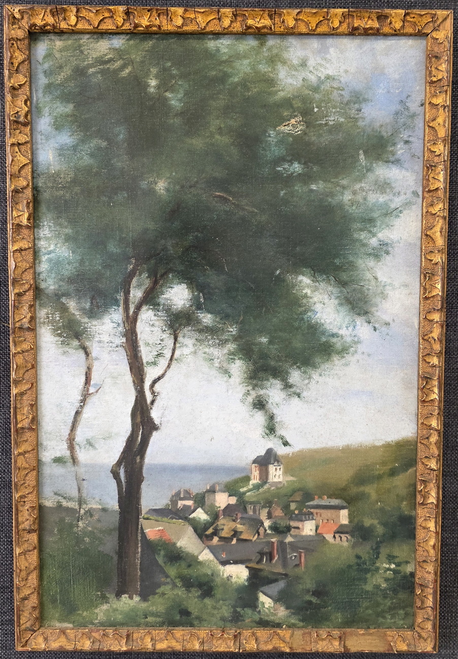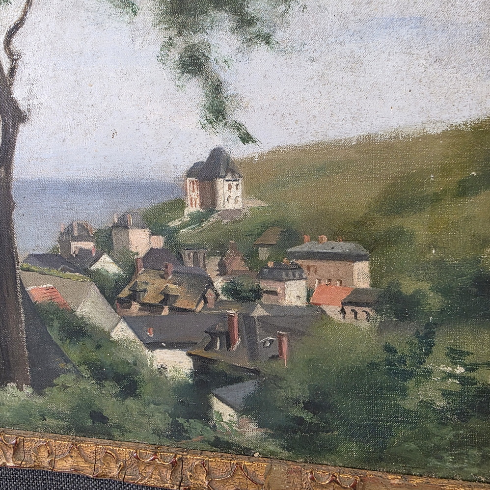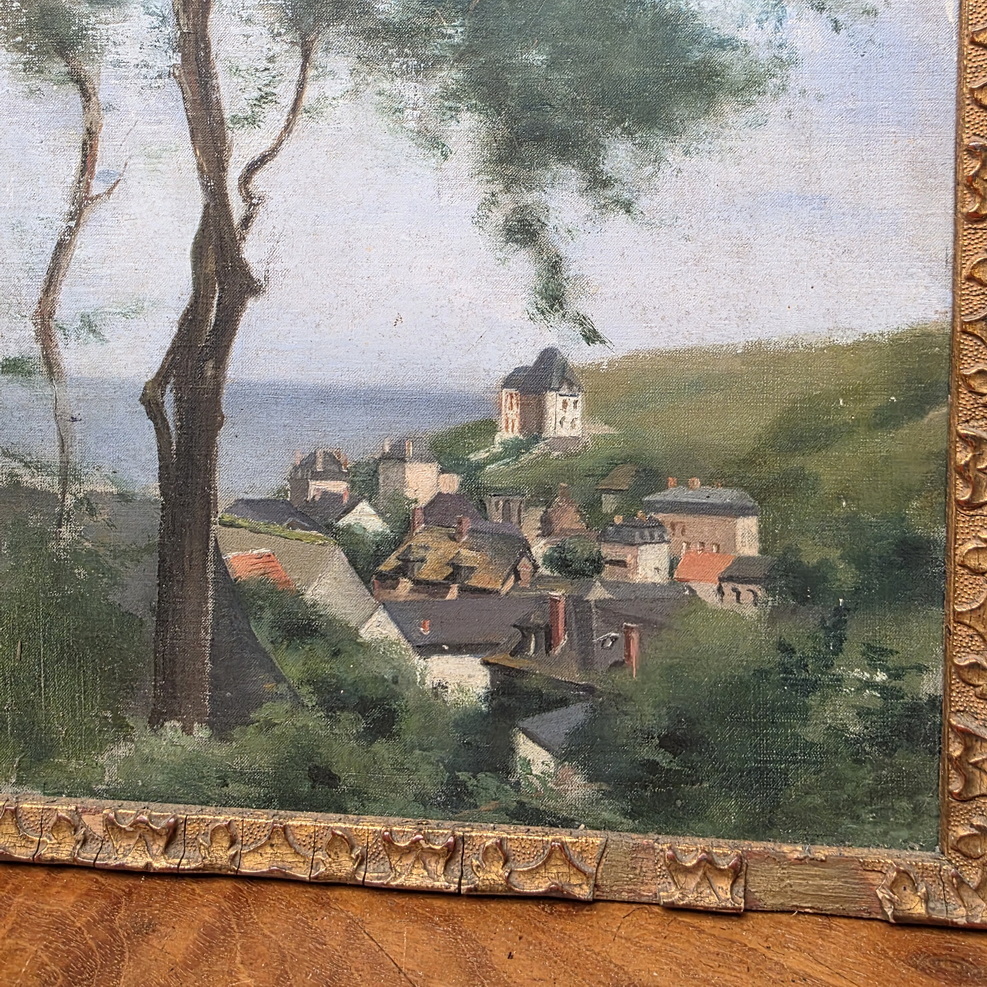 A French landscape depicting tall trees against a blue sky, a French village and the sea in the background. This 'plein air' oil on canvas painting is fitted into its original carved and gilded frame. The rear inscribed with "St. Pierre Vieville". France, circa 1880.