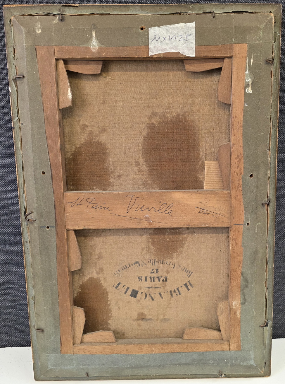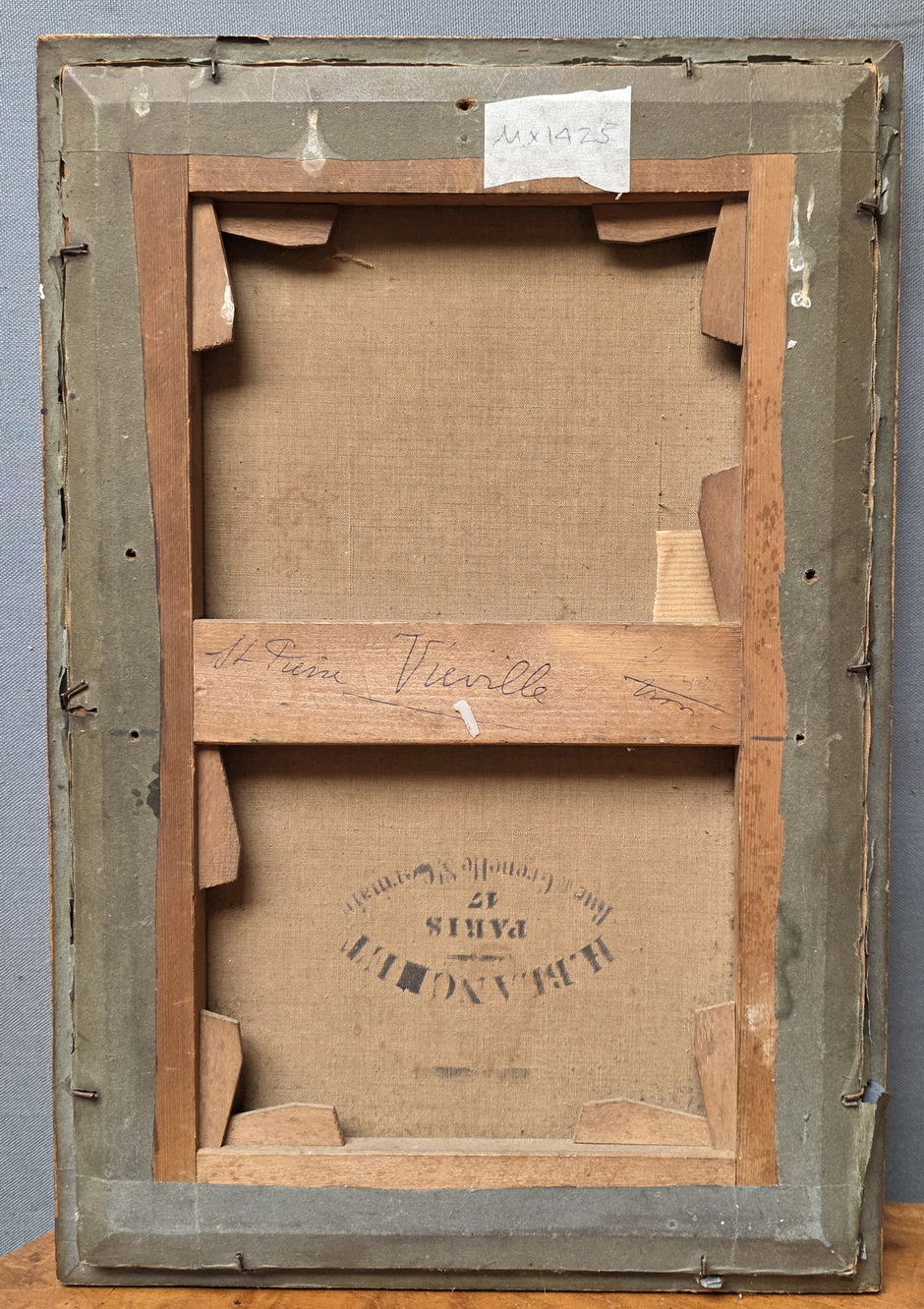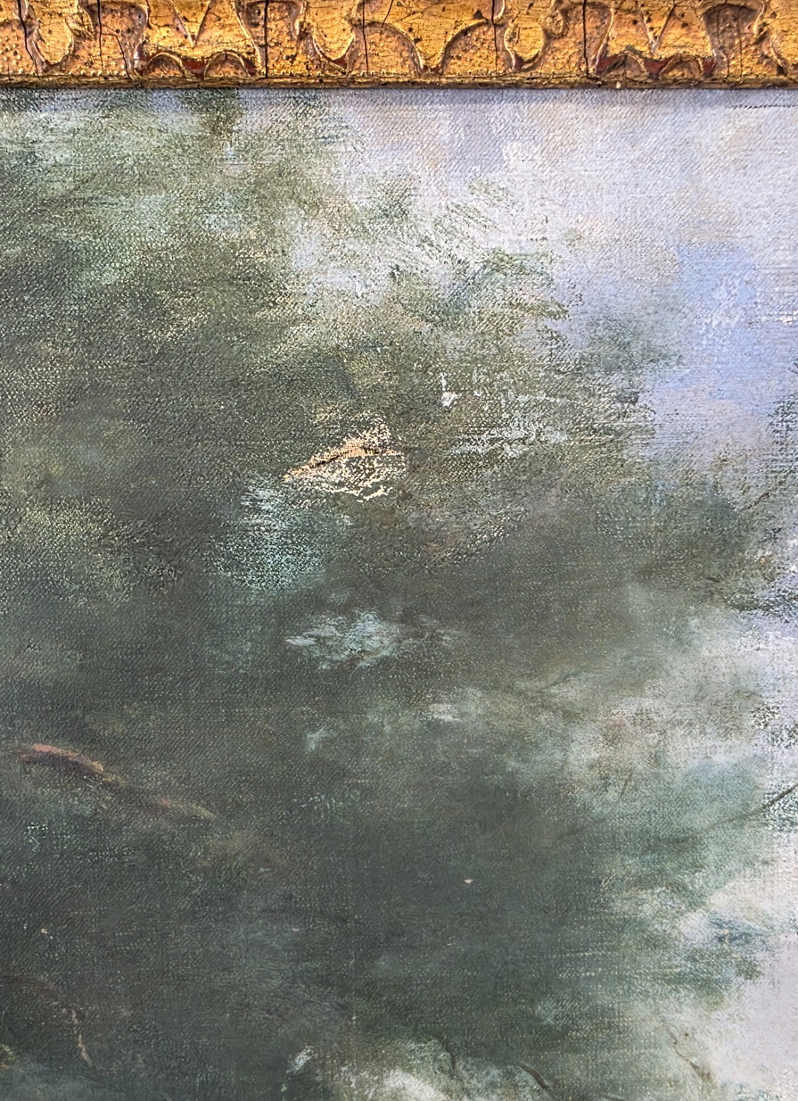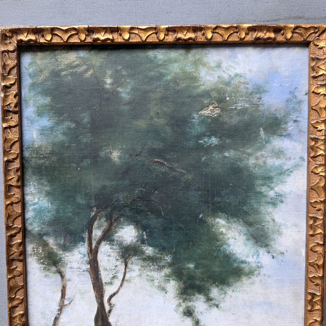 A French landscape depicting tall trees against a blue sky, a French village and the sea in the background. This 'plein air' oil on canvas painting is fitted into its original carved and gilded frame. The rear inscribed with "St. Pierre Vieville". France, circa 1880.
