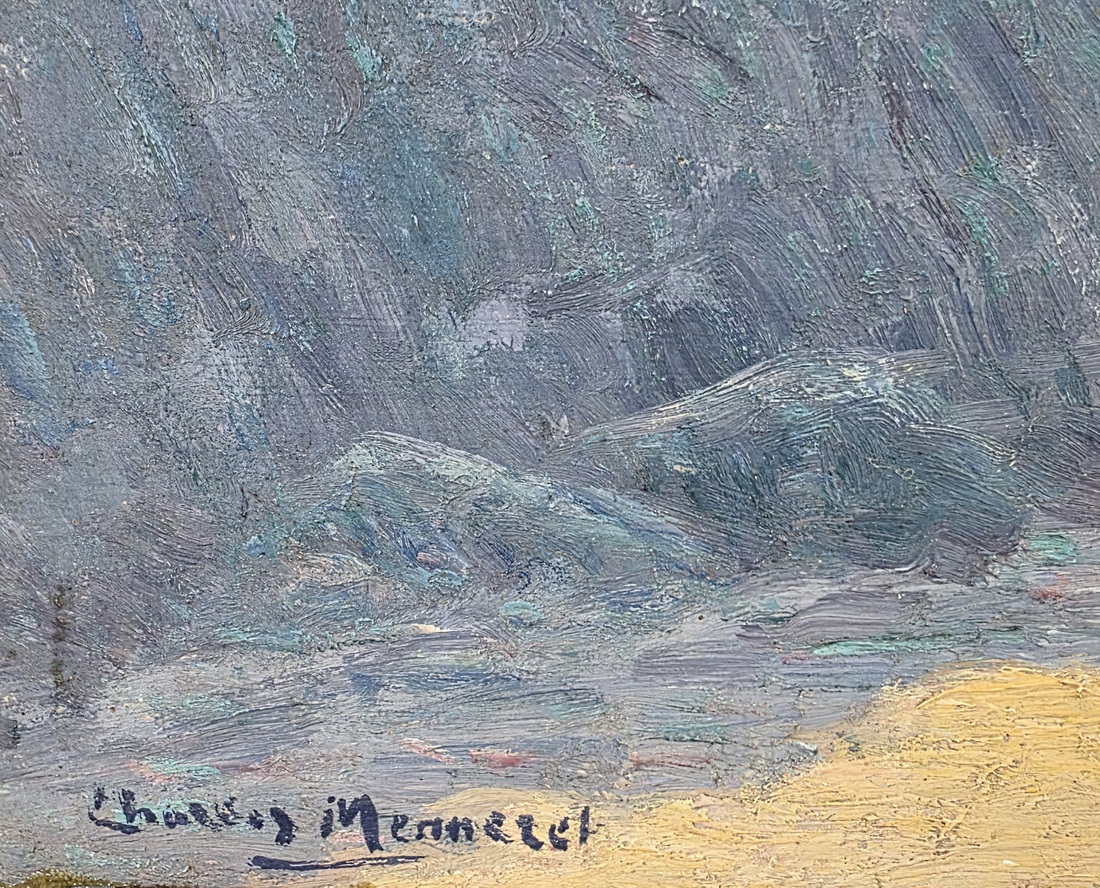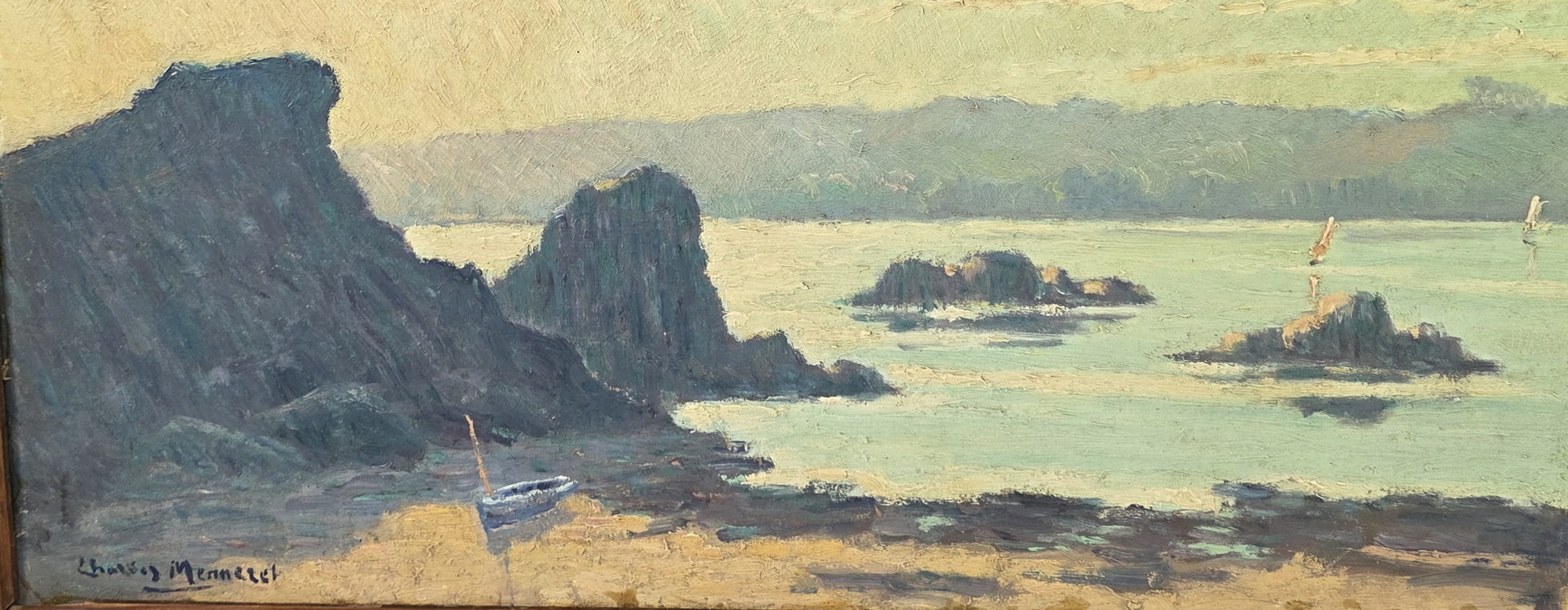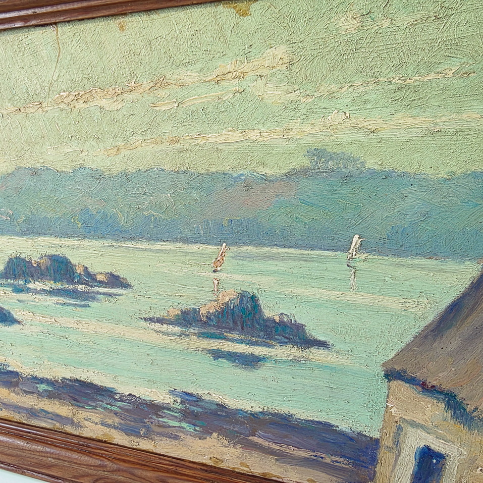 A French oil on board painting of a Brittany seascape, with thatch roofed cottages looking out to a bay. Please note the luminous quality of this painting. Retaining its original frame, needing repairs. Signed on the bottom-left corner Charles Menneret, (France 1876-1946).