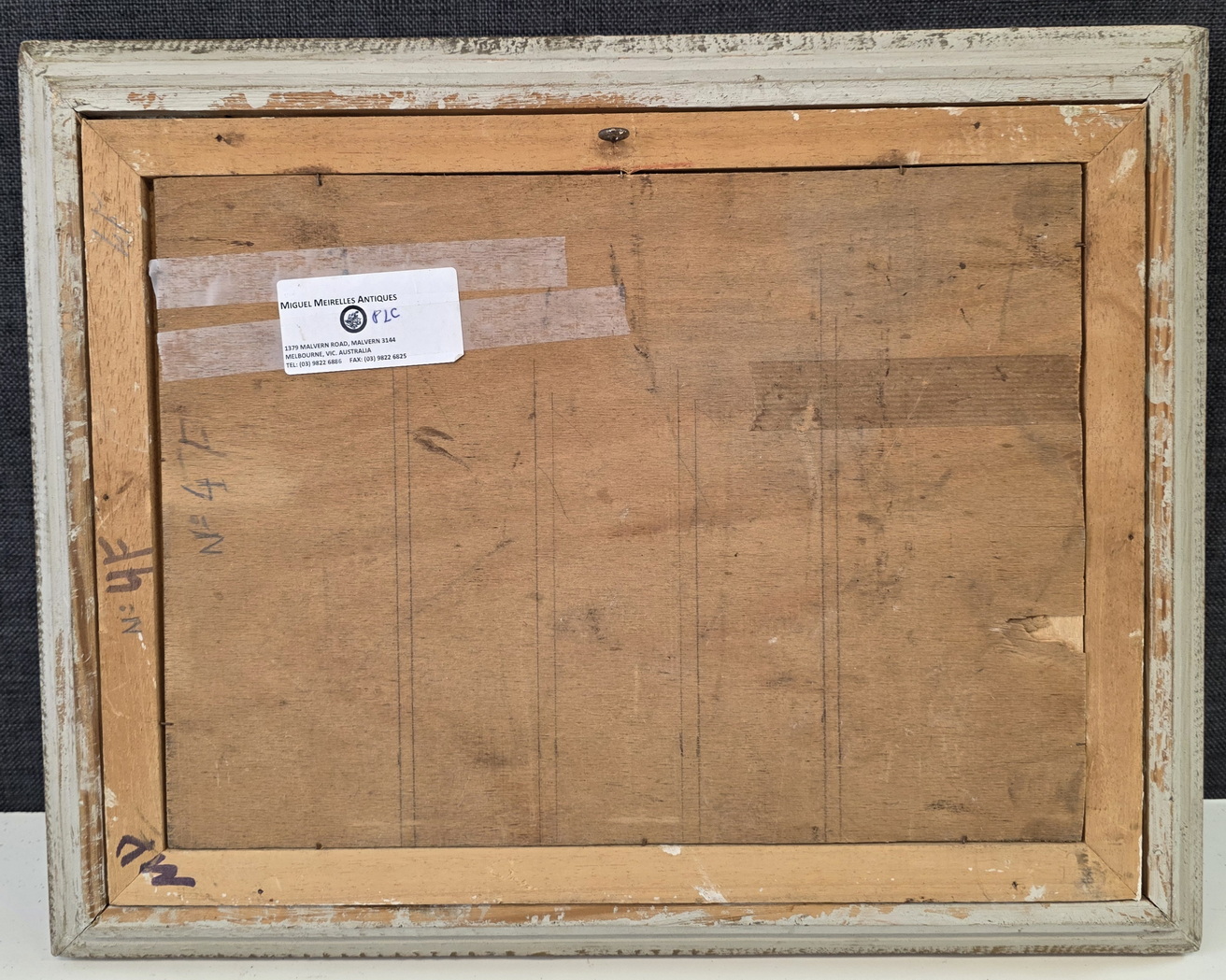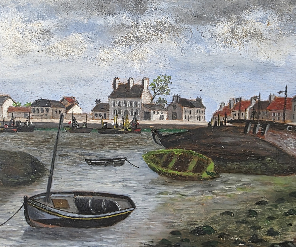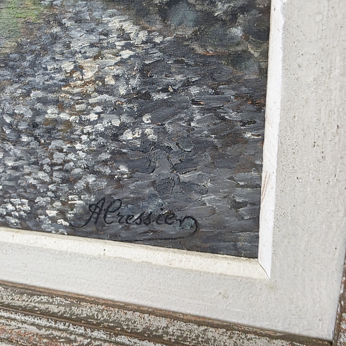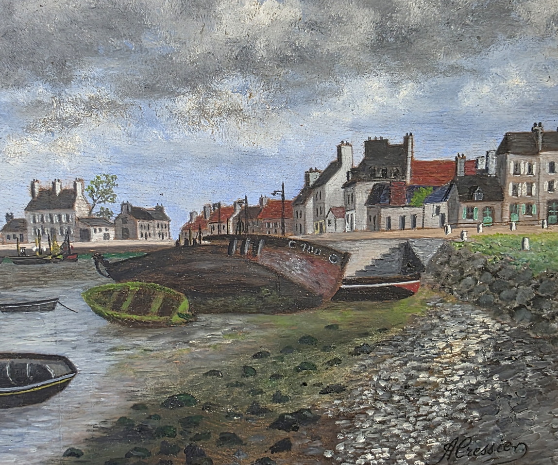 A French oil on board landscape painting depicting a beach at low tide, a coastal village in the background. Retaining its original, painted frame. Signed on the bottom-right corner "A. Cressier". France, circa 1960.