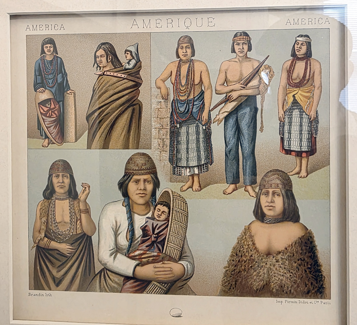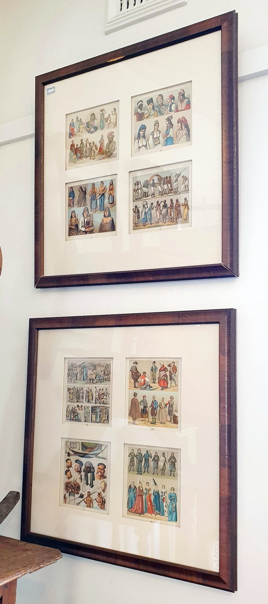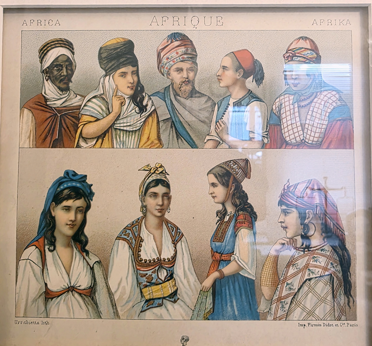 A lot of eight 19th century French coloured lithographs depicting people's historical costumes from around the world, most wearing typical and traditional dress styles. Grouped in sets of four lithographs, set mounts and framed. The lithographs are labelled in French, English and and in German and are signed by different artists. All were made by famous Parisian print maker 'Firmin Didot et Cie'. Area of Paris, circa 1890.
