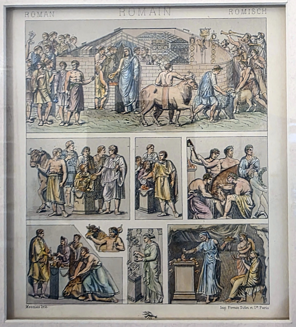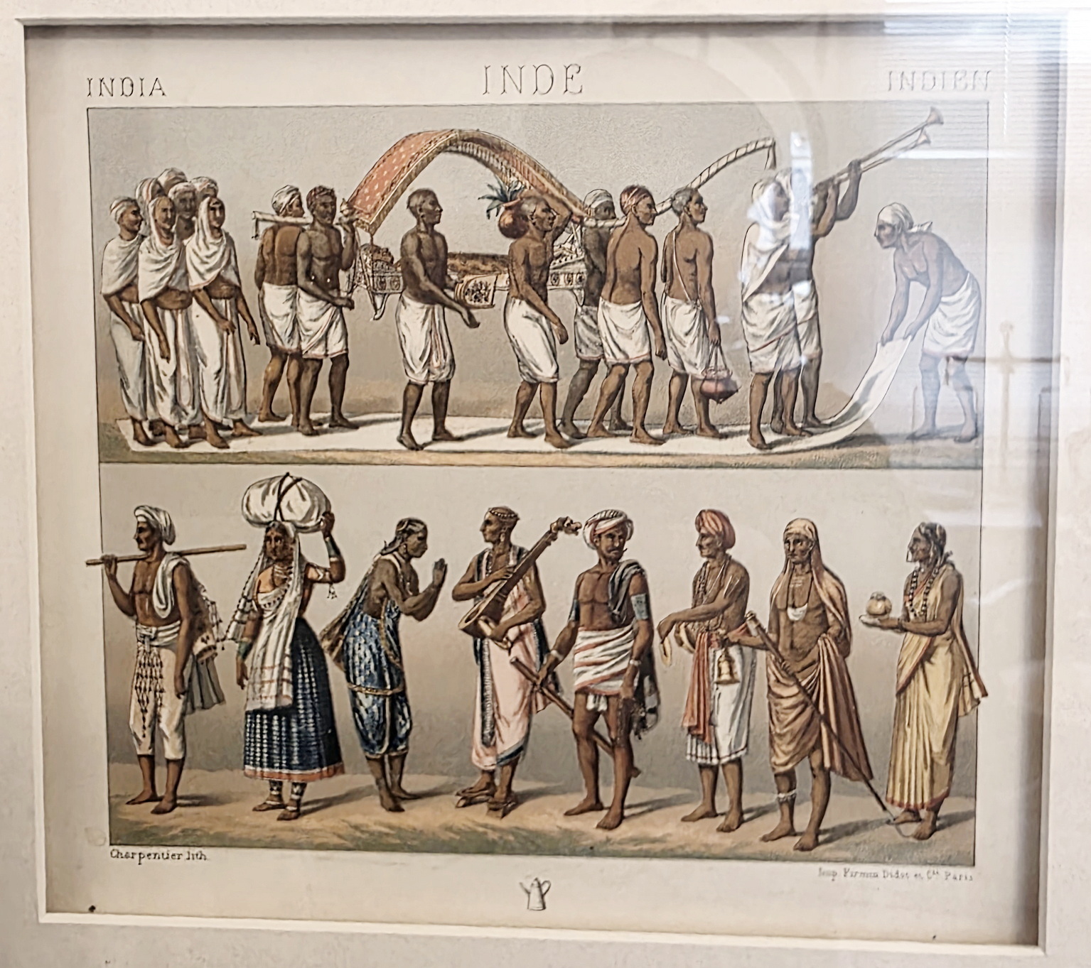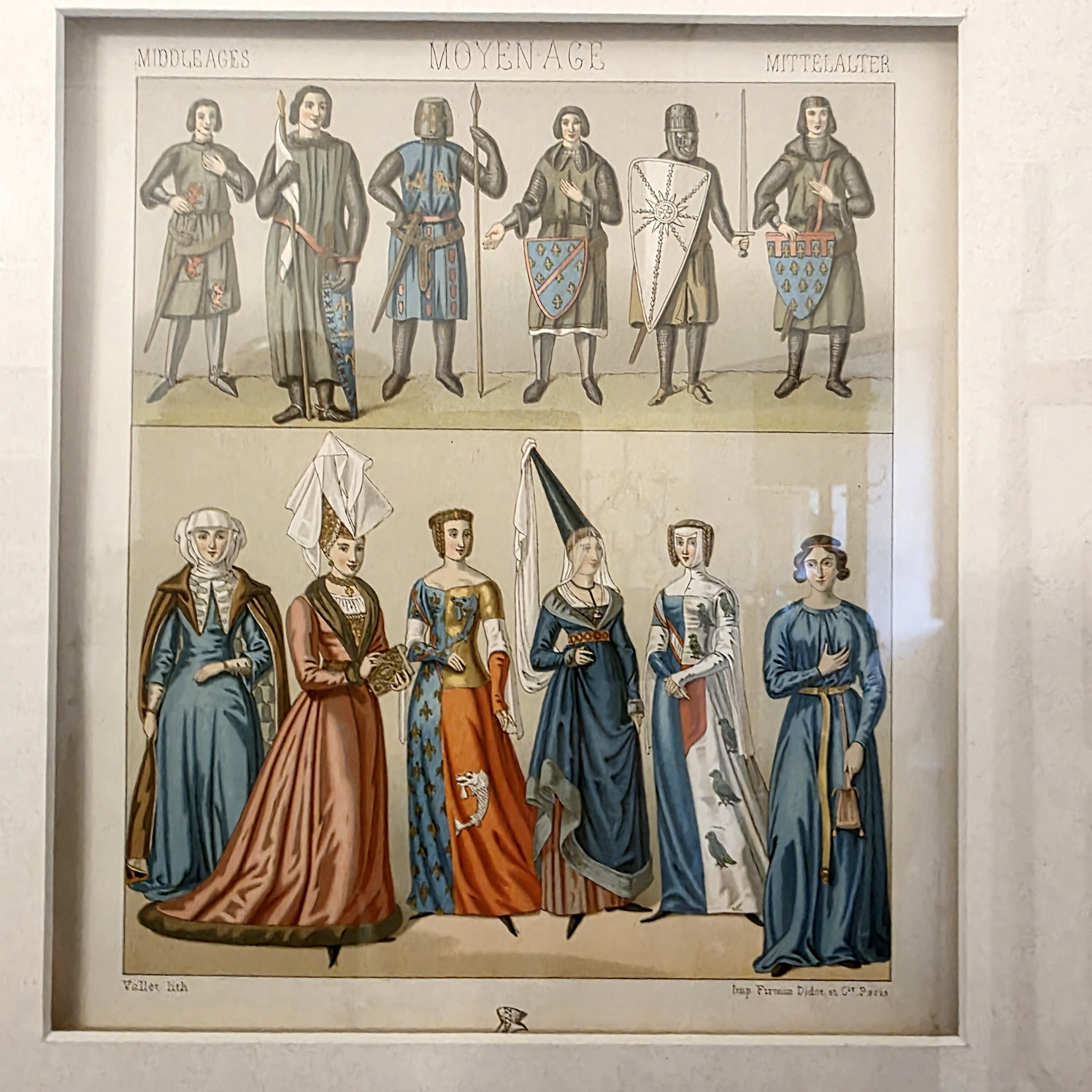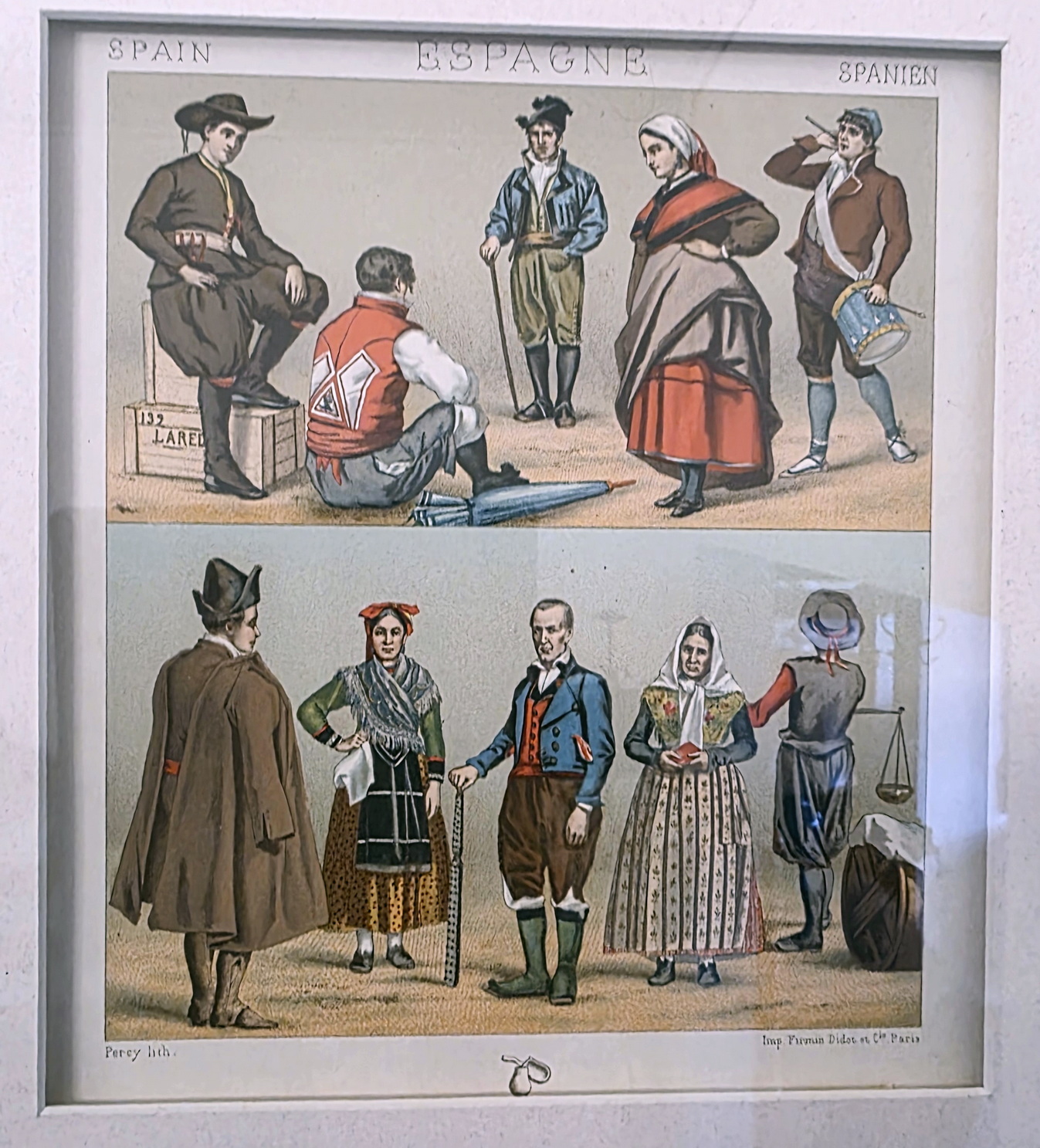 A lot of eight 19th century French coloured lithographs depicting people's historical costumes from around the world, most wearing typical and traditional dress styles. Grouped in sets of four lithographs, set mounts and framed. The lithographs are labelled in French, English and and in German and are signed by different artists. All were made by famous Parisian print maker 'Firmin Didot et Cie'. Area of Paris, circa 1890.
