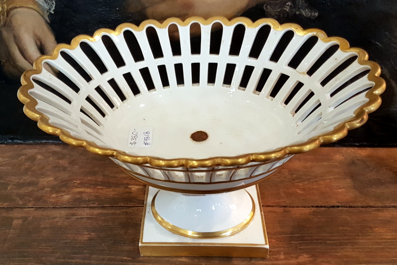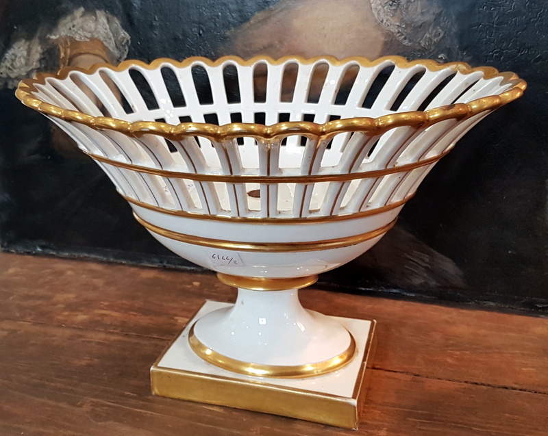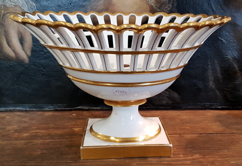 In good and un-restored condition. A small and old repaired crack in the fretted porcelain bowl.