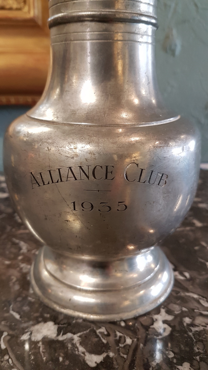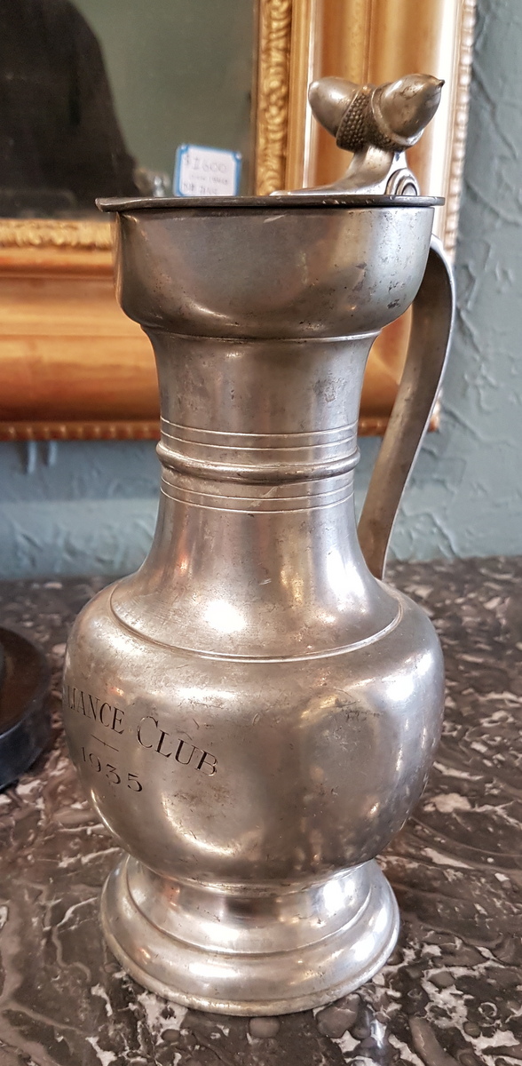 An early 20th century pewter Measuring Jug, the lid decorated with a pair of acorns, the plinth decorated with a simple convex moulding. The front of this jug etched with "Alliance Club 1935". Area of Geneva, circa 1930.
