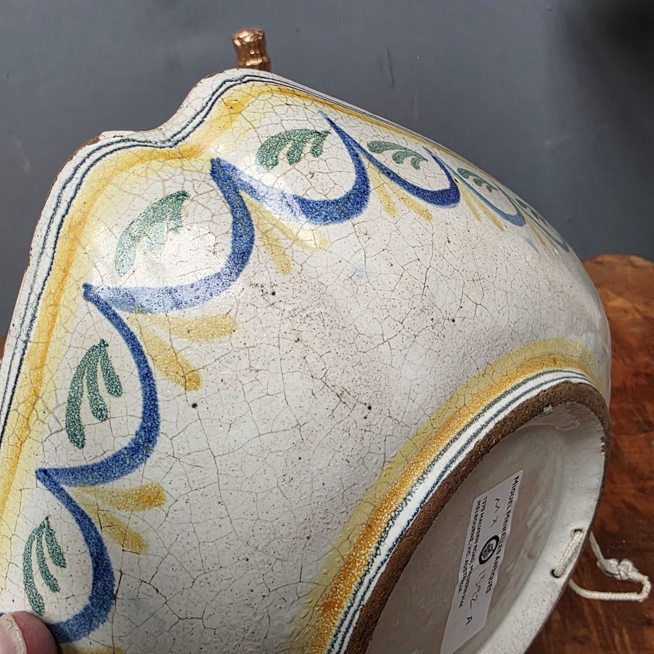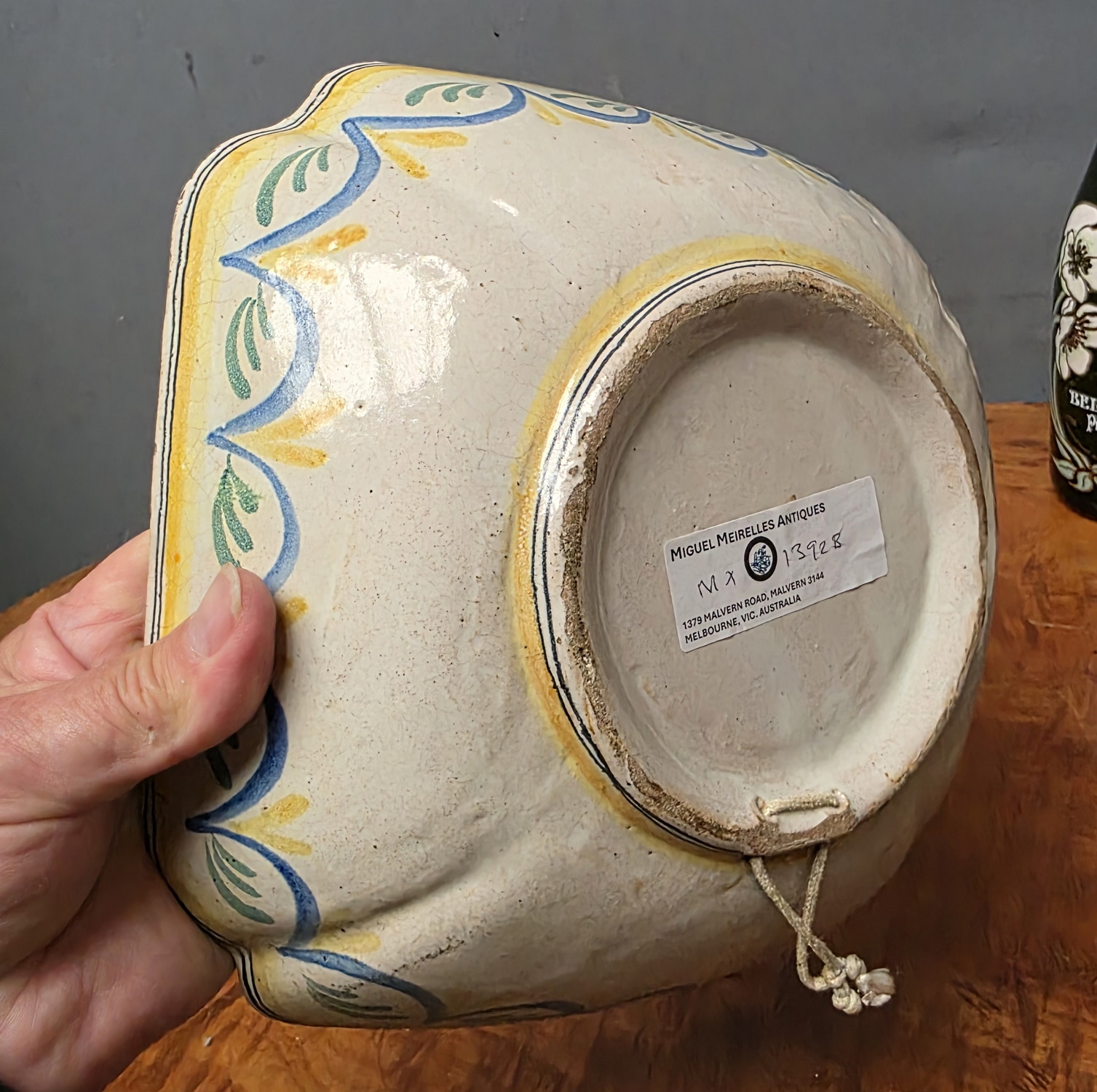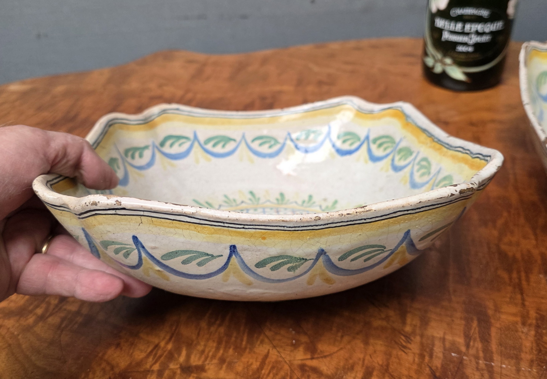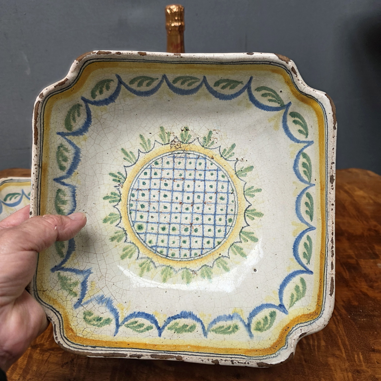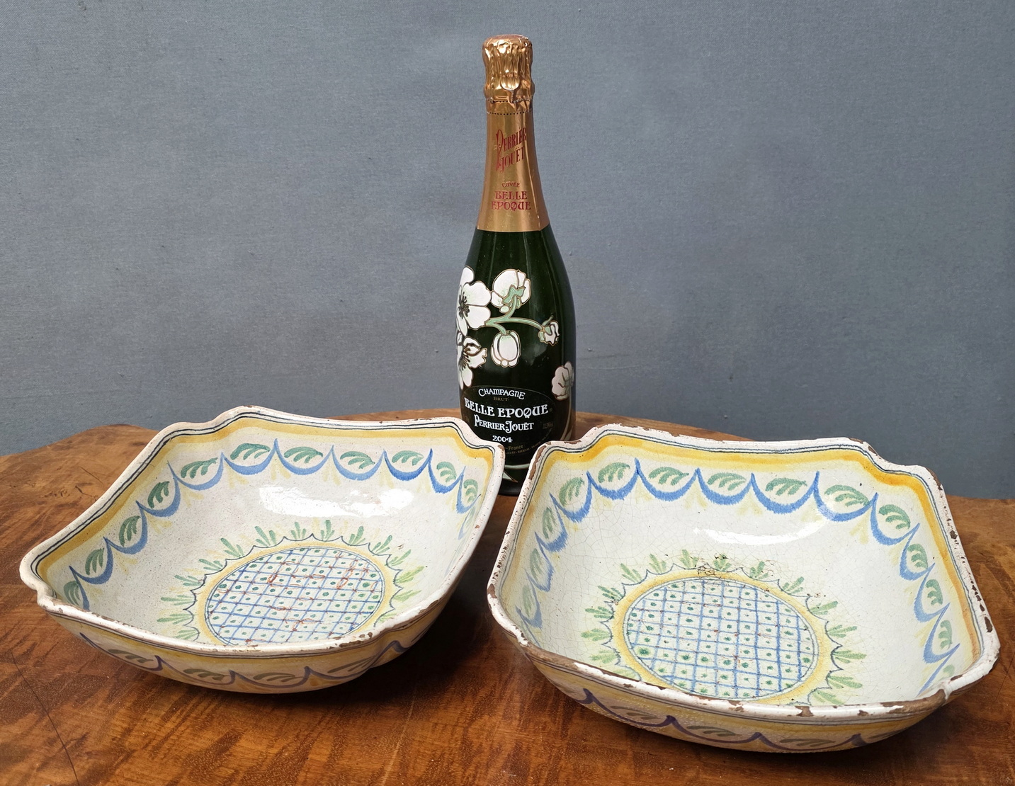 A pair of 18th century French Malicorne faience bowls, the square forms decorated with stylised foliate and geometric motifs, the glaze with wonderful antique crackling. Area of Malicorne-sur-Sarthe, Loire Valley, circa 1780.