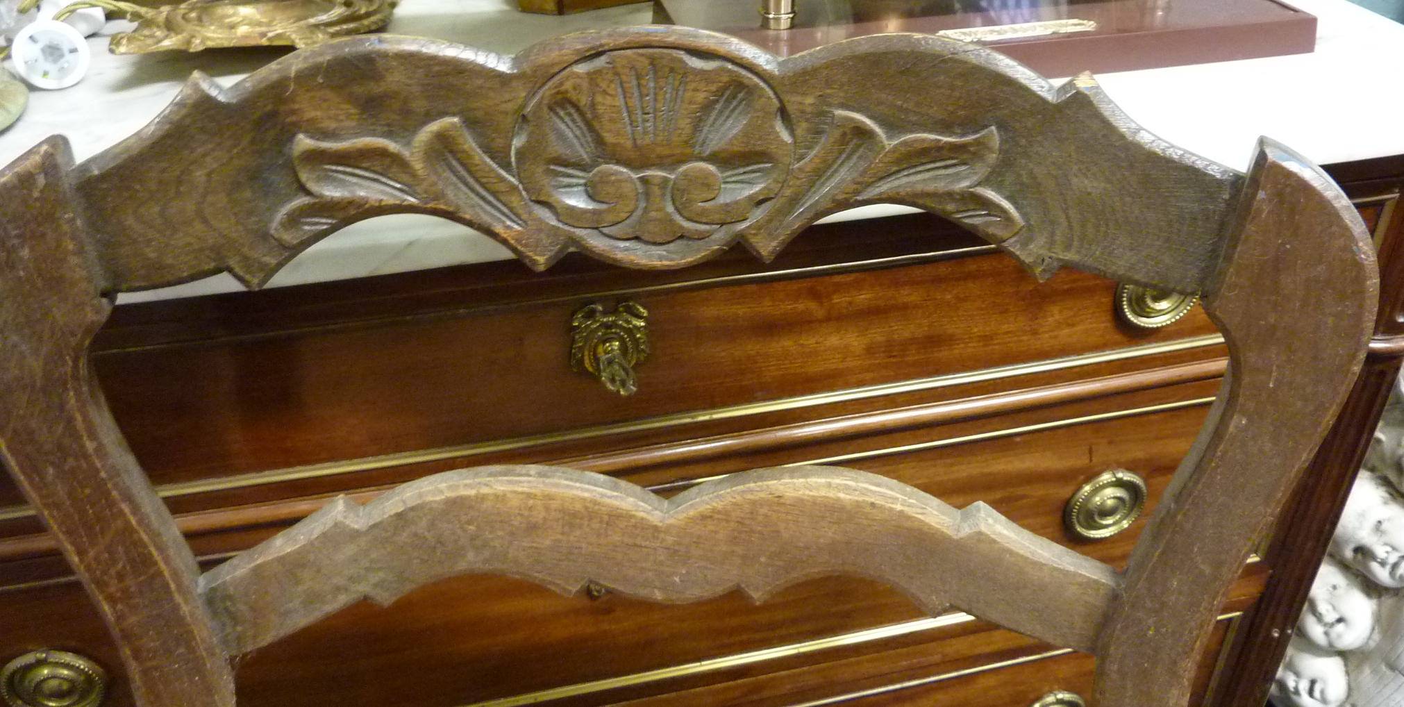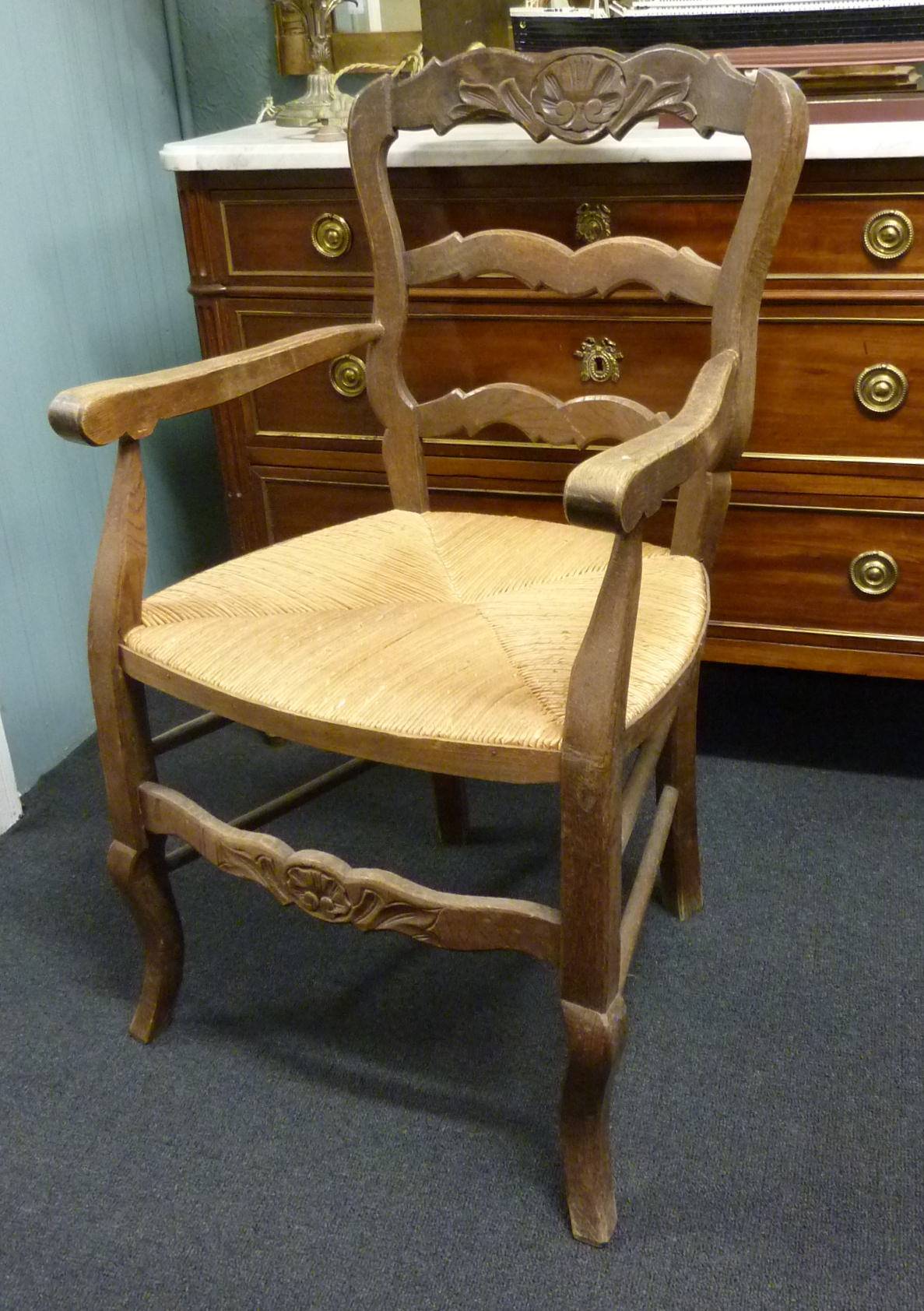 An early 20th century French Provincial rush-seated ladderback armchair of typical Southern French design, the oak timbers carved with shell motifs. Lightweight and comfortable to sit on.