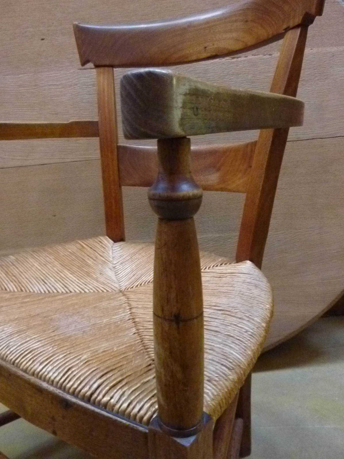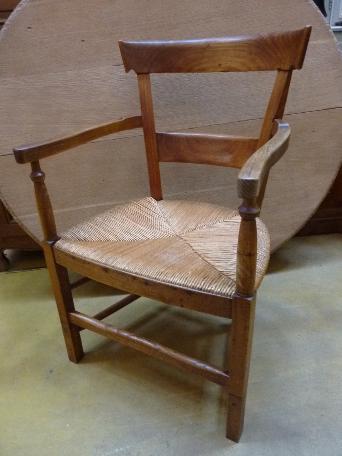 A 19th century French provincial ashwood and cherrywood ladderback armchair, the ample seat with woven rush. Typical provincial-Directoire design from the area of Normandy, circa 1850.