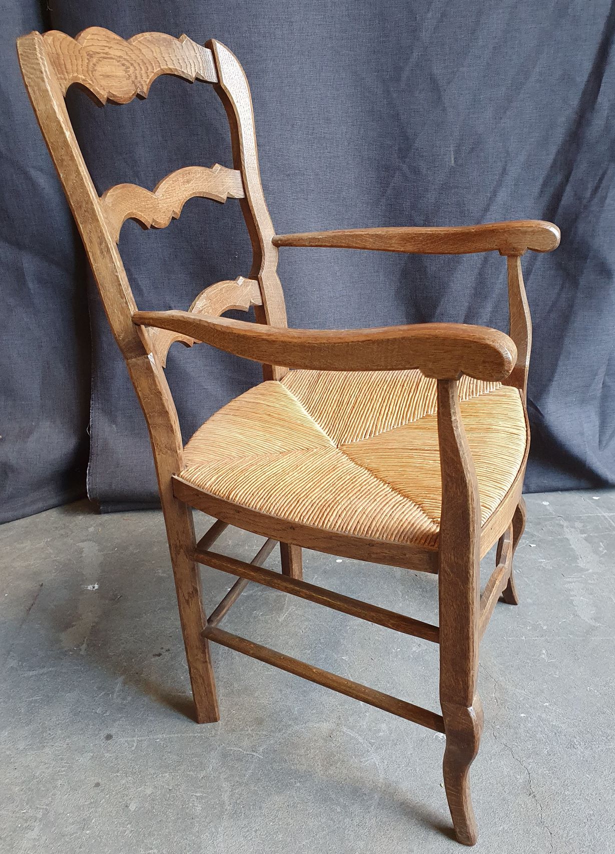 A pair of large and comfortable, light-weight, Louis XV style French provincial oak ladderback armchairs. The ample seats are fitted with woven rush, early 20th century, circa 1900.