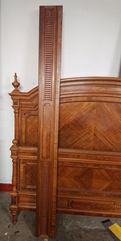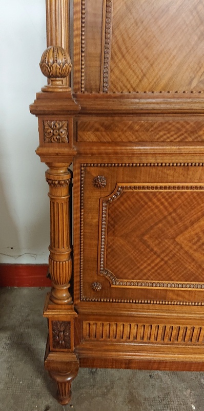 An elegant 19th century French Louis XVI style carved solid walnut and book-matched walnut bed, the bed head and footer decorated with finely carved paterae, egg-and-dart, string-of-pearl and acanthus-leaf mouldings and fitted with finely turned and carved pilasters and finials. Retaining an excellent, bronze-like walnut patina with the original side rails. Area of Paris, circa 1880. Using the full width of this bed we can fit a 152 cm wide Queen-size mattress. The side rails may need to be lengthened to fit the standard Queen mattress length.
