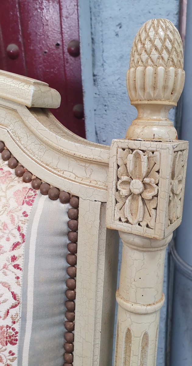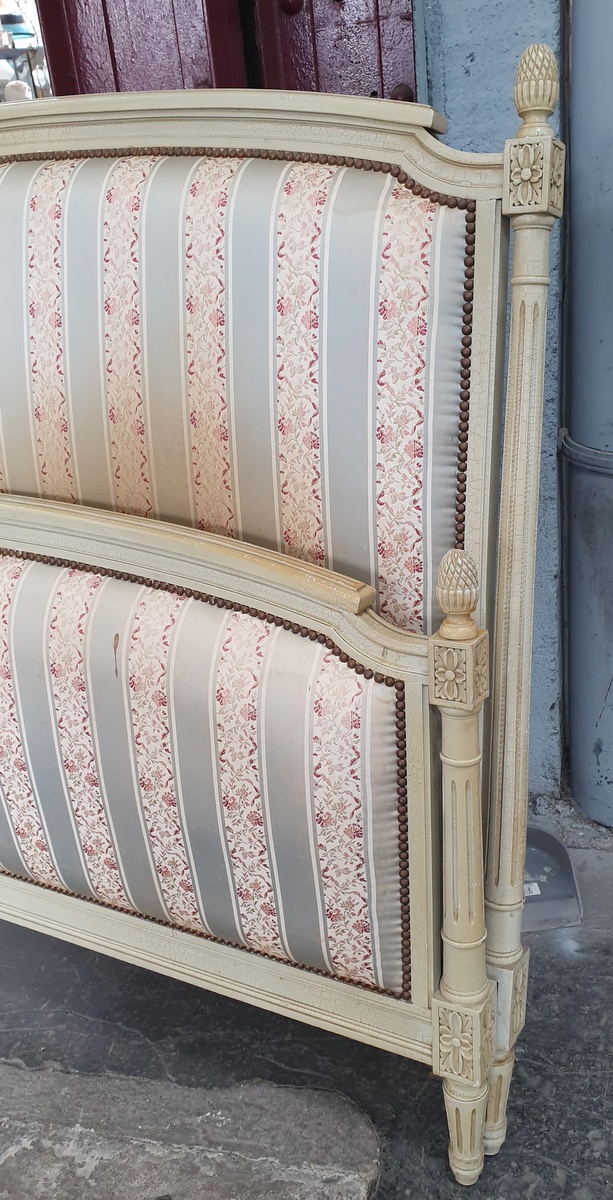 An early 20th century French Louis XVI style finely carved and off-white painted upholstered bed, the header and footer with shaped top rails decorated with haut-relief carved paterae, finials and fluted pilasters. This bed will take a standard Australian Queen size mattress. Area of Paris, circa 1930.