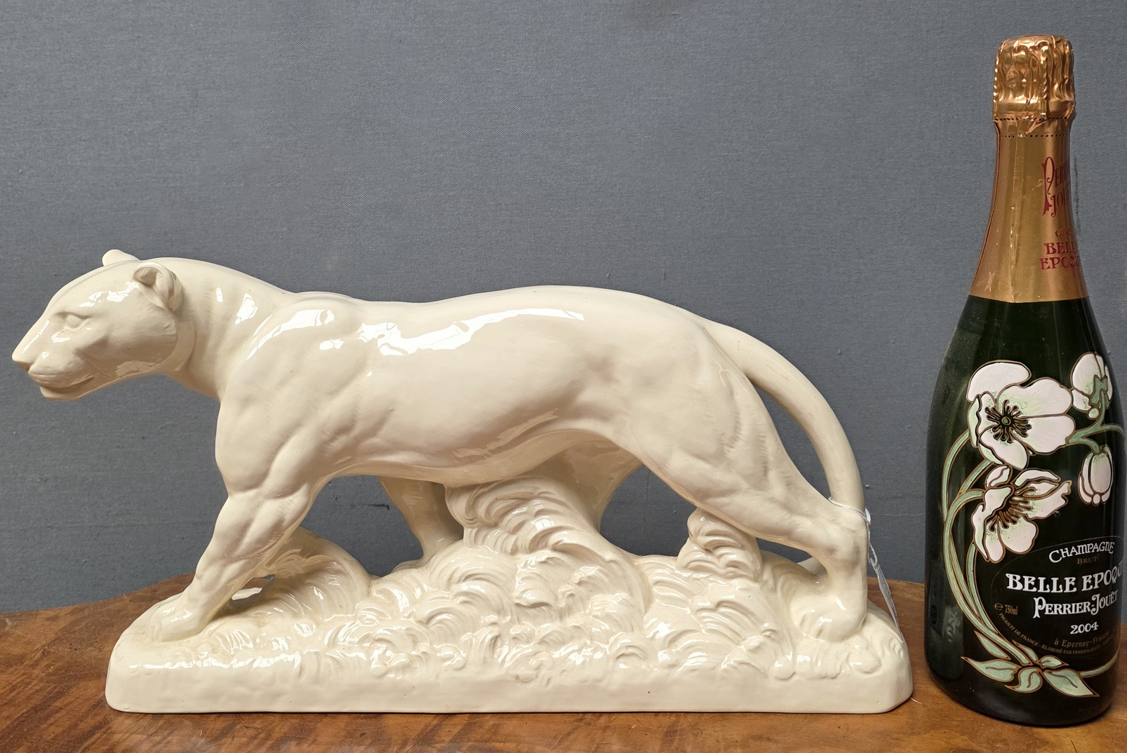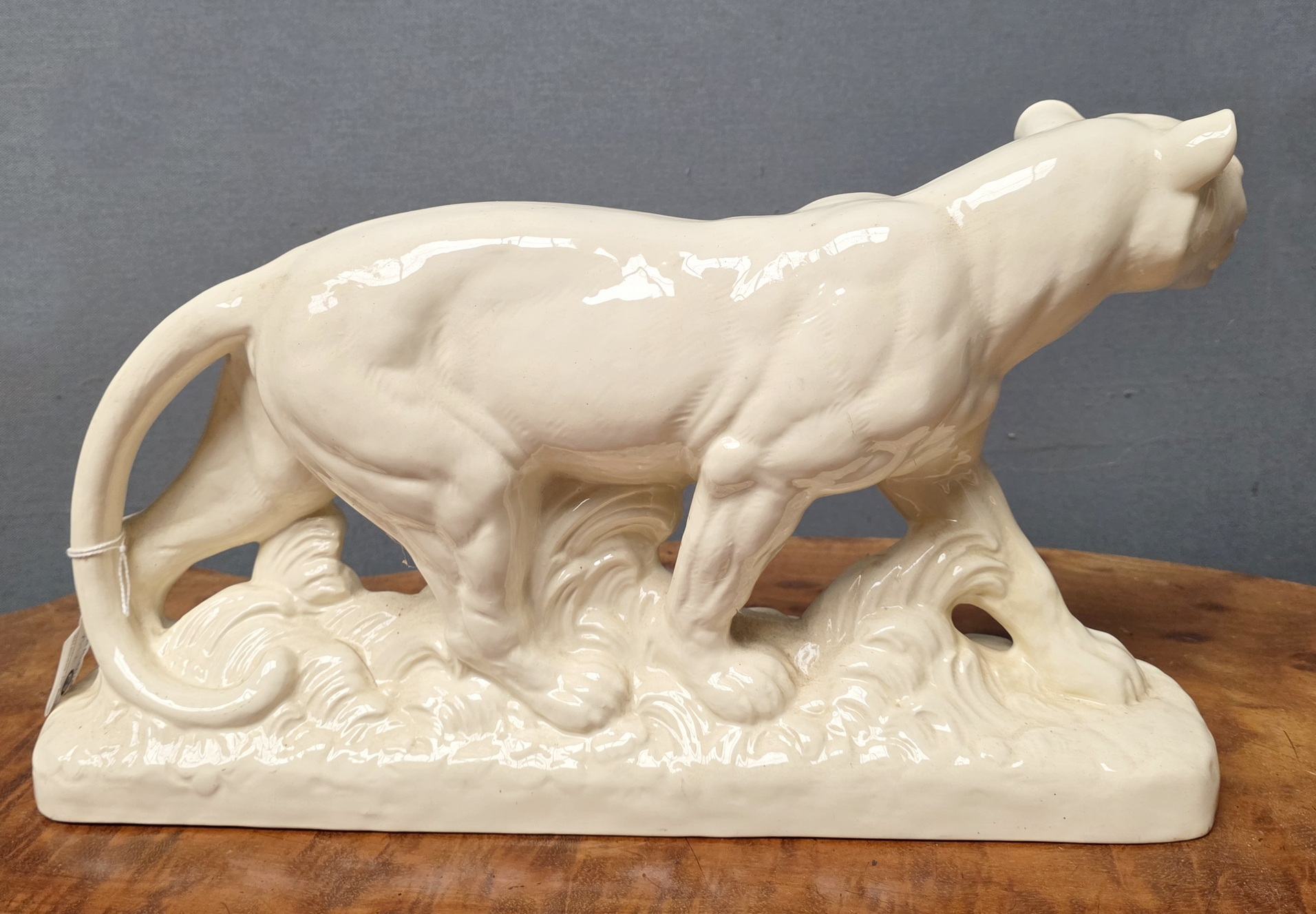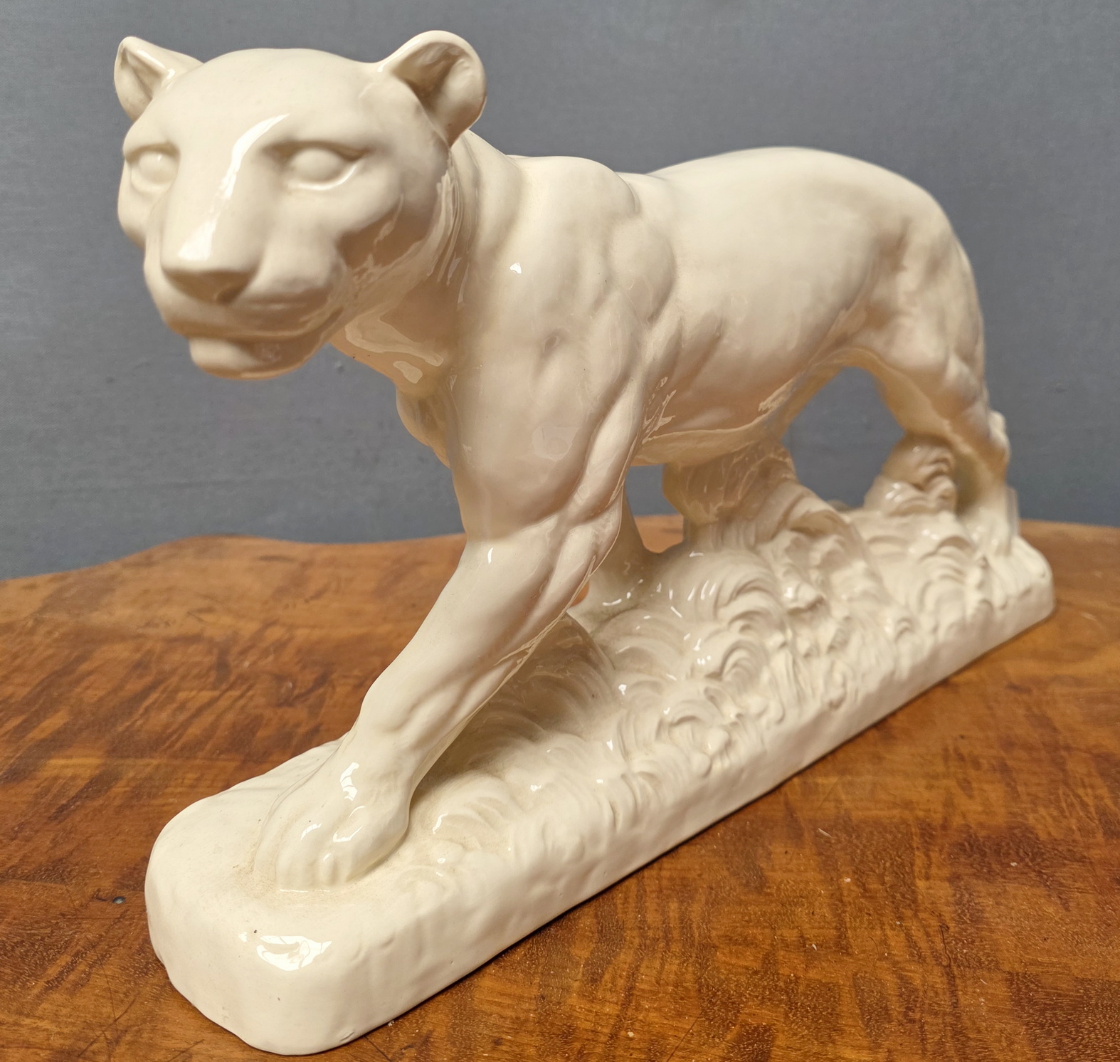 An early 20th century French Art Deco period glazed majolica statuette of a prowling lioness, the glaze with a wonderful, ivory tonality. Area of Sarreguemines, France, circa 1930.