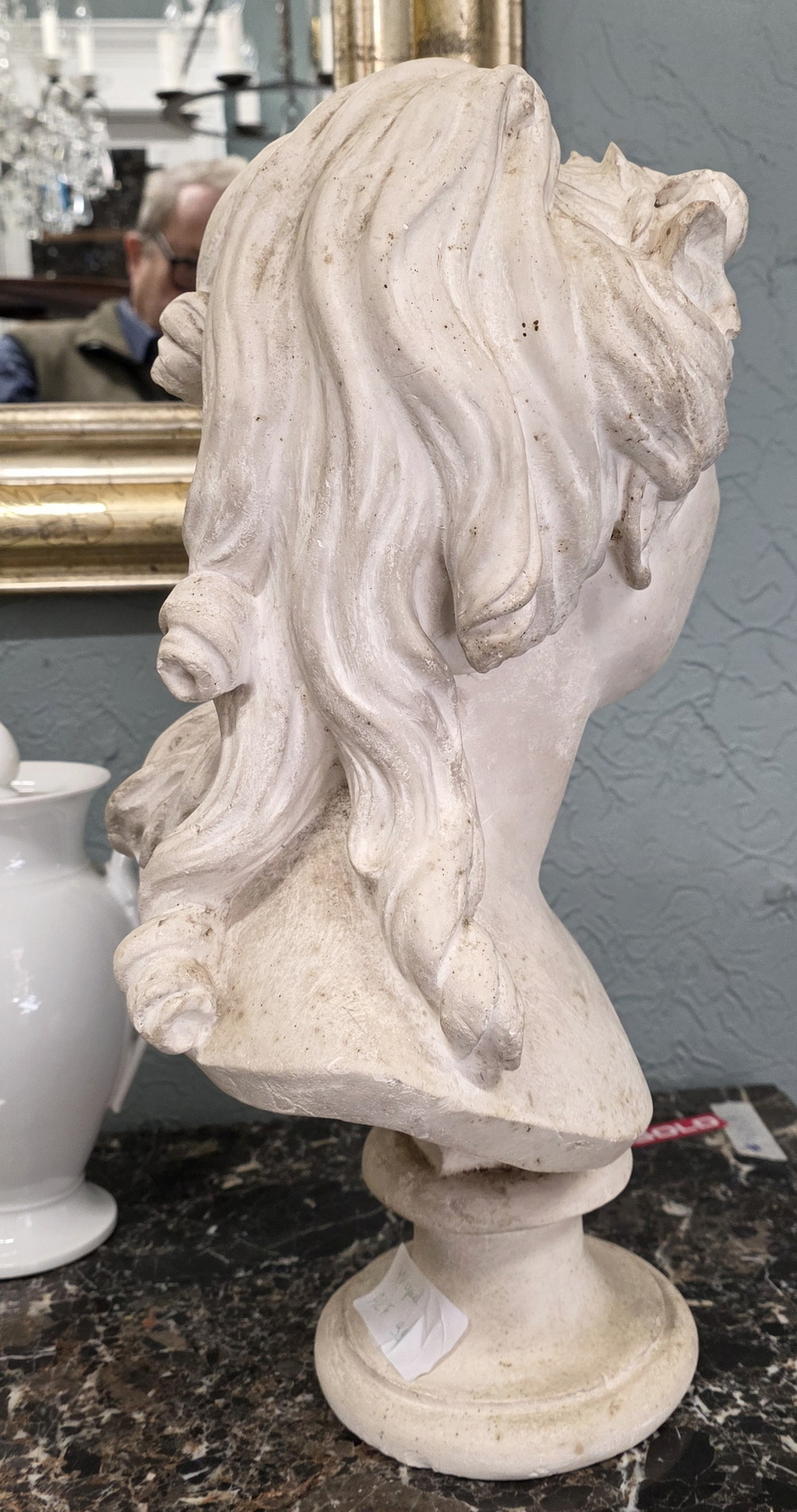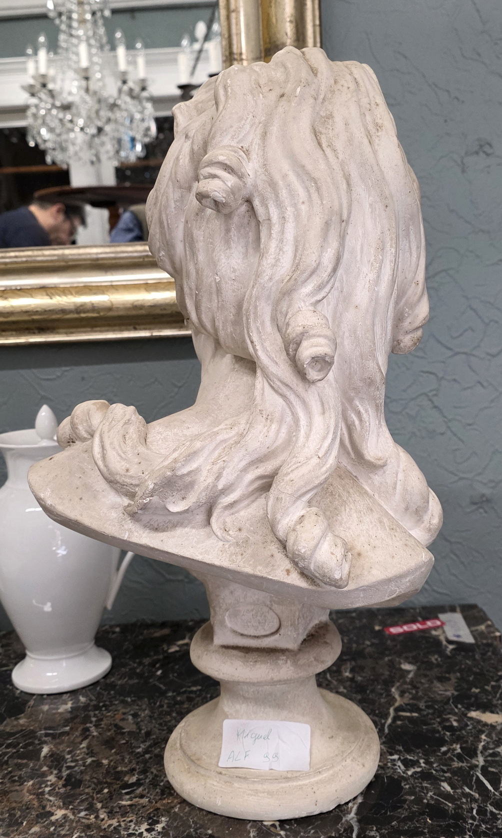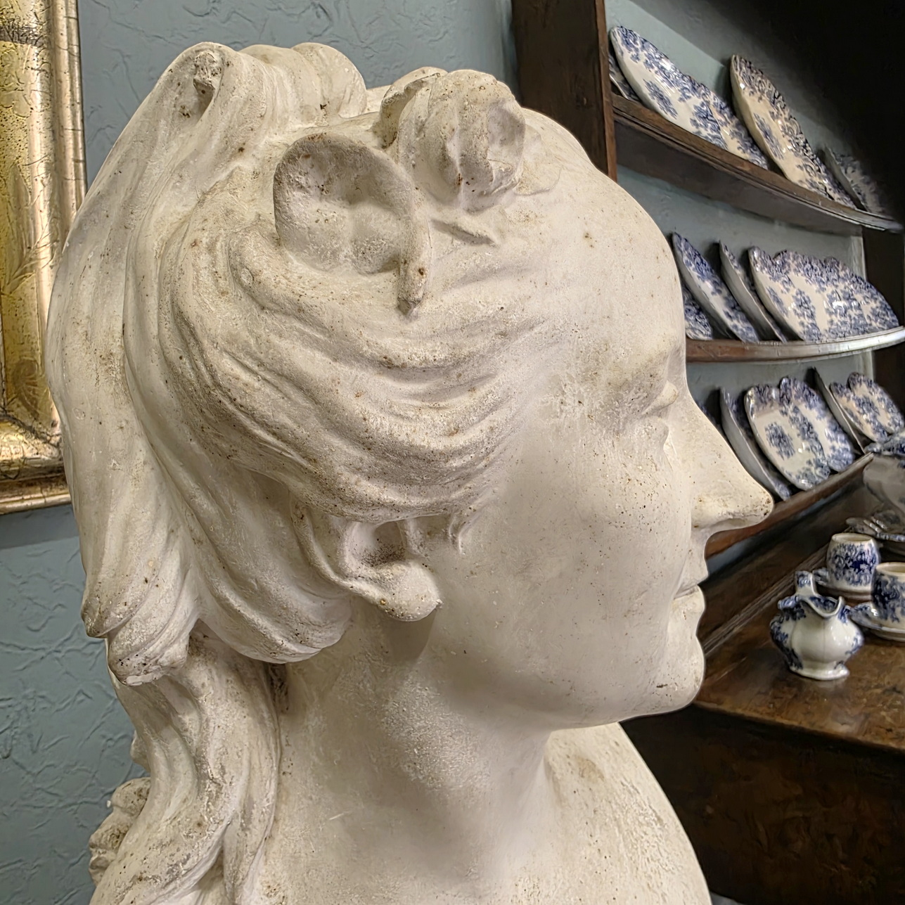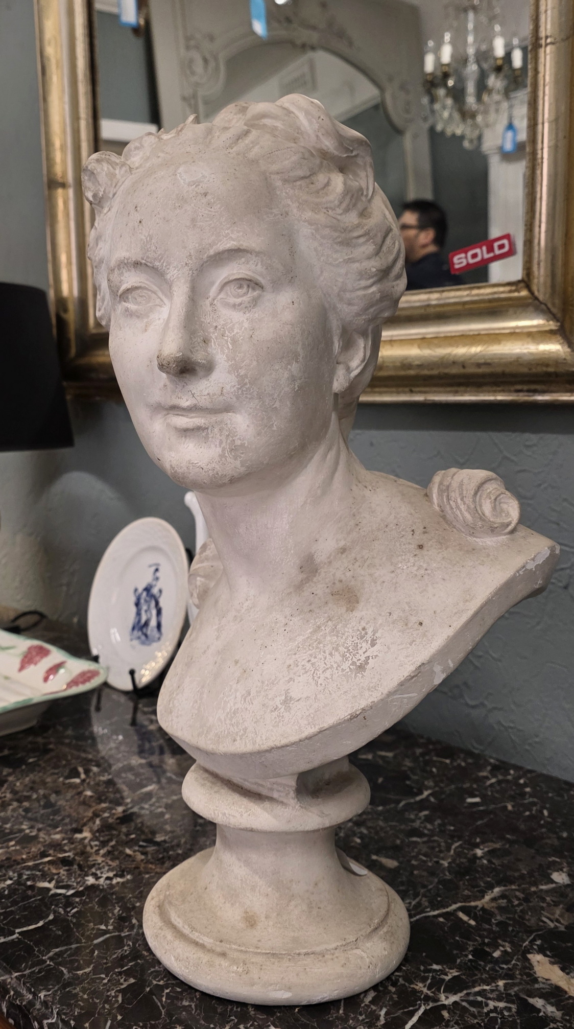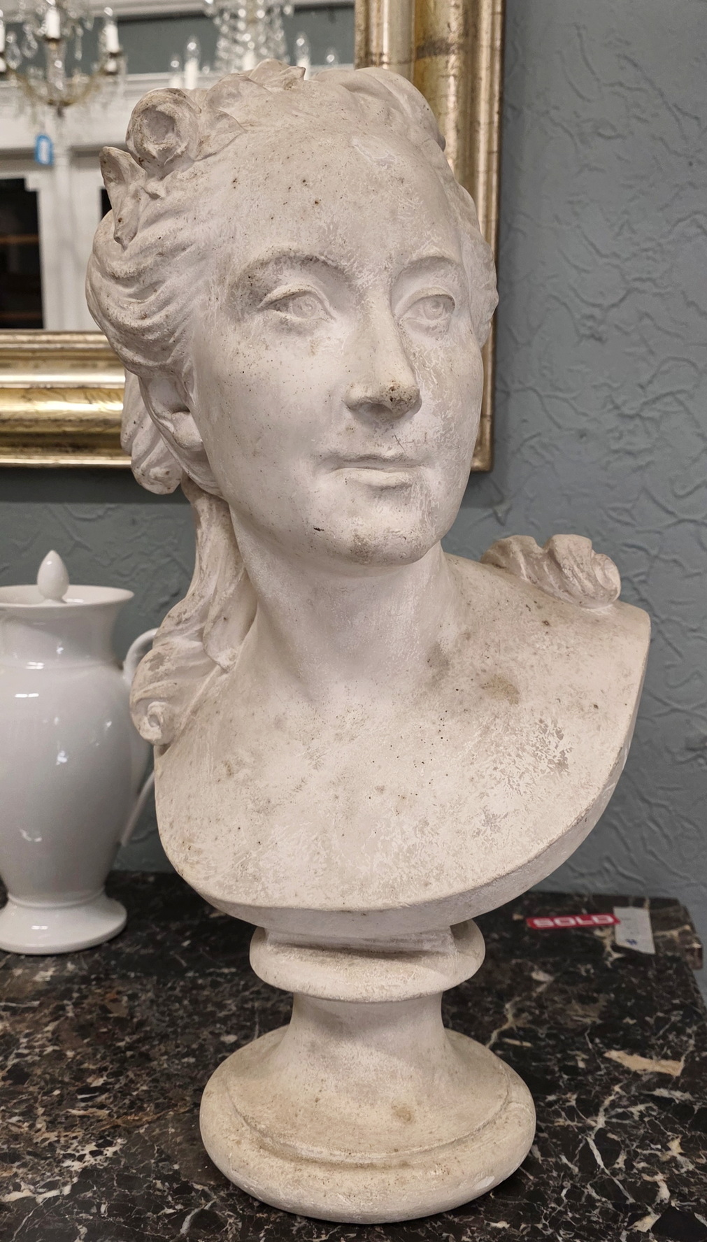 An 18th century plaster bust of 'Madame de Fondville', attributed to Jean-Baptiste Defernex (Paris 1729 -1783). Madame de Fondville was a name given to an idealised image of an aristocratic French lady, as was also the name "le Château de Fondville" used used as an example of an aristocratic mansion. Area of Paris, circa 1780.