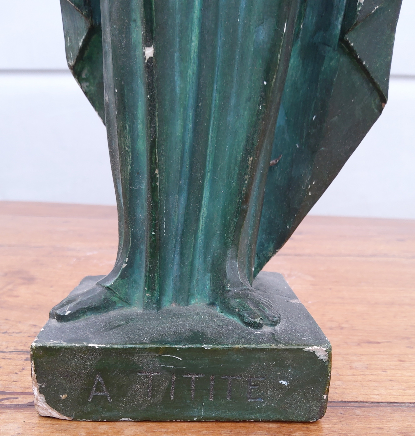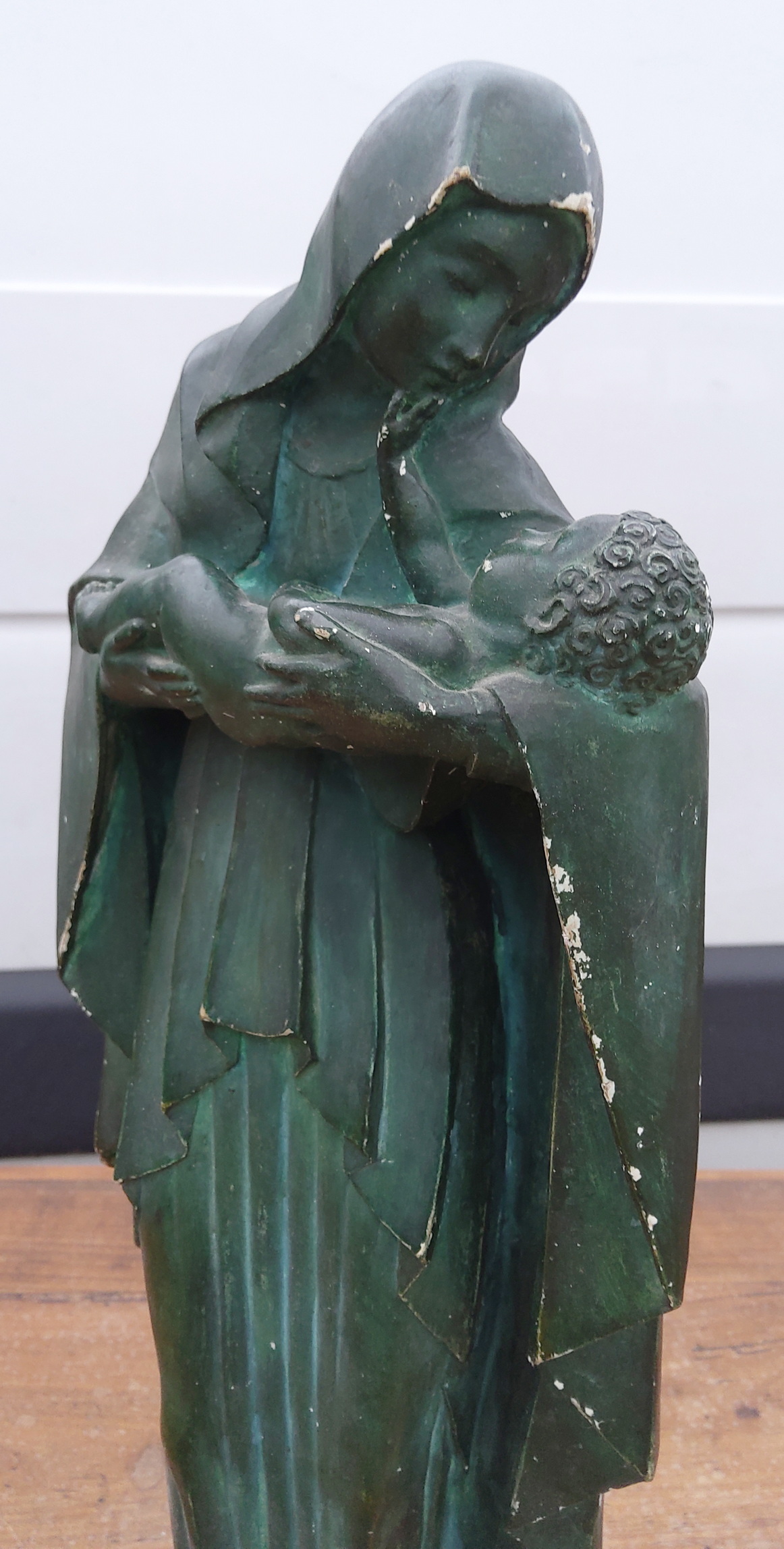 A French Art Deco period green patinated plaster statuette of a Mother and Child, inspired by the wood and ivory sculpture 'Madonna holding baby Jesus' by the French sculptor Lucienne Heuvelmans (1885-1944). Signed on the plinth 'A. Titite'. Area of Paris, circa 1930.