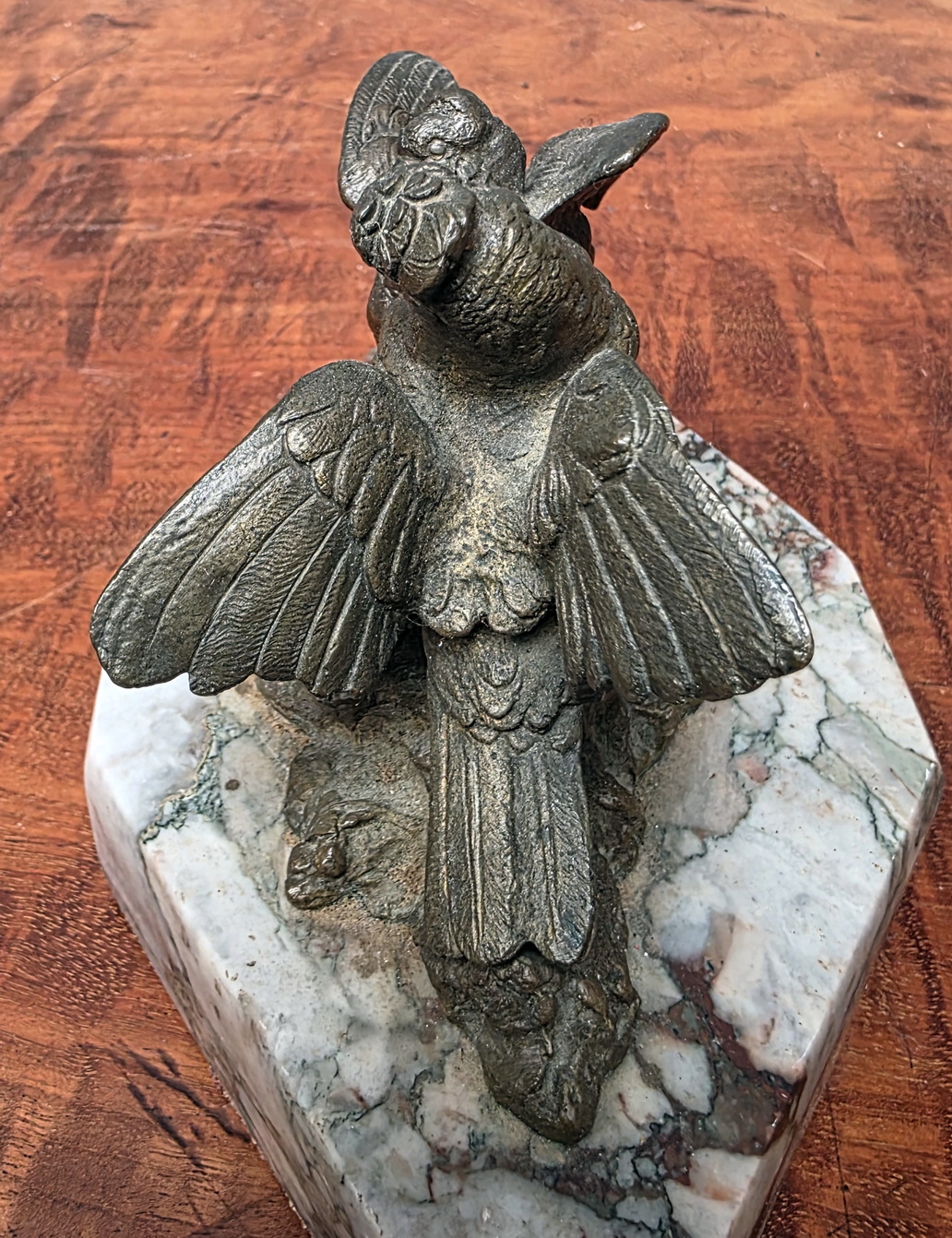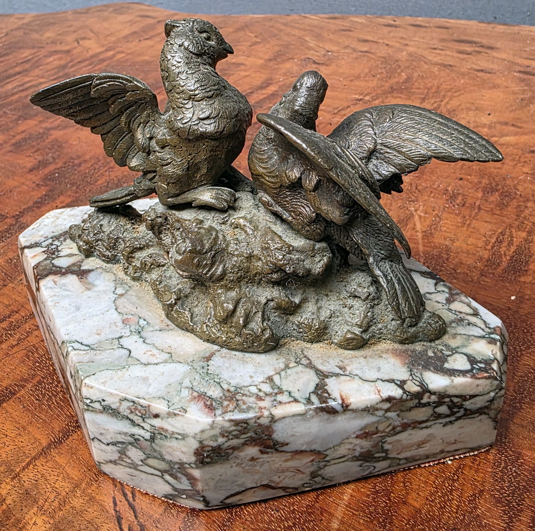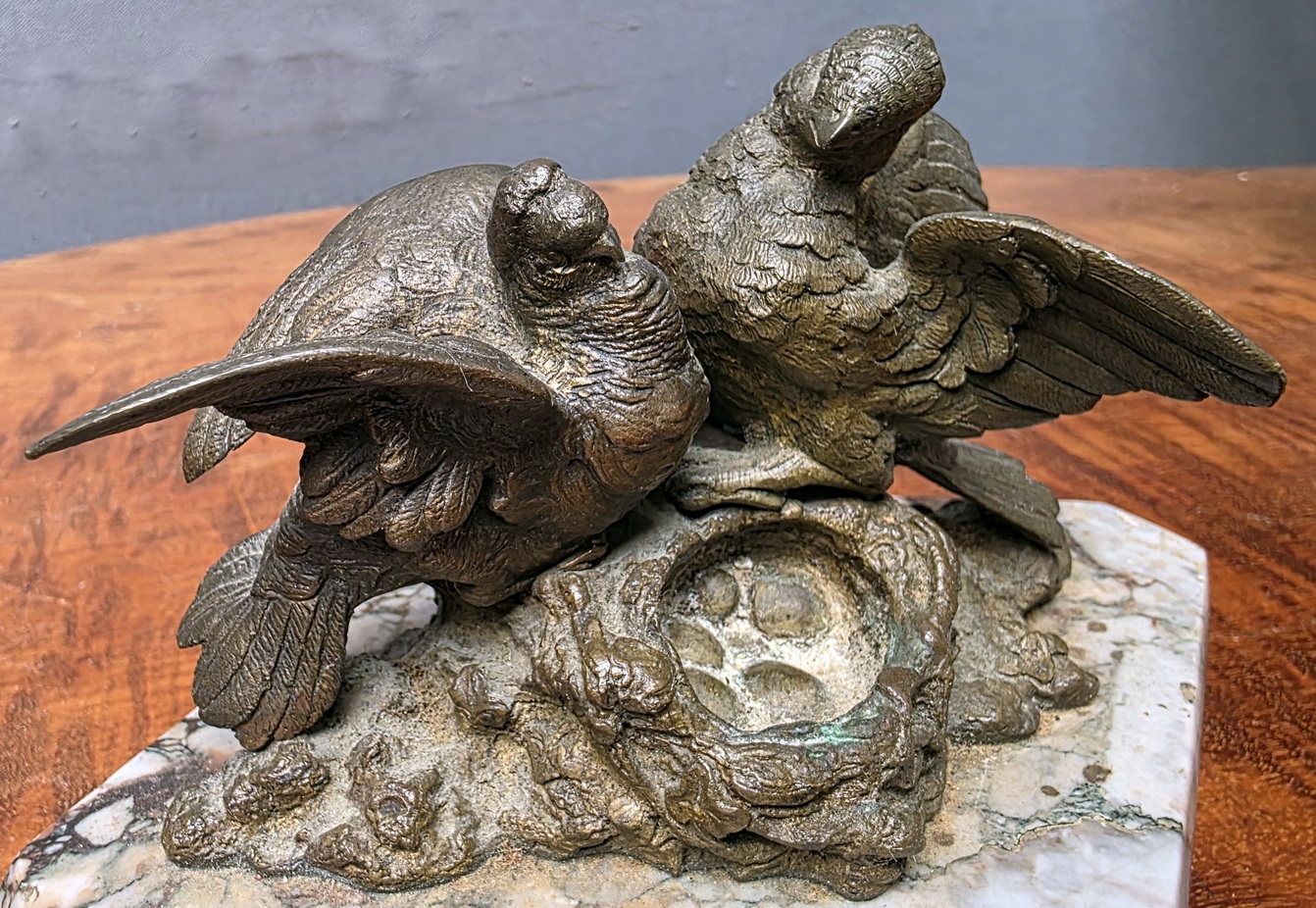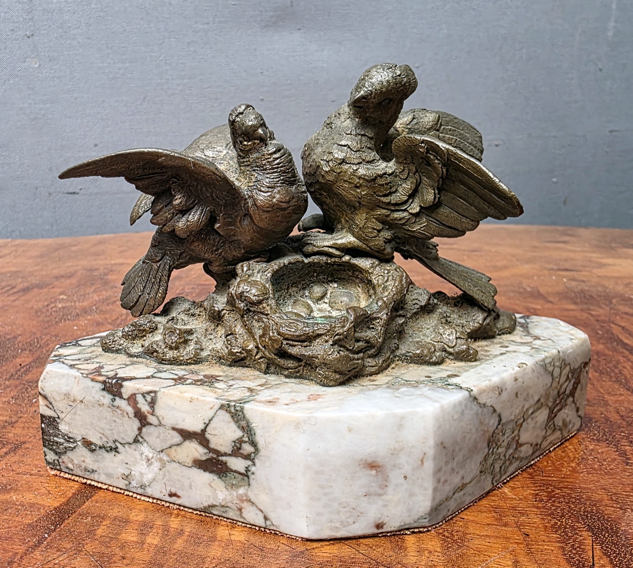 A very fine 19th century French bronze statuette, an allegory for a loving home, attributed to the French 'animalier' sculptor Jules Moigniez (1835-1894), depicting two nesting doves watching over a nest full of eggs. Standing on its original, shaped 'breche' marble plinth. Area of Paris, circa 1870.