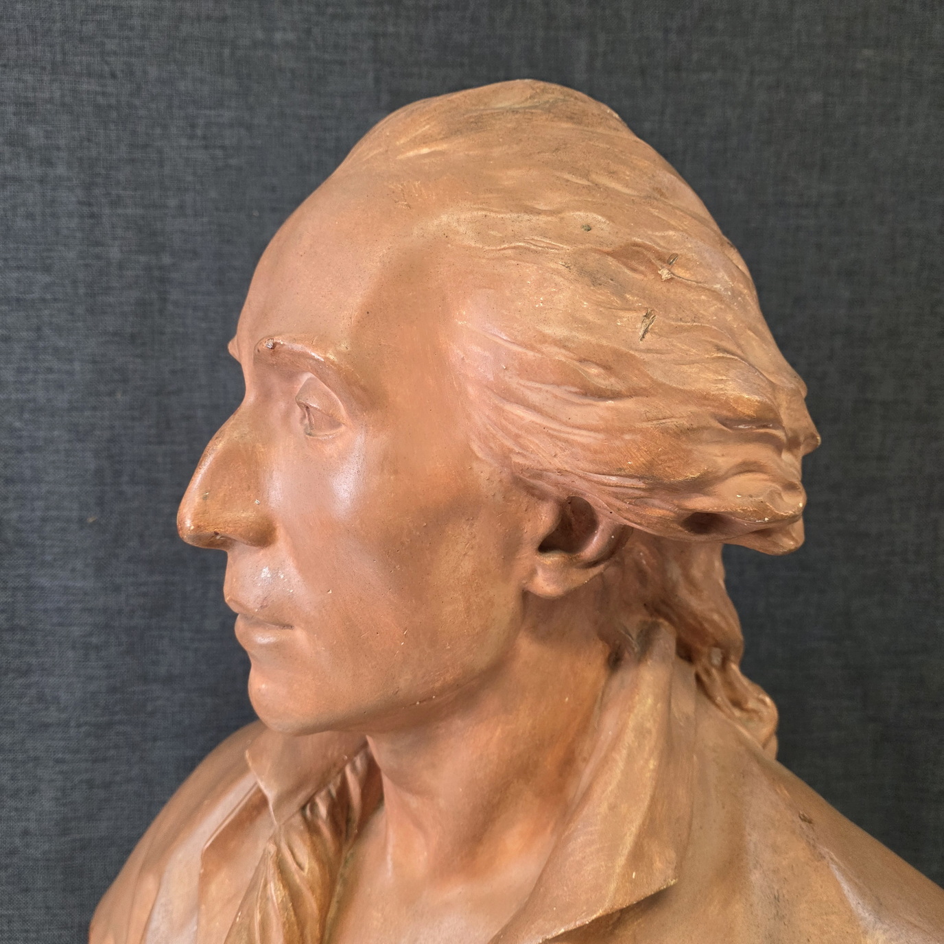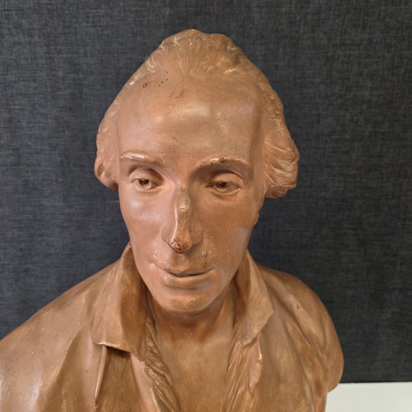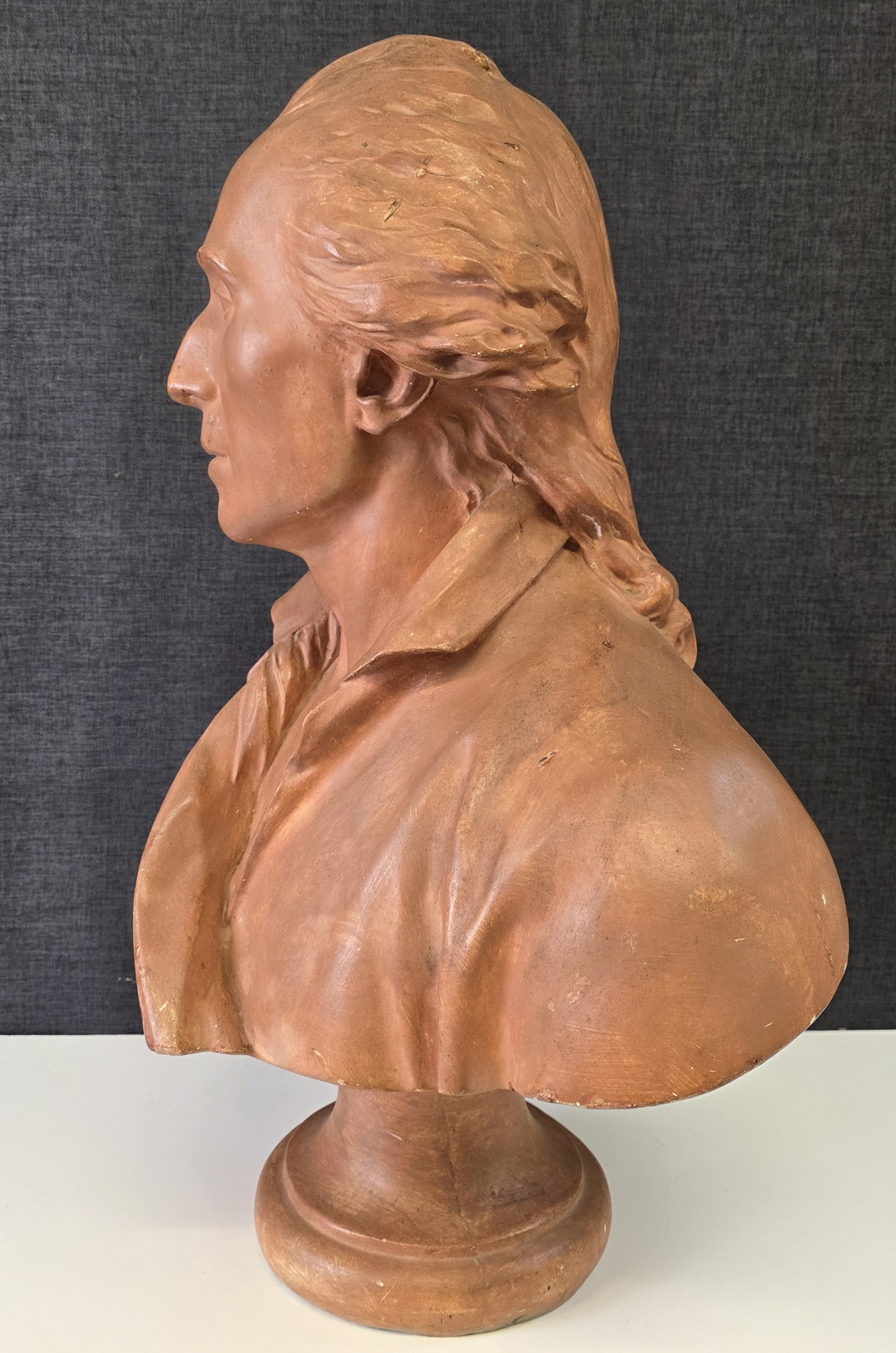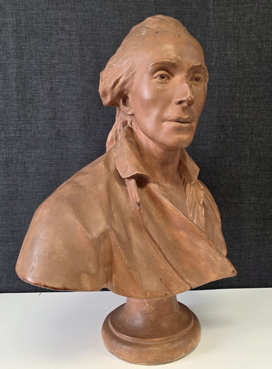 A 19th century French Napoleon III period, terracotta-patinated plaster bust of Jean Baptiste de Piquet, Marquis de Méjane, after the original marble bust by Jean-Antoine Houdon, (Arles, 1741- Paris,1828), standing on its original pedestal. Area of Paris, circa 1870.