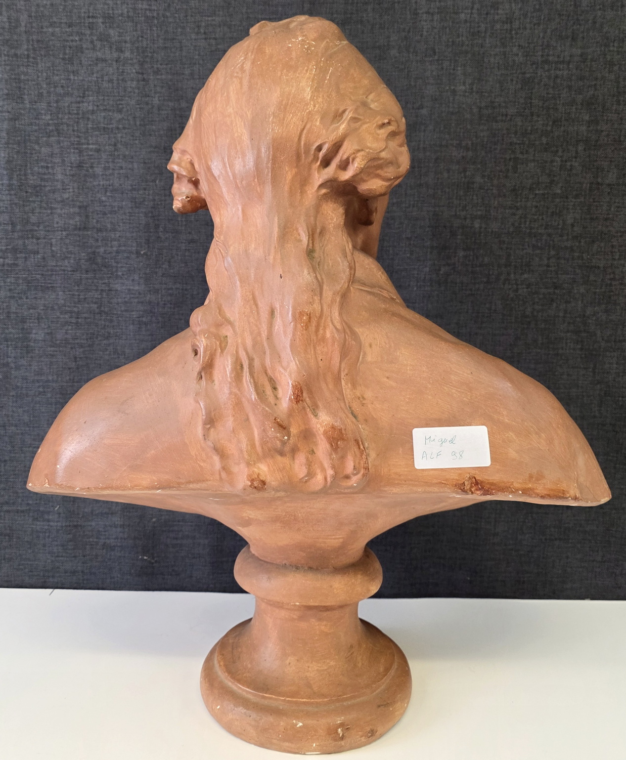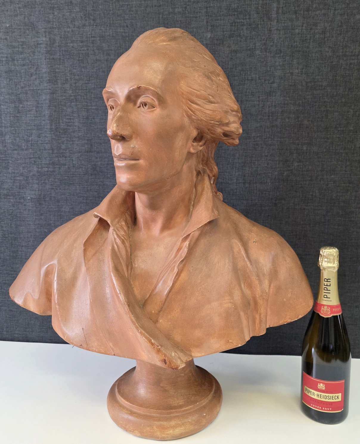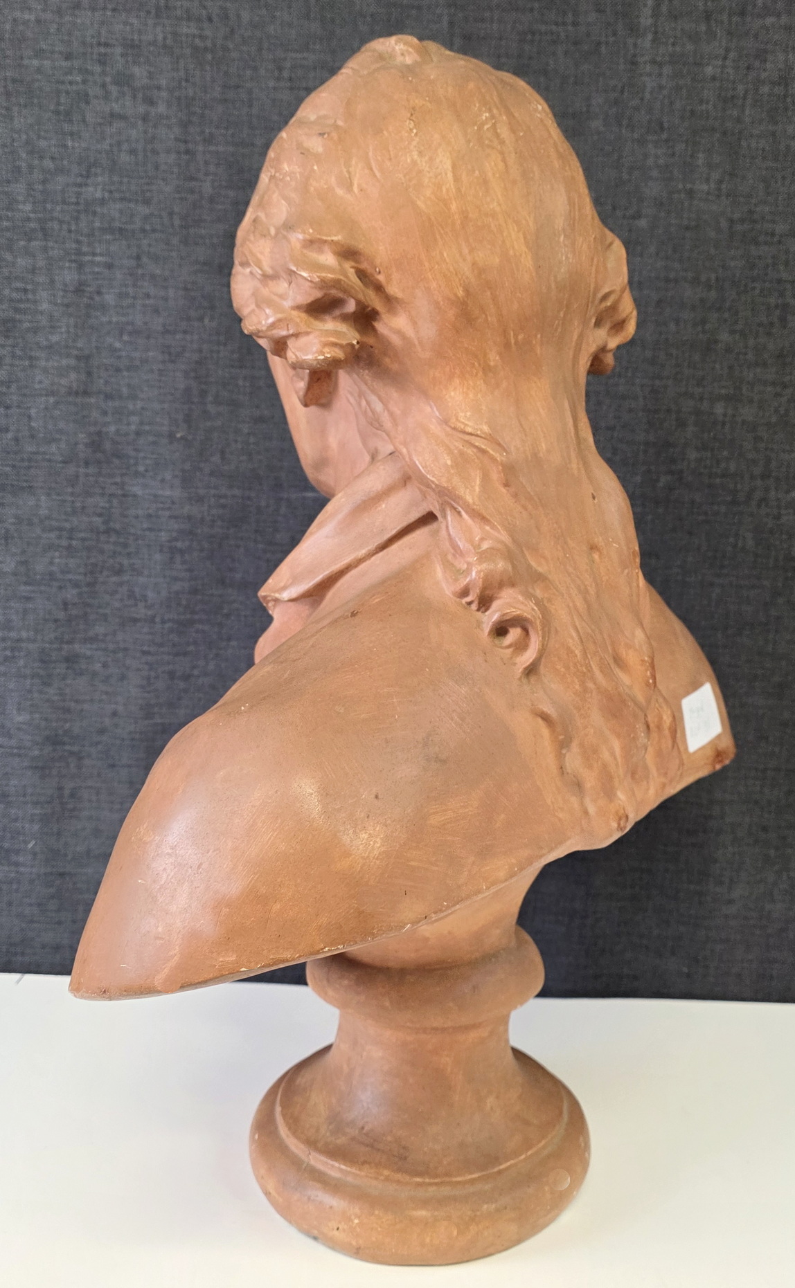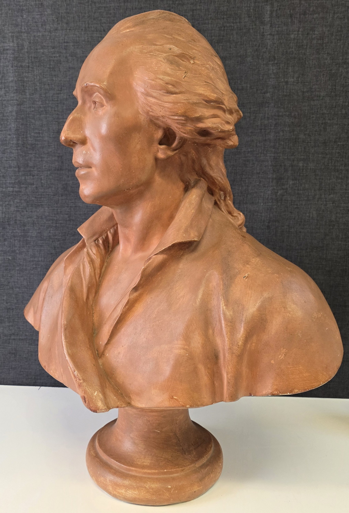 A 19th century French Napoleon III period, terracotta-patinated plaster bust of Jean Baptiste de Piquet, Marquis de Méjane, after the original marble bust by Jean-Antoine Houdon, (Arles, 1741- Paris,1828), standing on its original pedestal. Area of Paris, circa 1870.