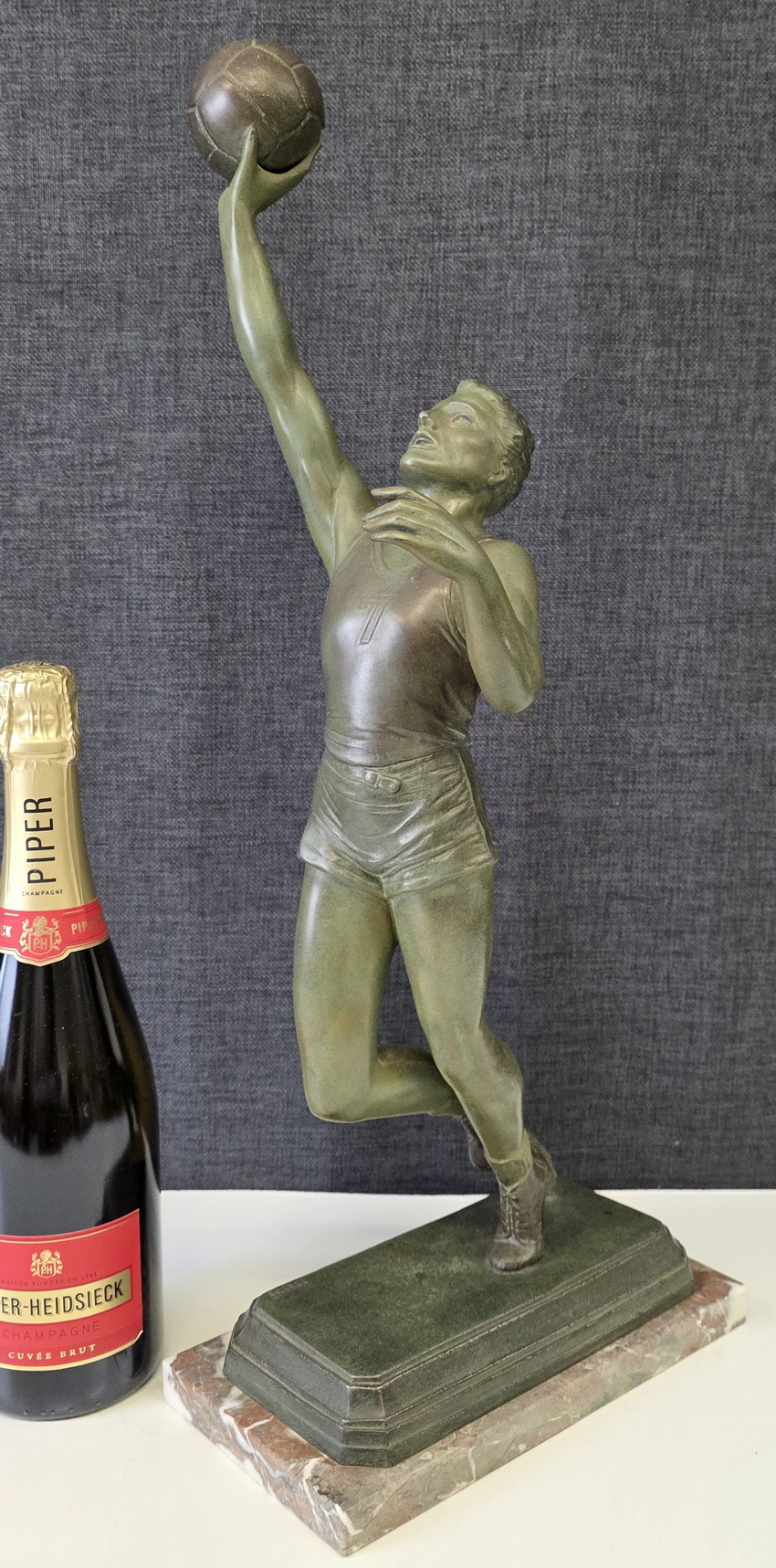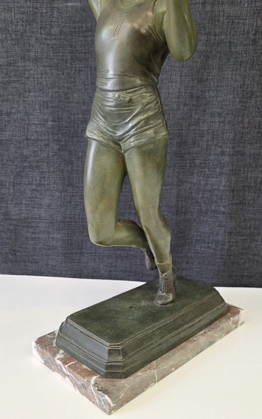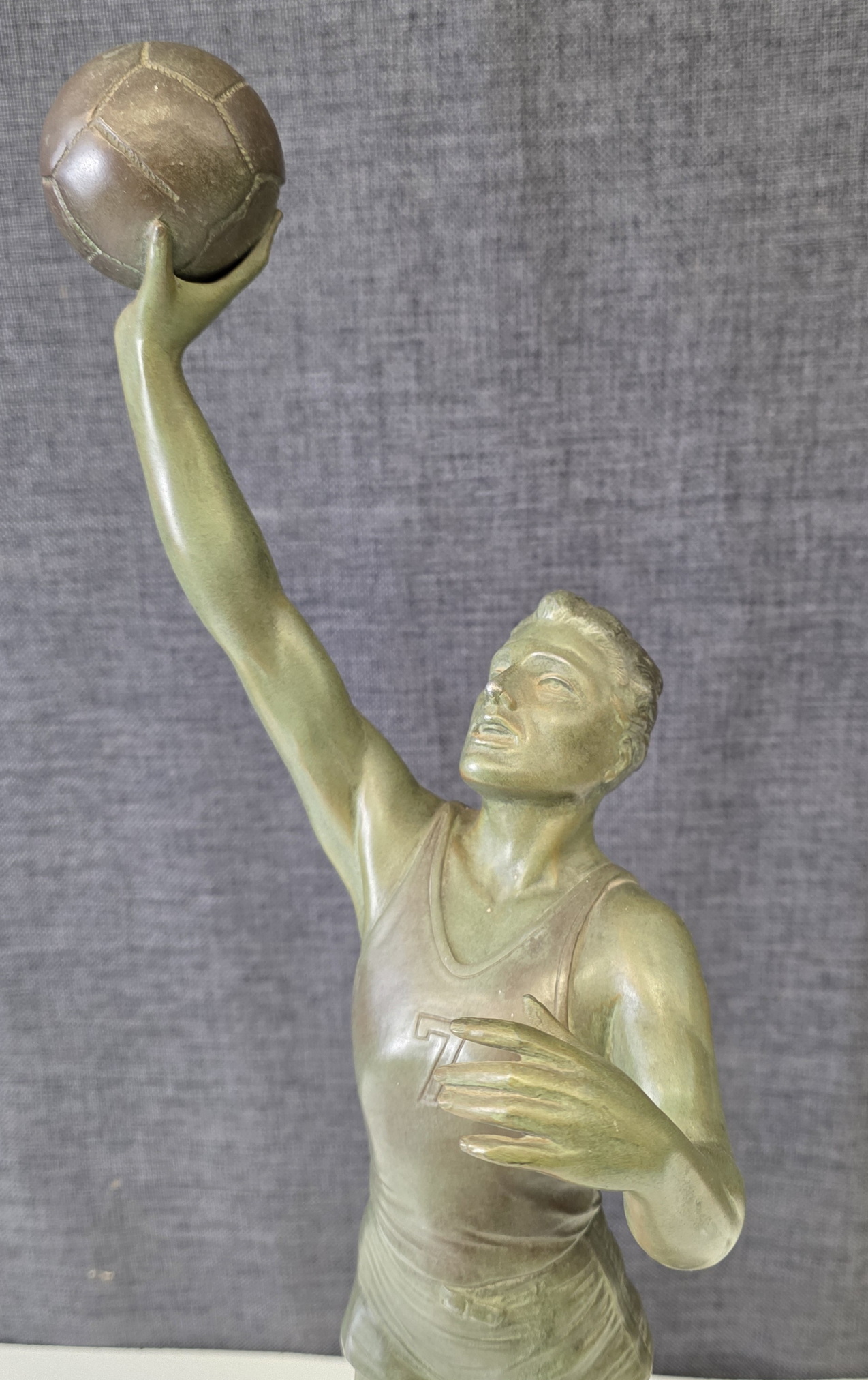 An early 20th century French Art Deco period bronze-patinated spelter statuette of a basketball player, a novelty sport for the time in Europe, considering that the first European championships were held in 1935 in Switzerland. The plinth inscribed with "France". Area of Paris, circa 1930.