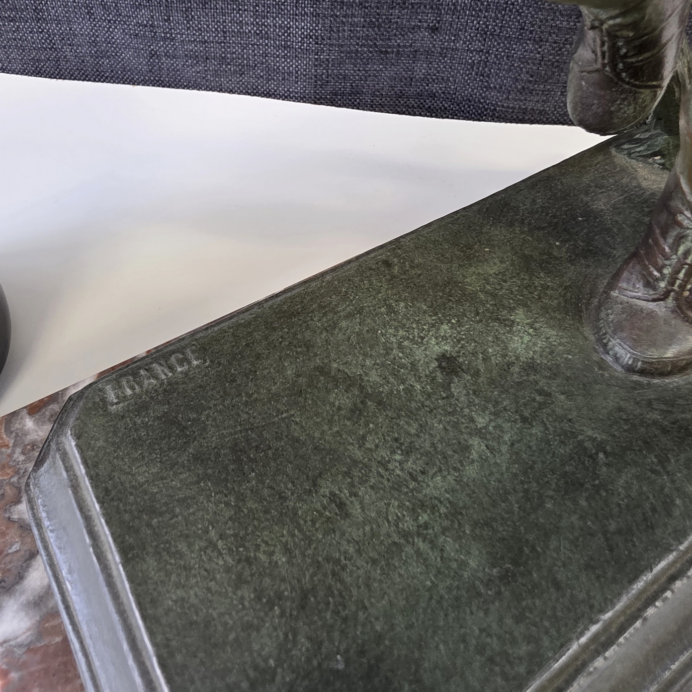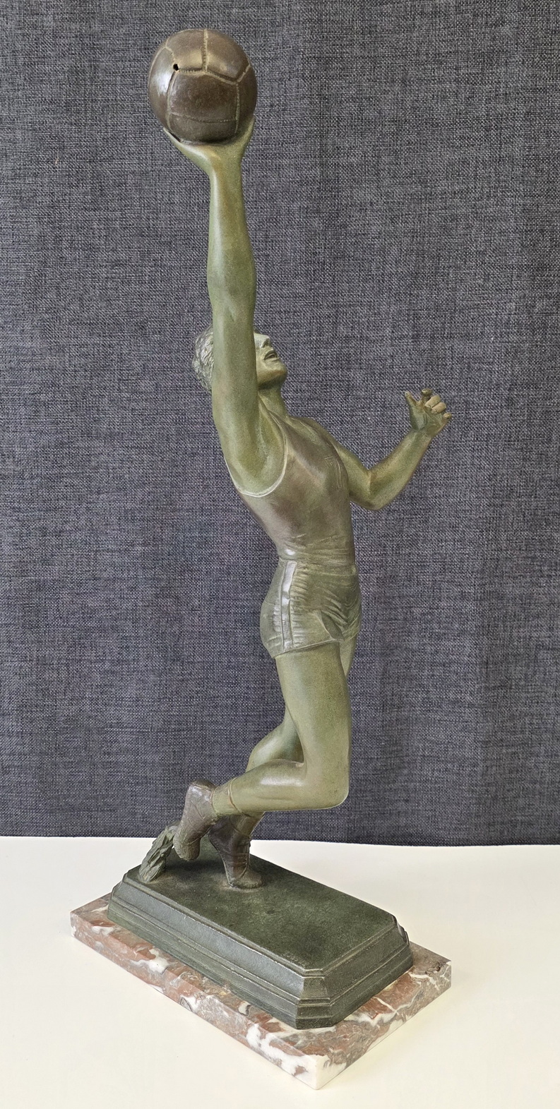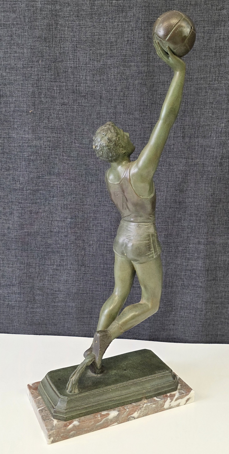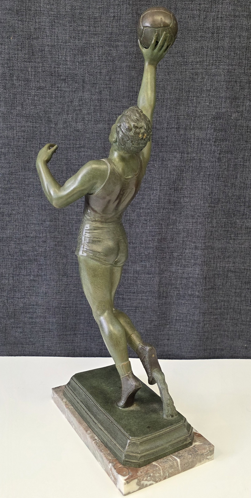 An early 20th century French Art Deco period bronze-patinated spelter statuette of a basketball player, a novelty sport for the time in Europe, considering that the first European championships were held in 1935 in Switzerland. The plinth inscribed with "France". Area of Paris, circa 1930.