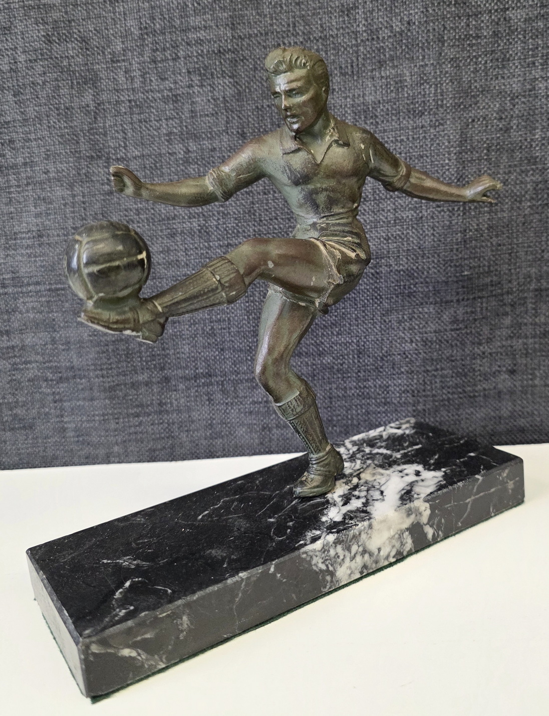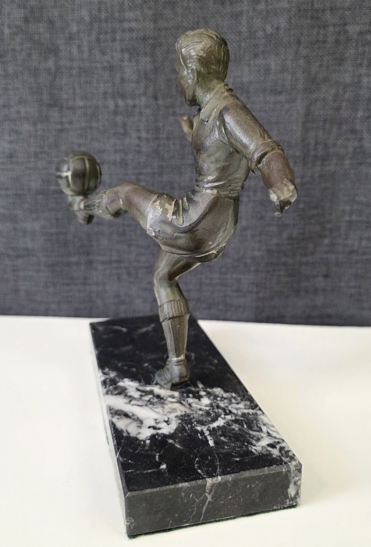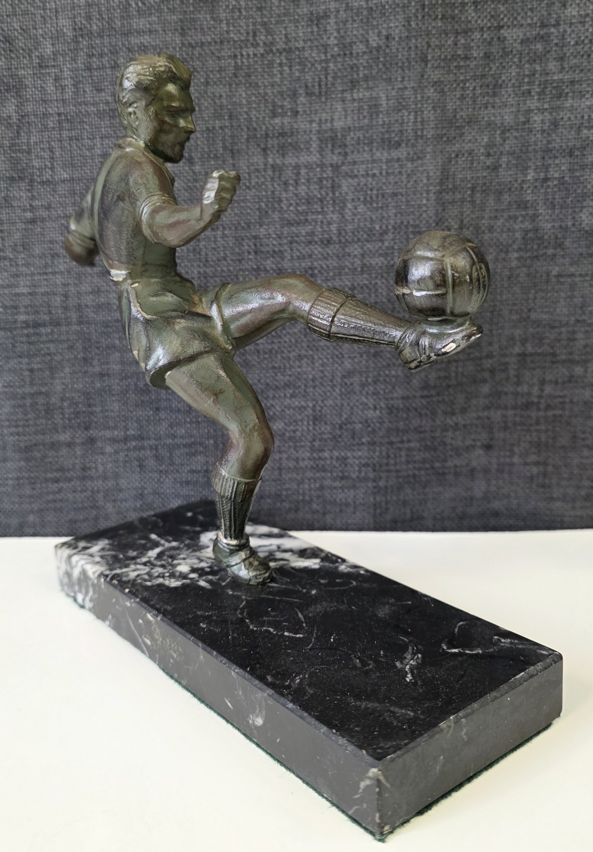 An early 20th century French Art Deco period bronze-patinated spelter statuette of a football player, a football resting on his raised left foot. Retaining its original black veined marble plinth. Area of Paris, circa 1930.