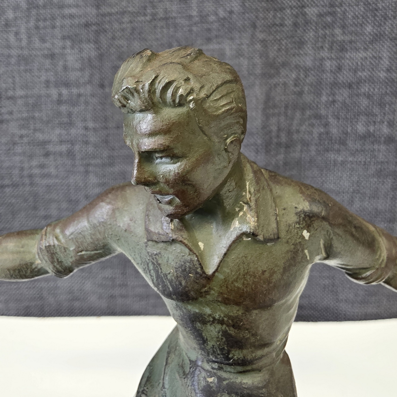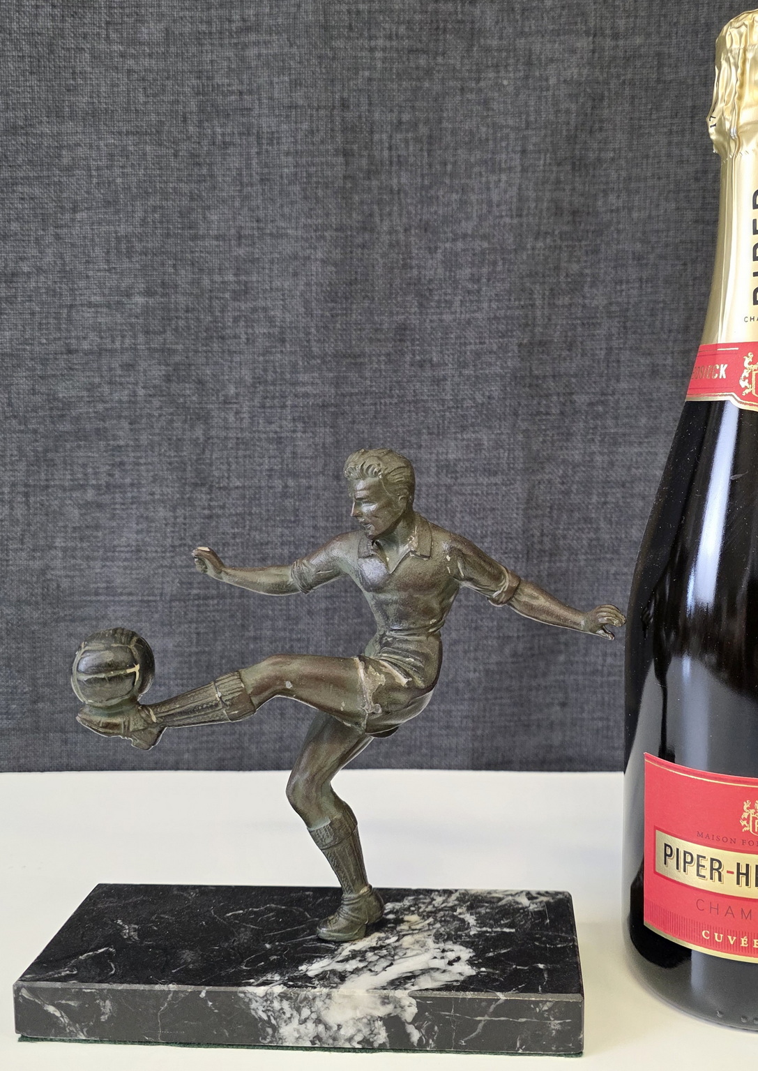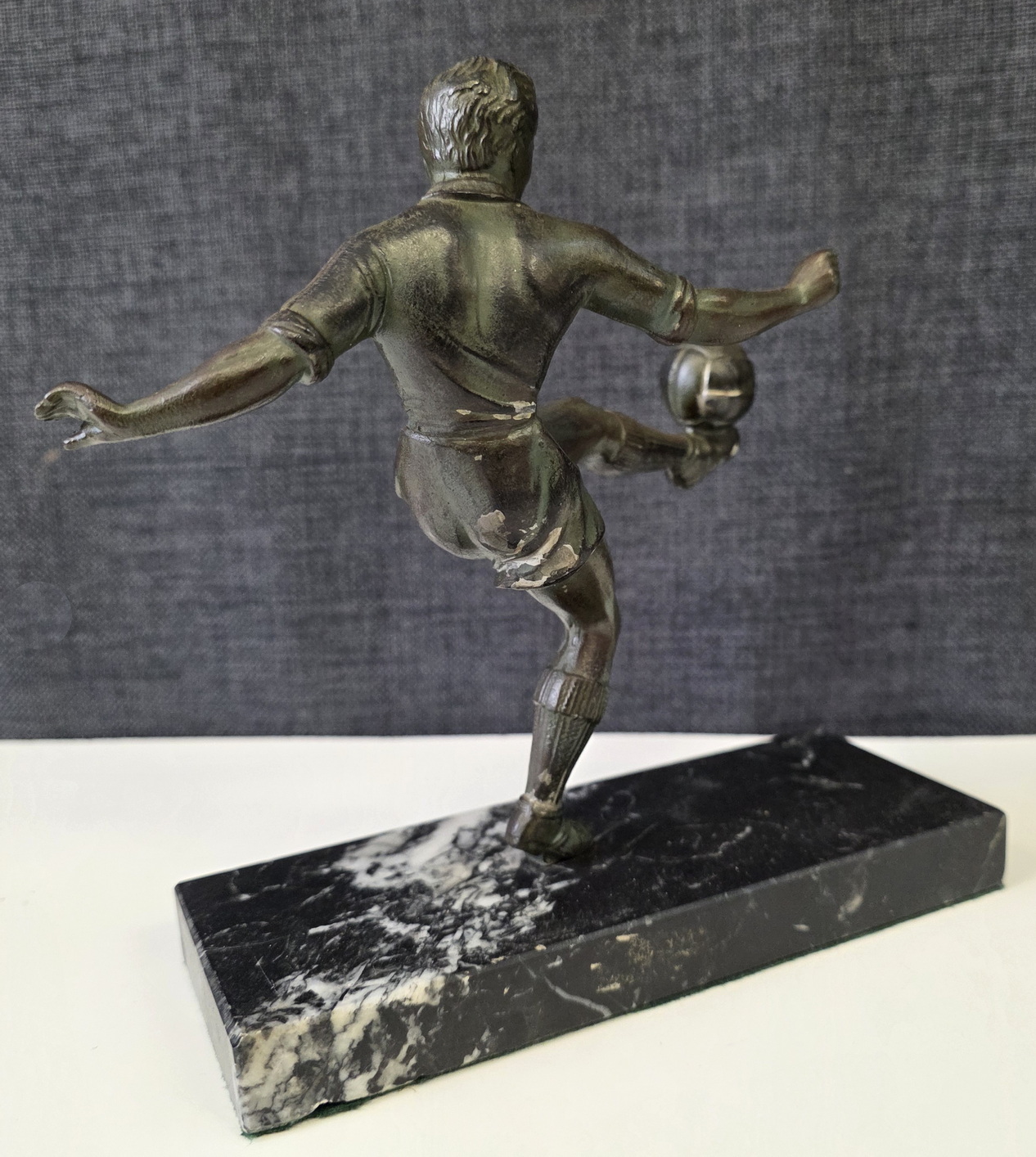 An early 20th century French Art Deco period bronze-patinated spelter statuette of a football player, a football resting on his raised left foot. Retaining its original black veined marble plinth. Area of Paris, circa 1930.