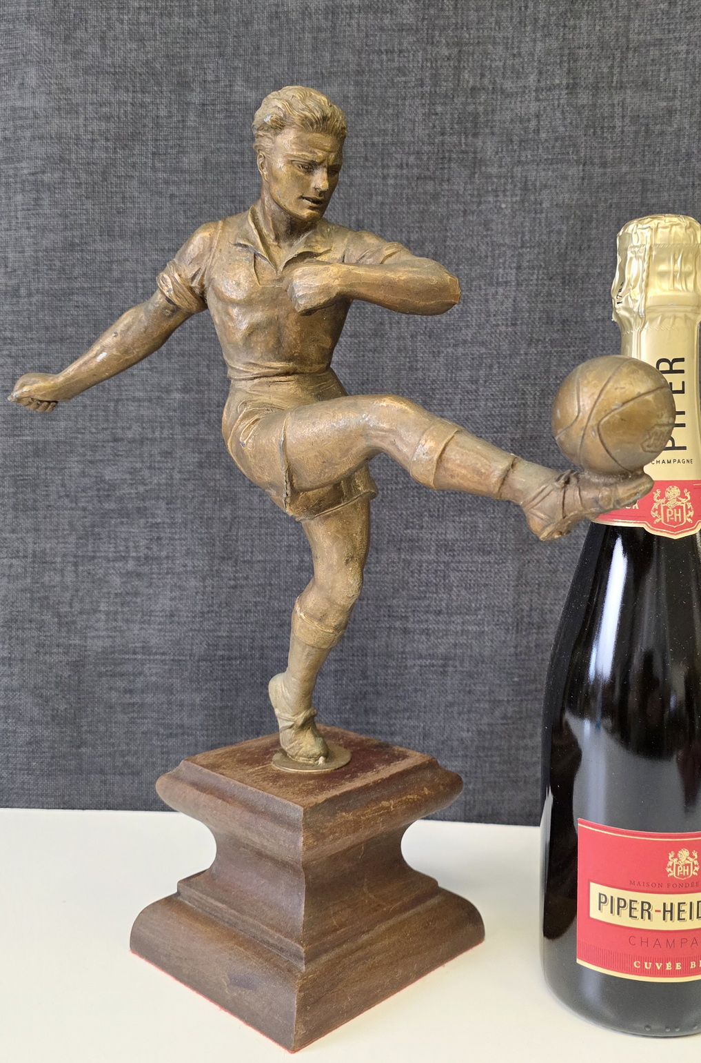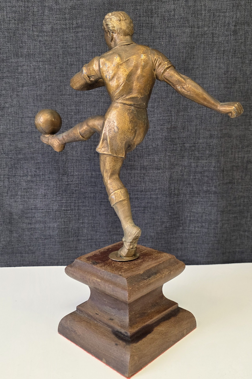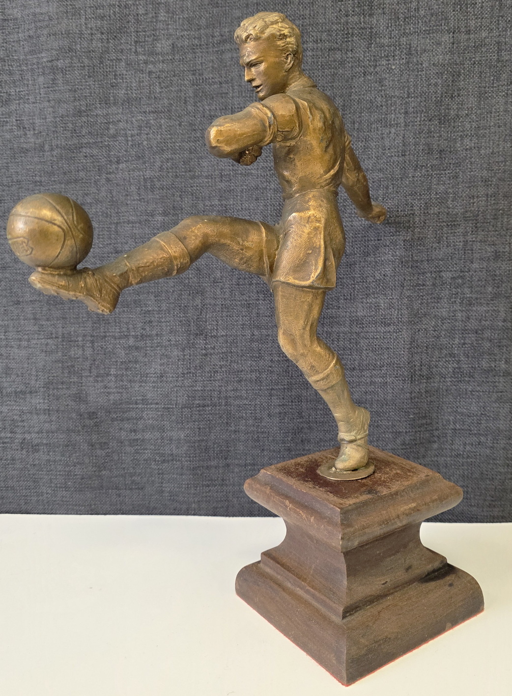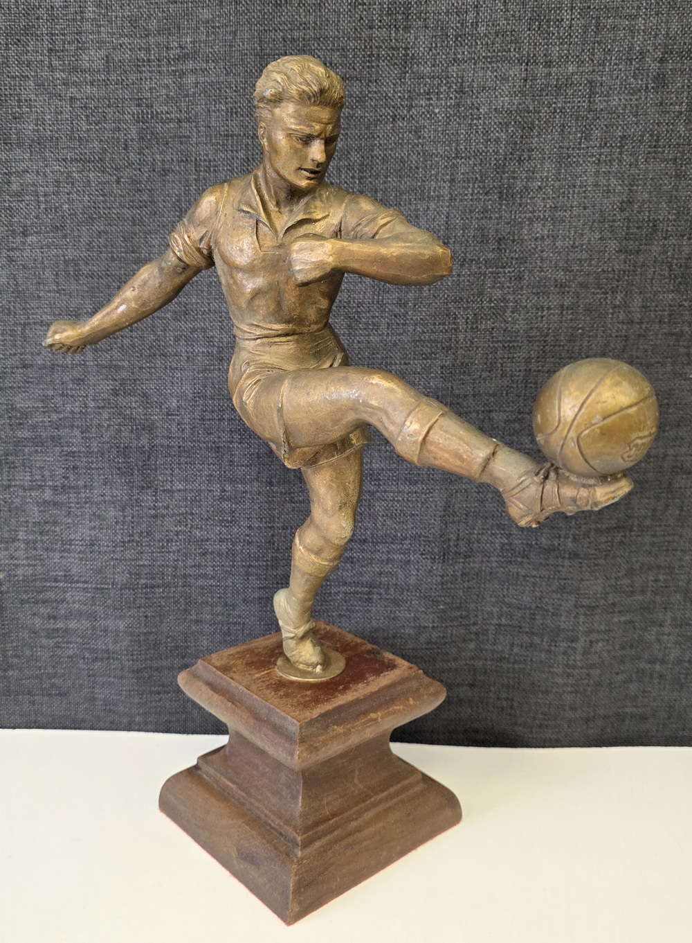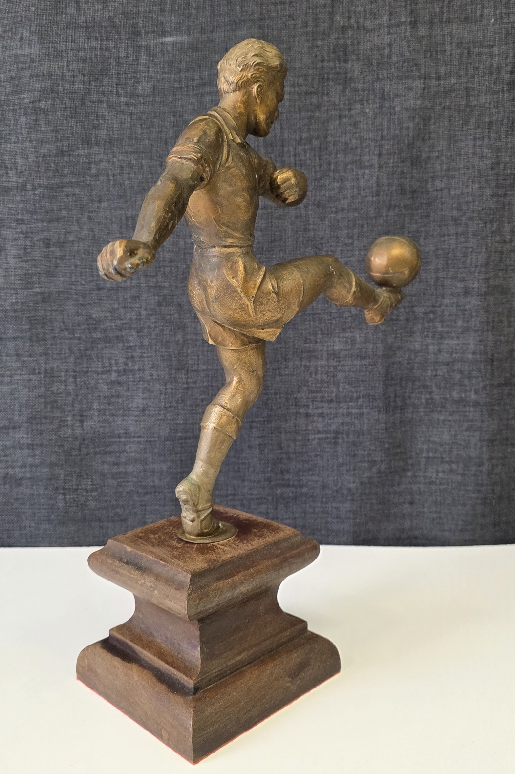 An early 20th century French Art Deco period bronze-patinated spelter statuette of a football player, a football resting on his raised left foot. Retaining its original carved ogee-moulded timber plinth. Attributed to the French Art deco period sculptor Henri Fugère (1872–1944). Area of Paris, circa 1930.