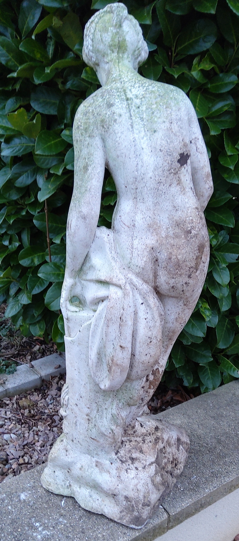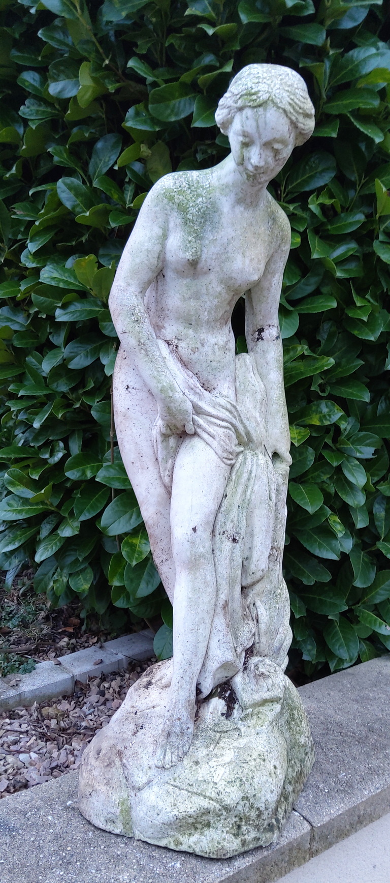 A reconstituted stone garden statue depicting the famous 'Venus au Bain' statue, also known as 'La Bagneuse', commissioned to Christophe-Gabriel Allegrain in 1757 by the King of France, Louis XV. The original statue is currently on display at the Louvre Museum in Paris. Area of Isle de France, circa 1950.