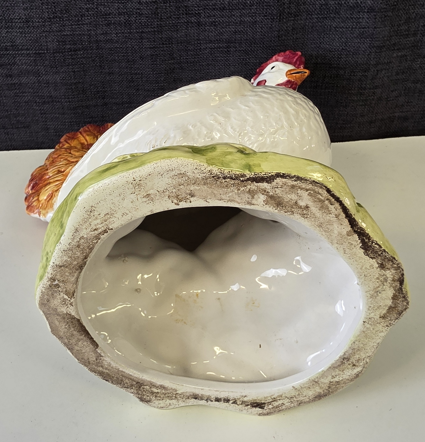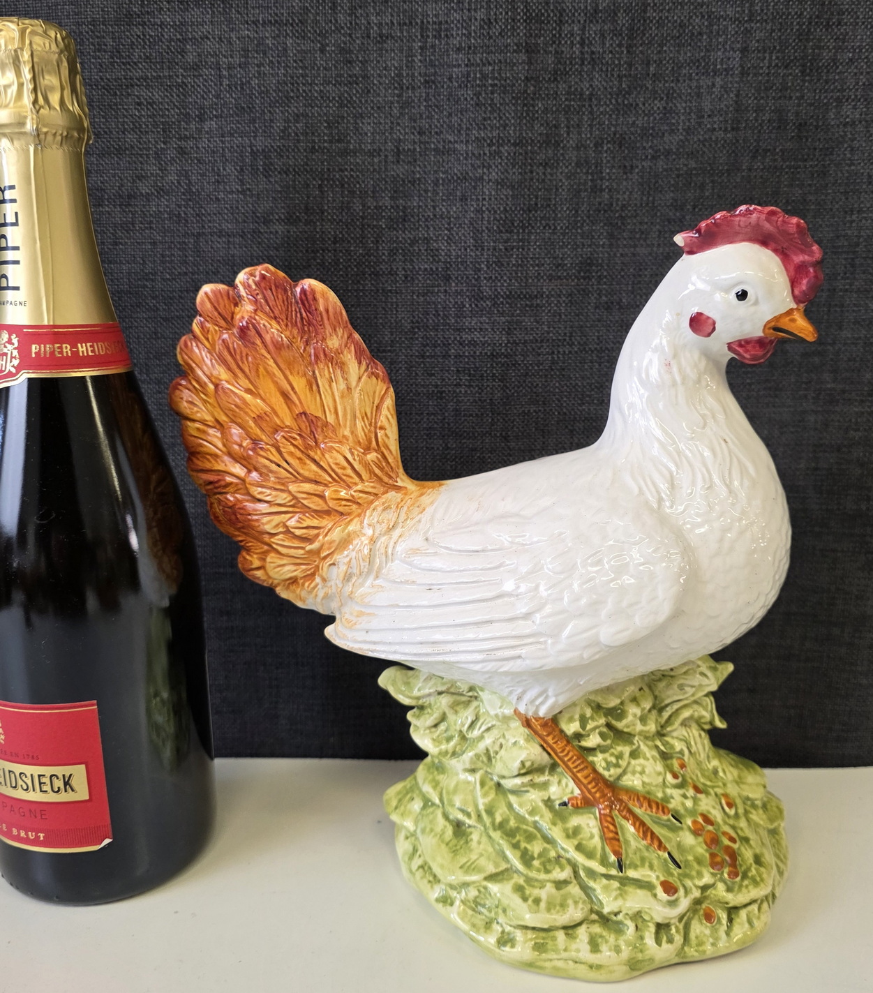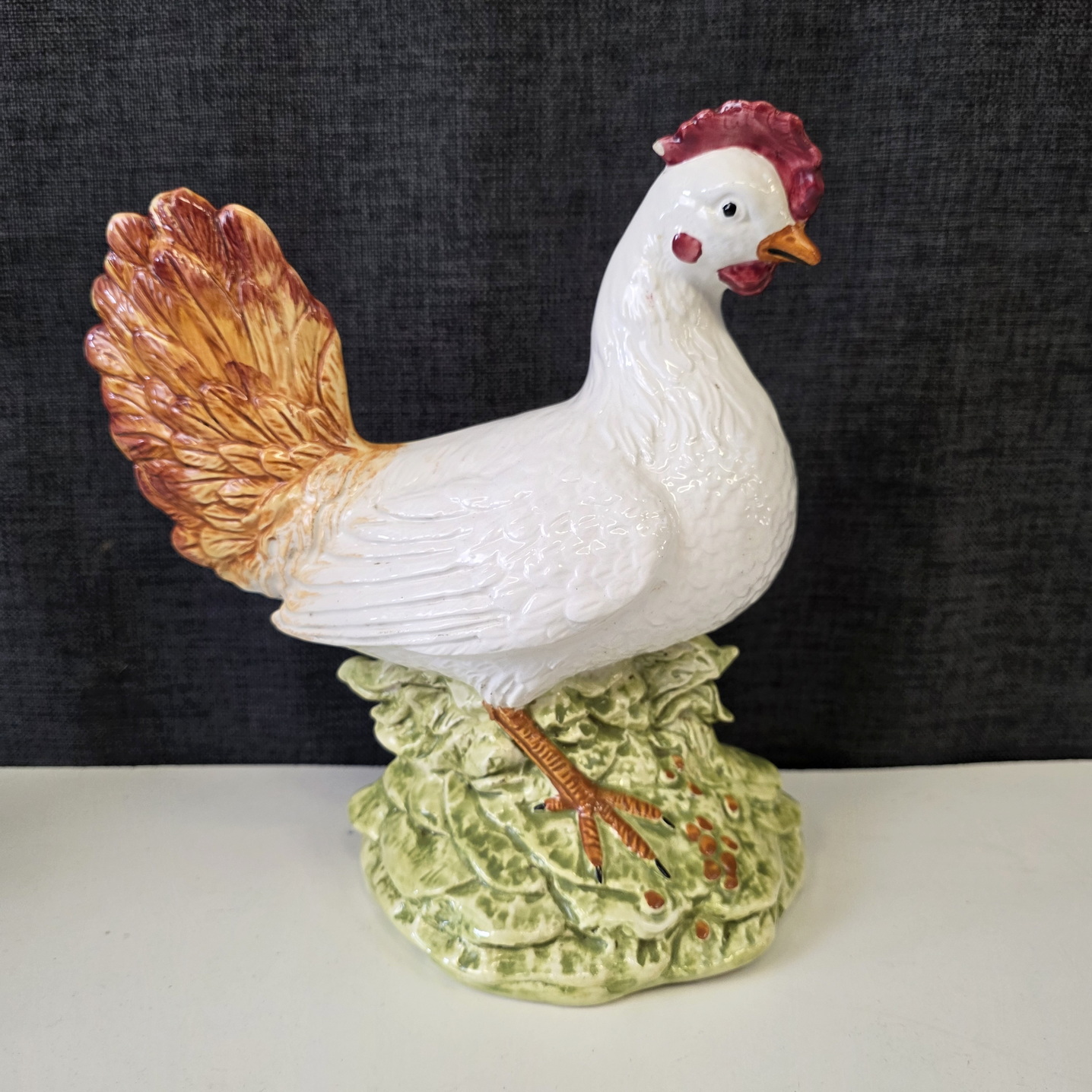 A vintage French faience hen hand painted in natural coloured glazes, standing on a clump of grass. Please note the wonderful compositions and colours. France, circa 1960.