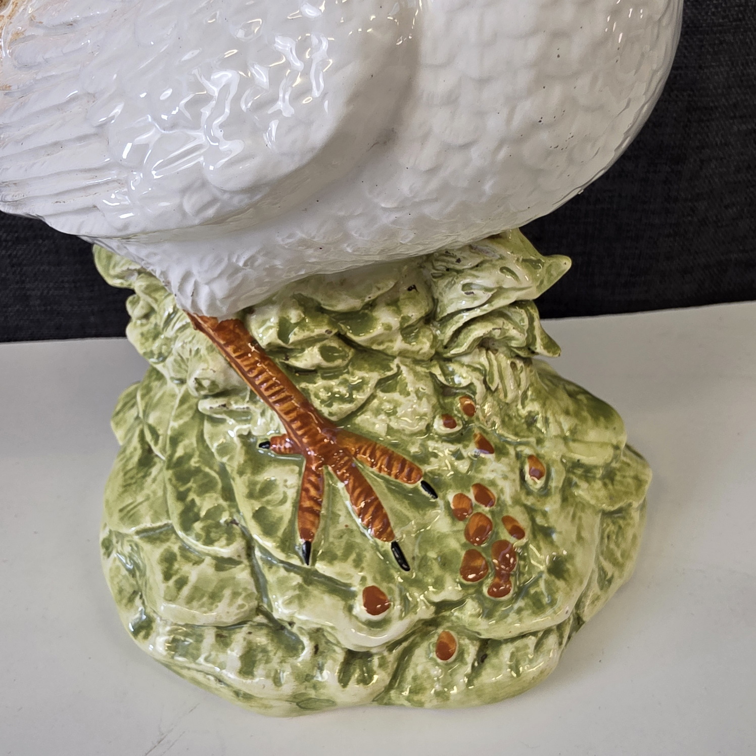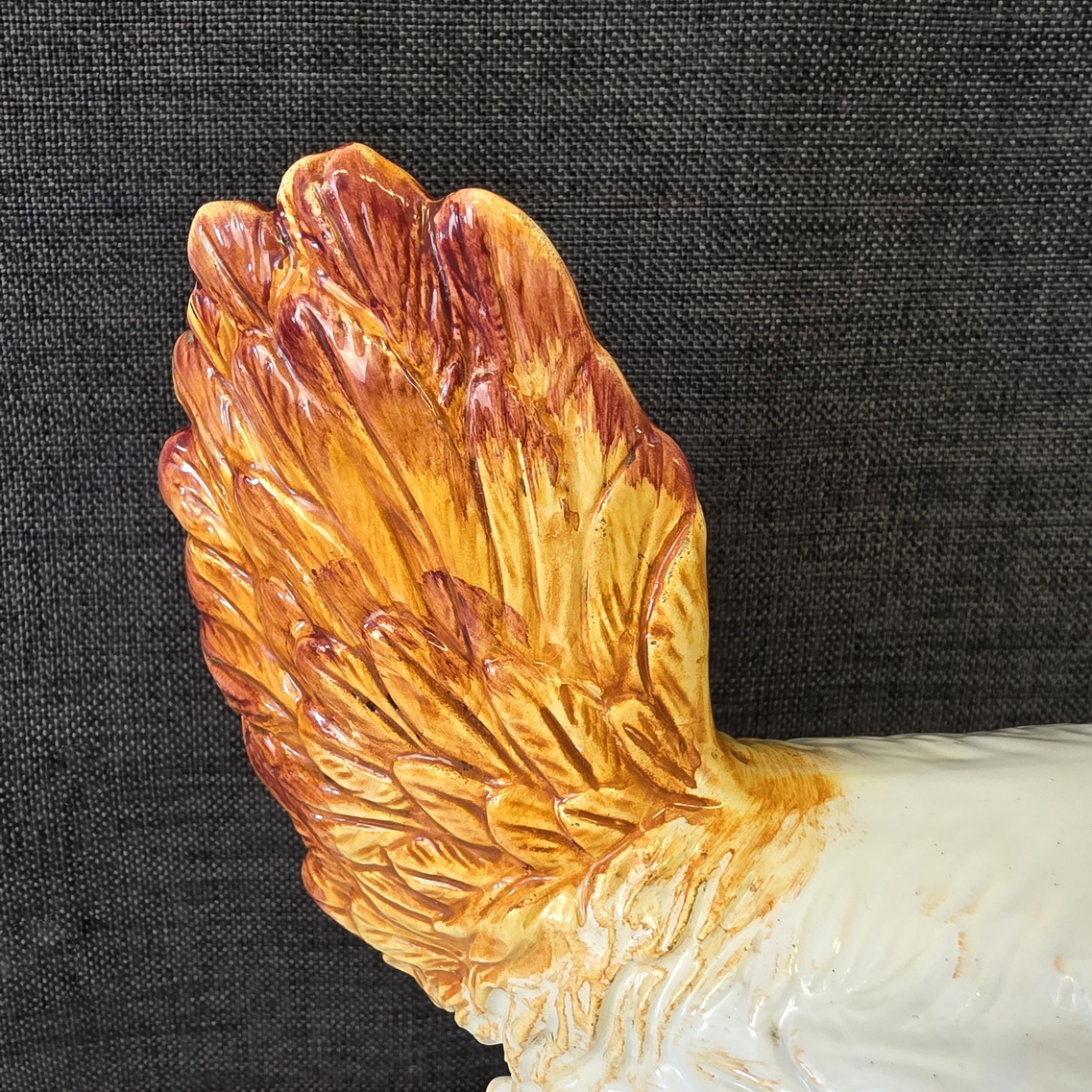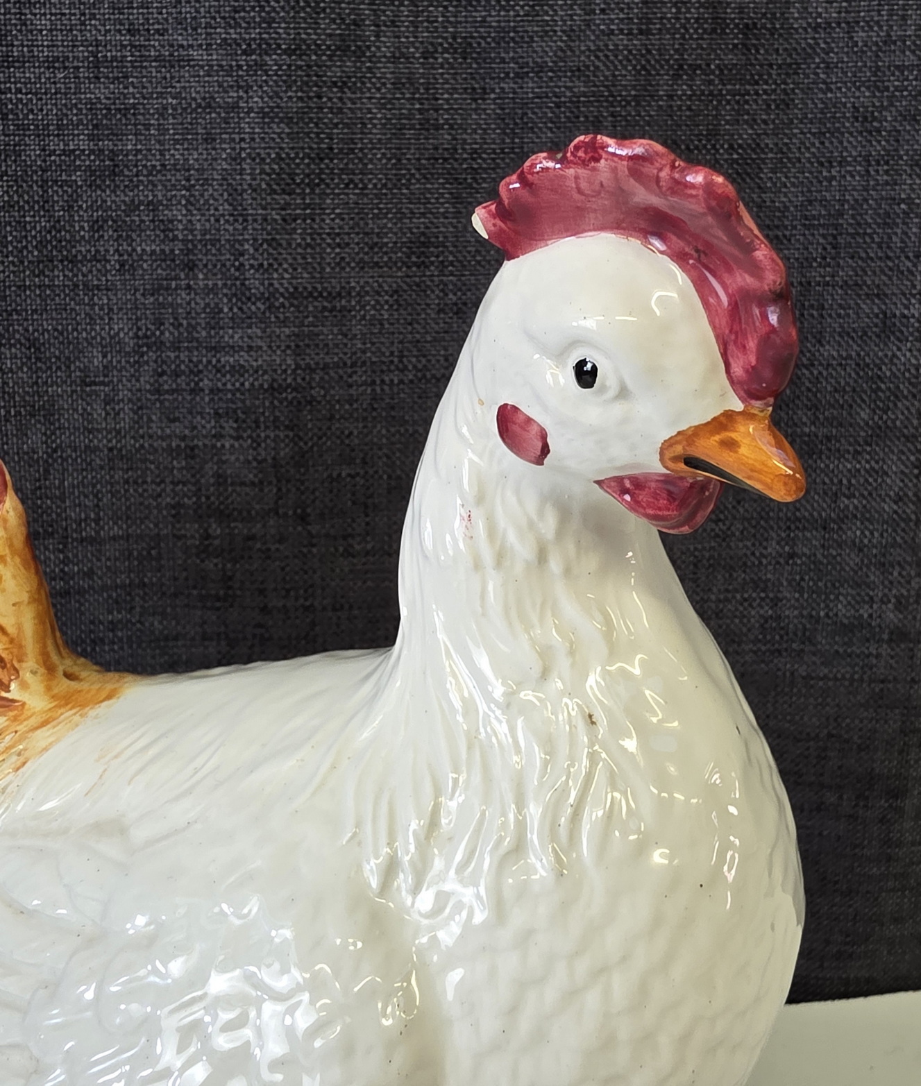 A vintage French faience hen hand painted in natural coloured glazes, standing on a clump of grass. Please note the wonderful compositions and colours. France, circa 1960.