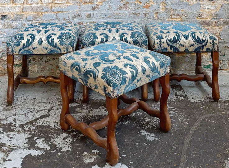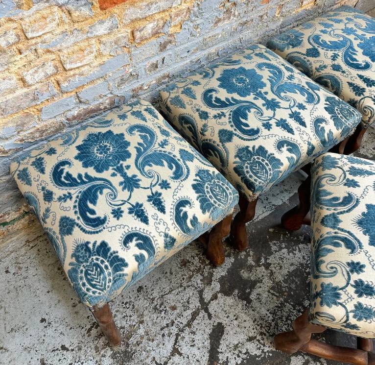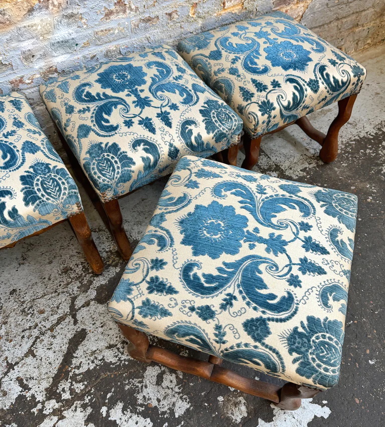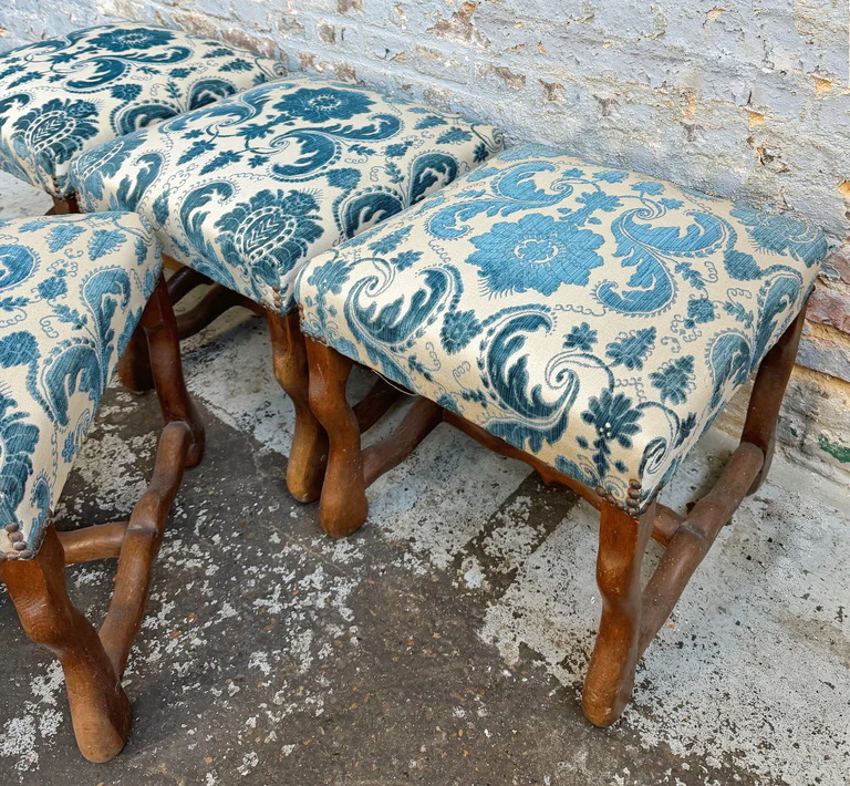 A lot of four French Regence style beechwood tabouret stools, the legs and rails carved in the "Os-de-Mouton" shapes. The seats upholstered in French brocade fabric. Area of Paris, circa 1930.