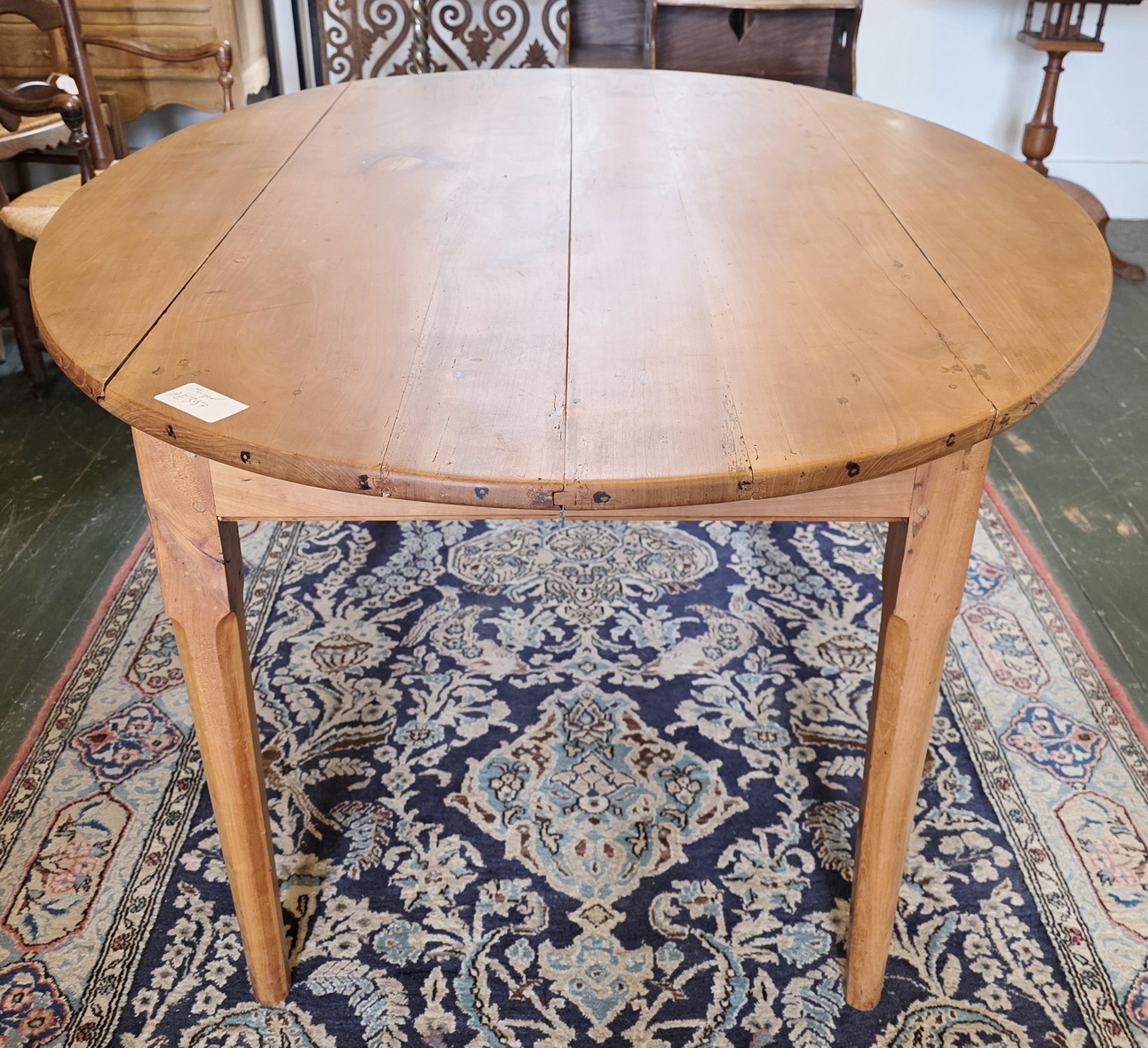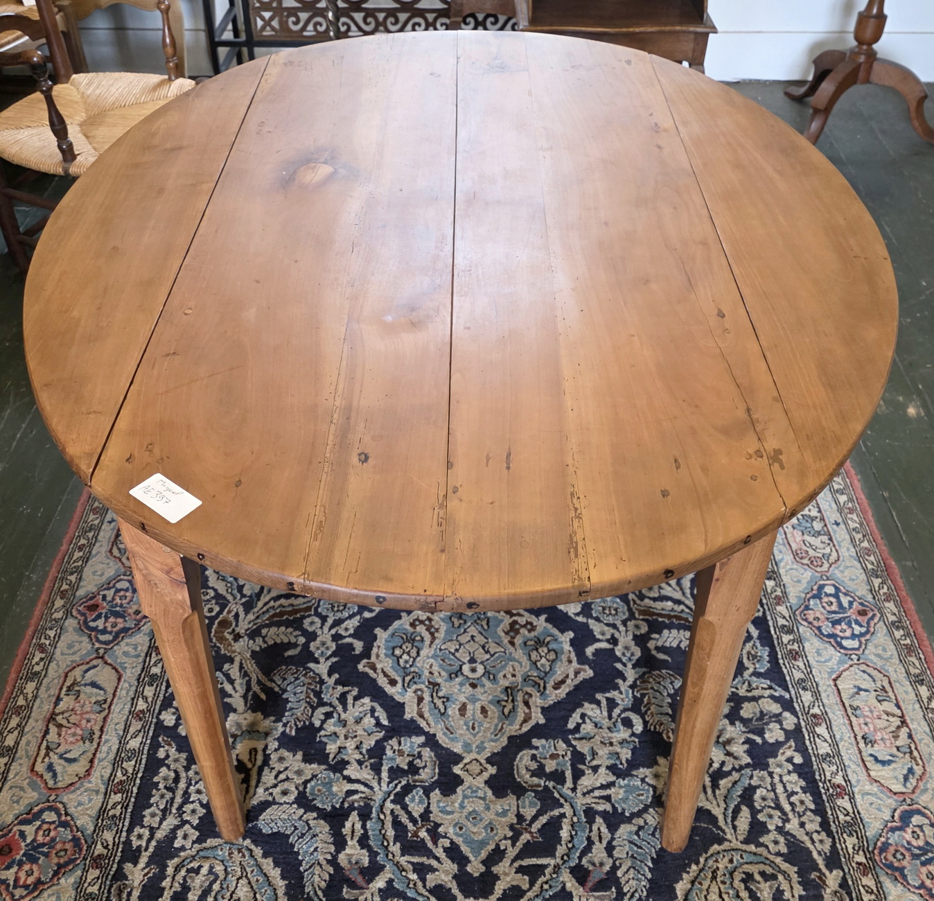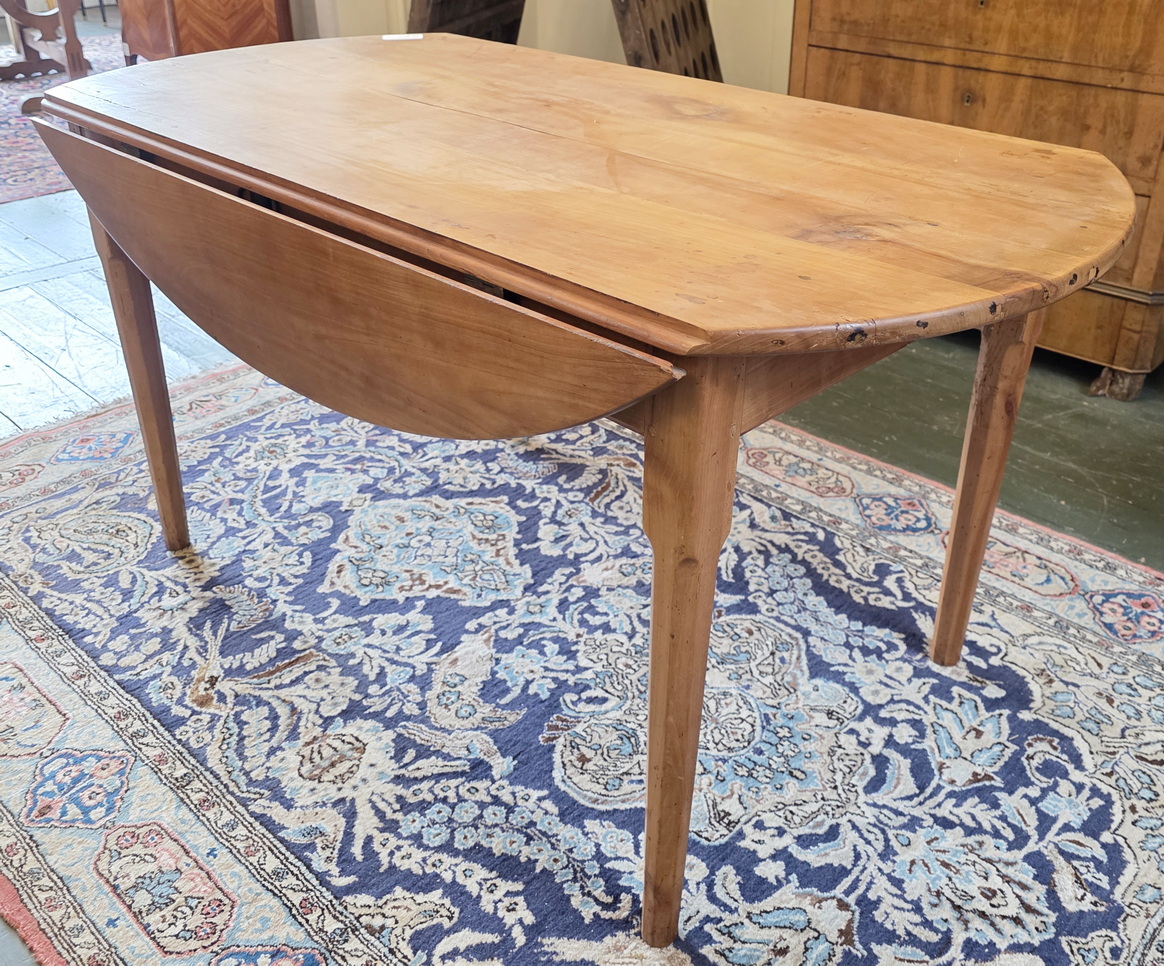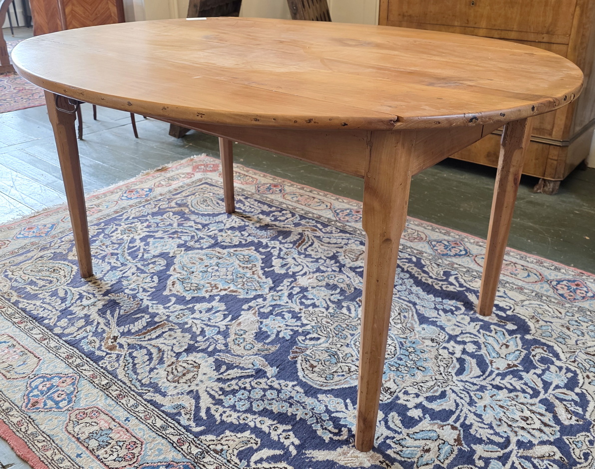 An early 19th century French provincial oval-top drop leaf dining table, the solid cherrywood top standing on four elegant square-section and chamfered, tapering legs. The top has two drop leaves, that make it easier to place this table in a room when not required at full size. Area of the Loire, circa 1830.