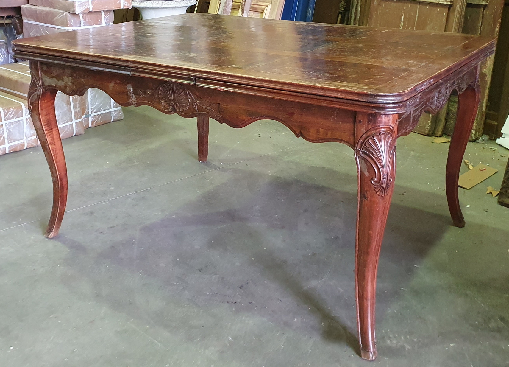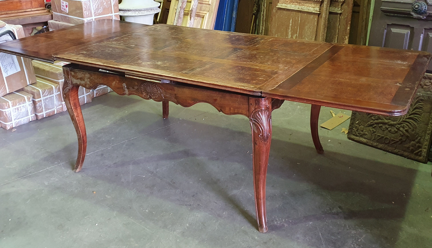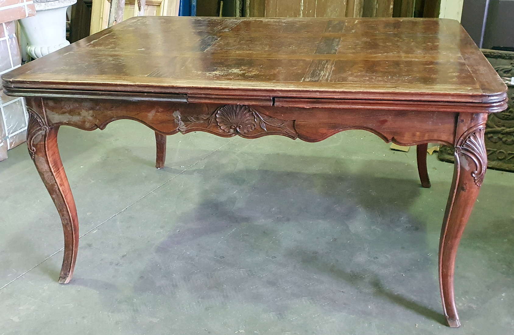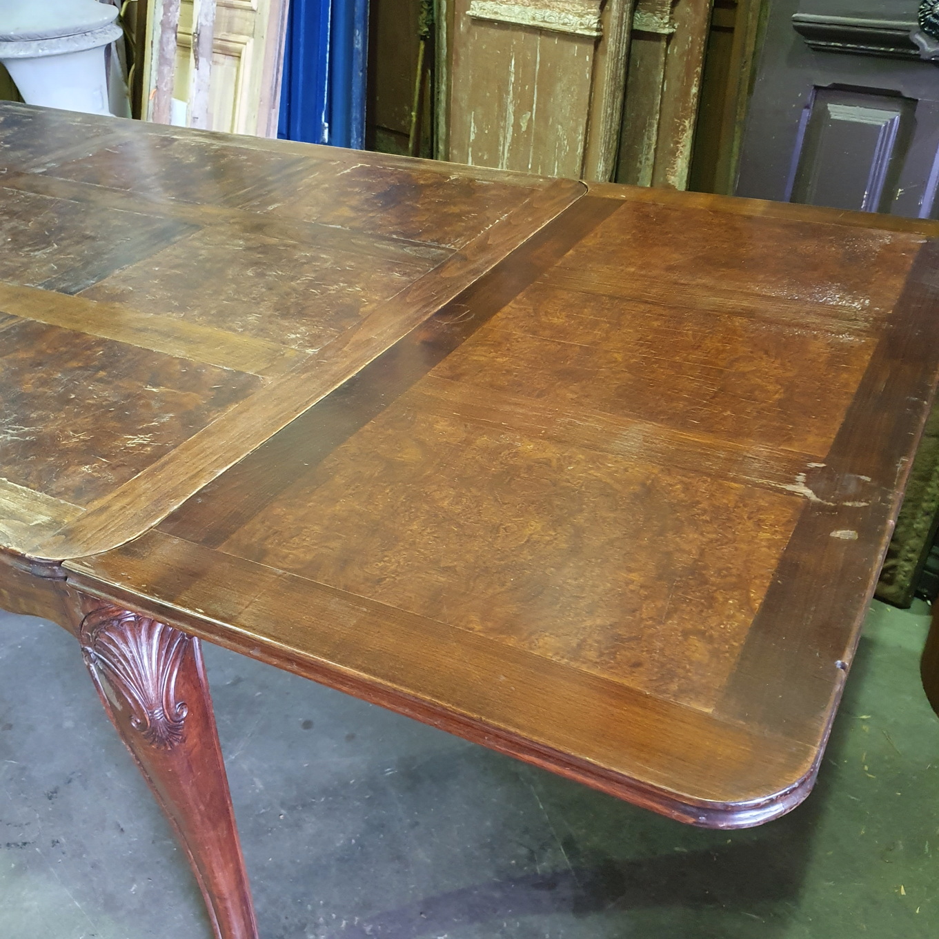 A French Provincial, Louis XV style carved walnut and burr walnut parquetry inlaid extending dining table. The moulded-edge table top above elegant Cabriole legs, joined by shaped and moulded rails. This table has its two original extension leaves, which are also walnut parquetry-inlaid. The extension leaves are stored under the table top and can easily be pulled out using the slide-out mechanism. (Photo shows one leaf not fully pulled out). Please note the wonderful quality of the timbers and of the carved decorations. Area of Paris, circa 1930.