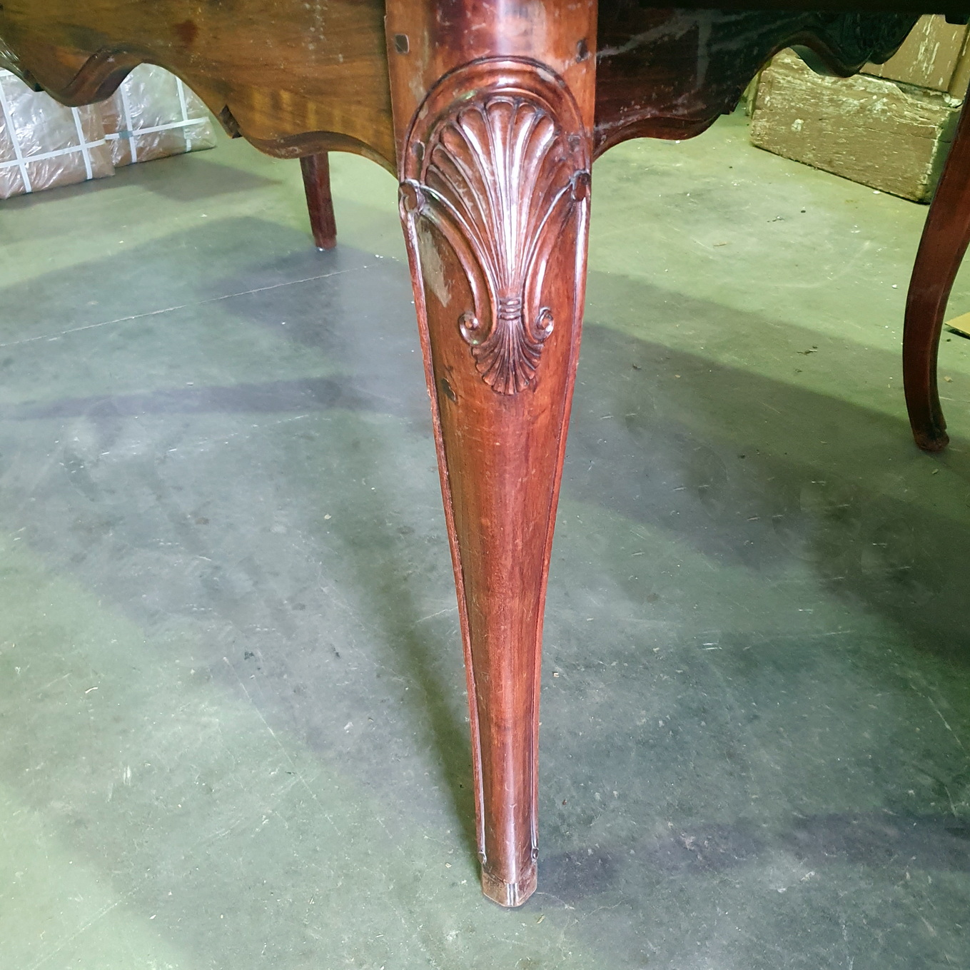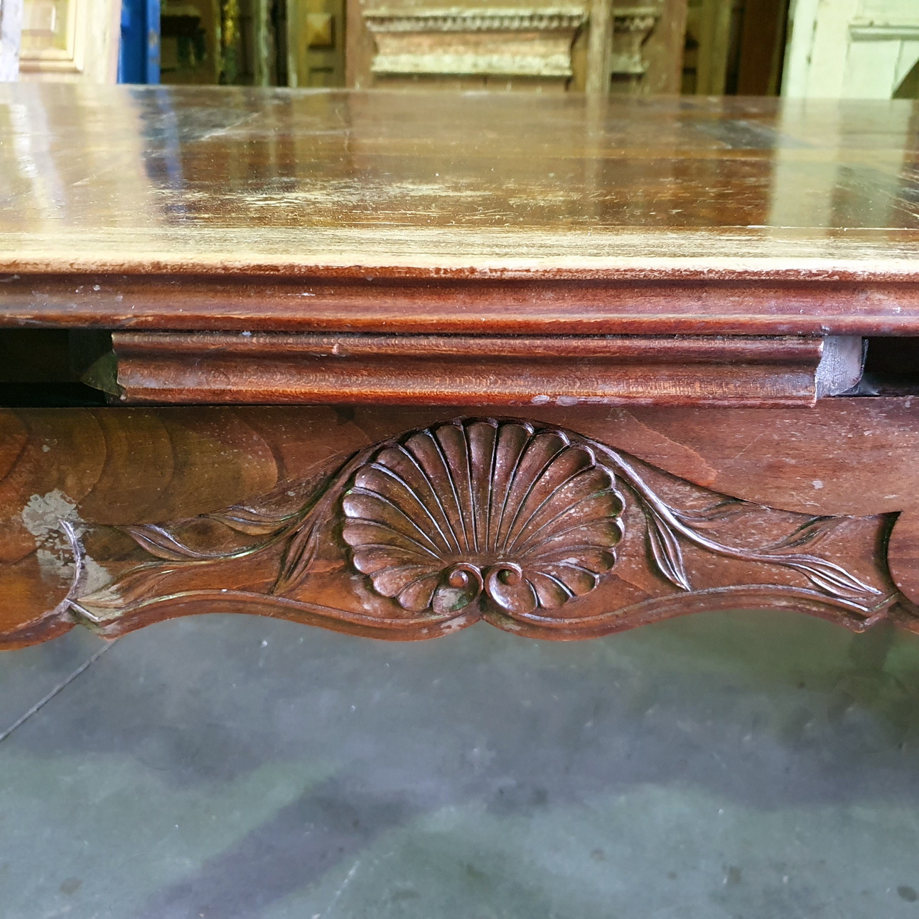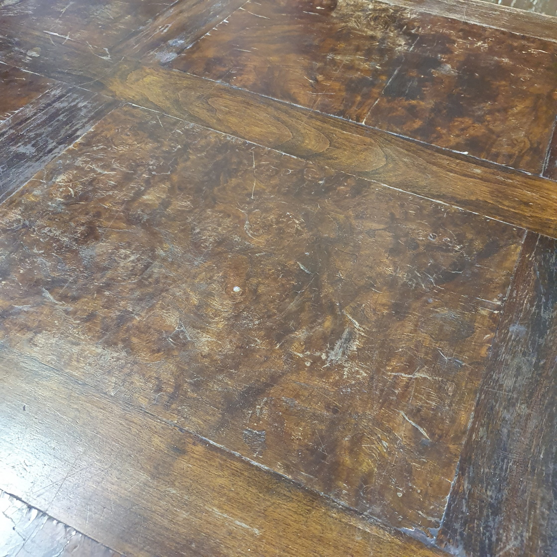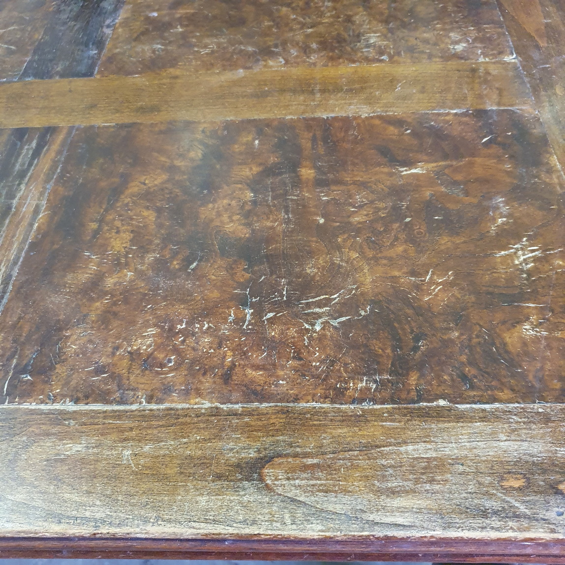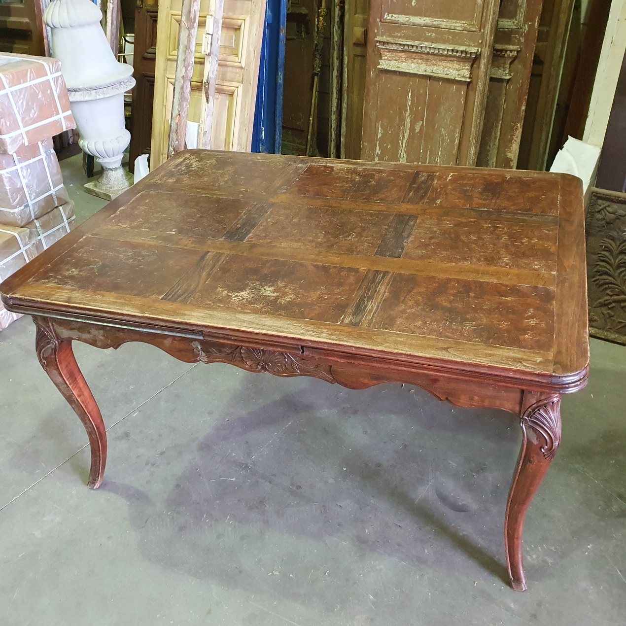 A French Provincial, Louis XV style carved walnut and burr walnut parquetry inlaid extending dining table. The moulded-edge table top above elegant Cabriole legs, joined by shaped and moulded rails. This table has its two original extension leaves, which are also walnut parquetry-inlaid. The extension leaves are stored under the table top and can easily be pulled out using the slide-out mechanism. (Photo shows one leaf not fully pulled out). Please note the wonderful quality of the timbers and of the carved decorations. Area of Paris, circa 1930.