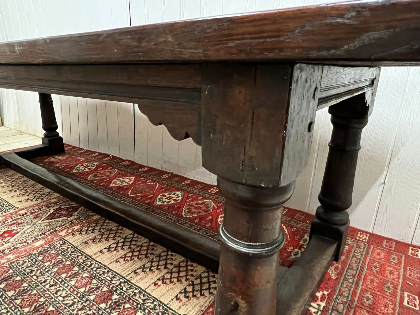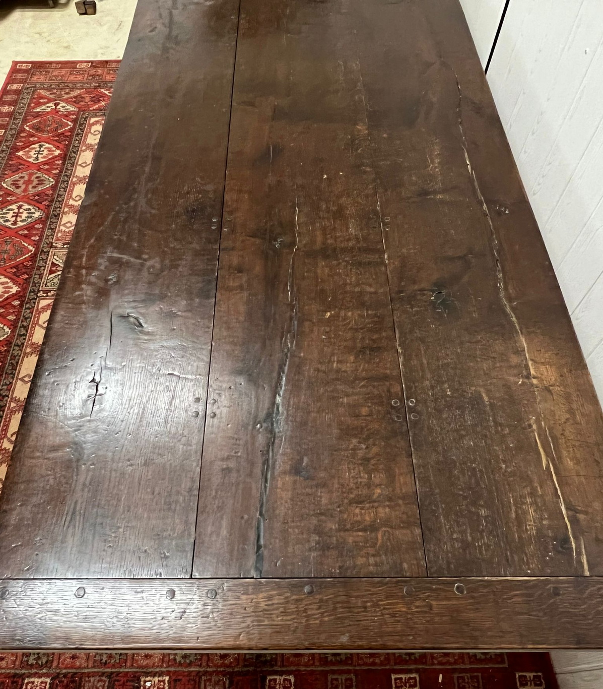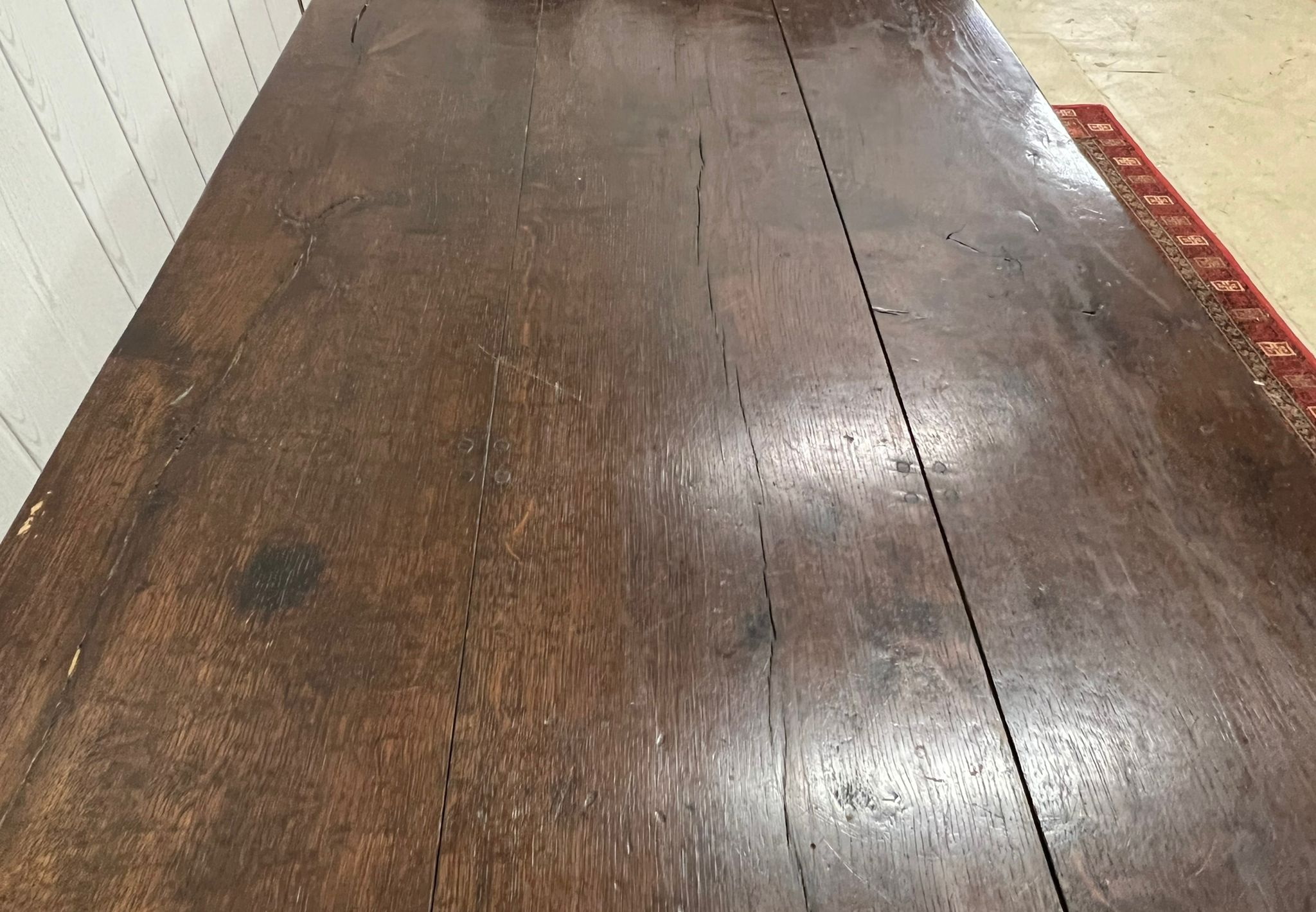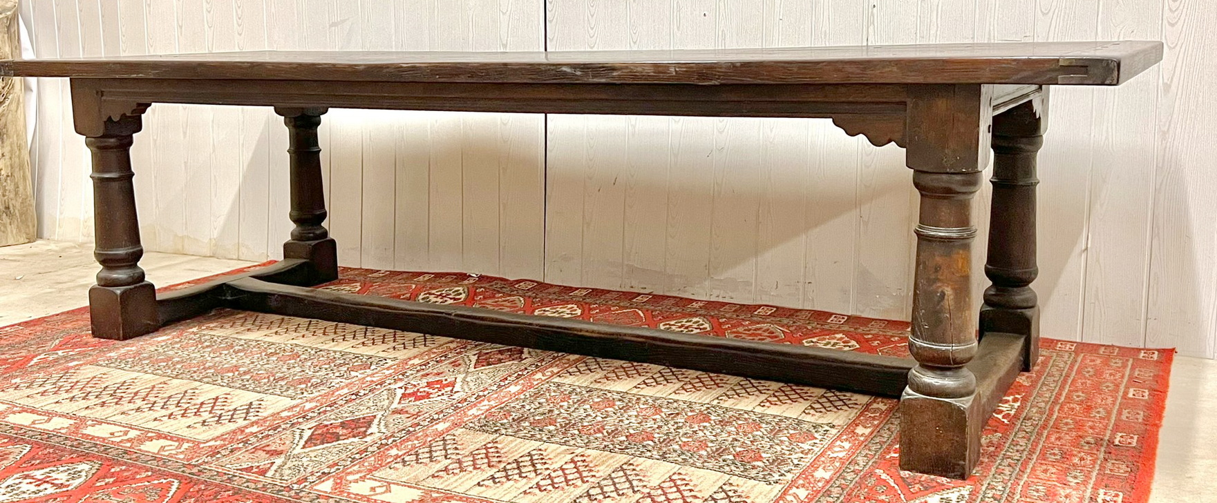 A large and wide 19th century French Louis XIV style solid oak Monastery's refectory table, the 4 cm thick top with a wonderful texture from use, standing on elegant, cannon barrel turned oak legs joined by a sturdy 'H' stretcher, well-worn by feet. Retaining a very good and original patination throughout, the surfaces of the timbers nicely burnished. Please note the large overhangs of the top, at each table end. Area of Normandy, France, circa 1850.Please note: this item is due in Melbourne in mid 2026.