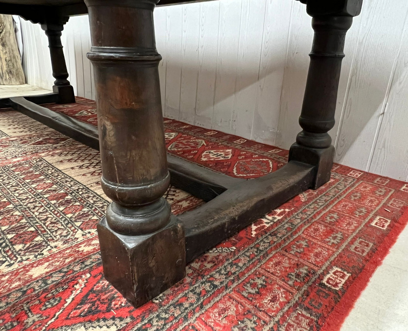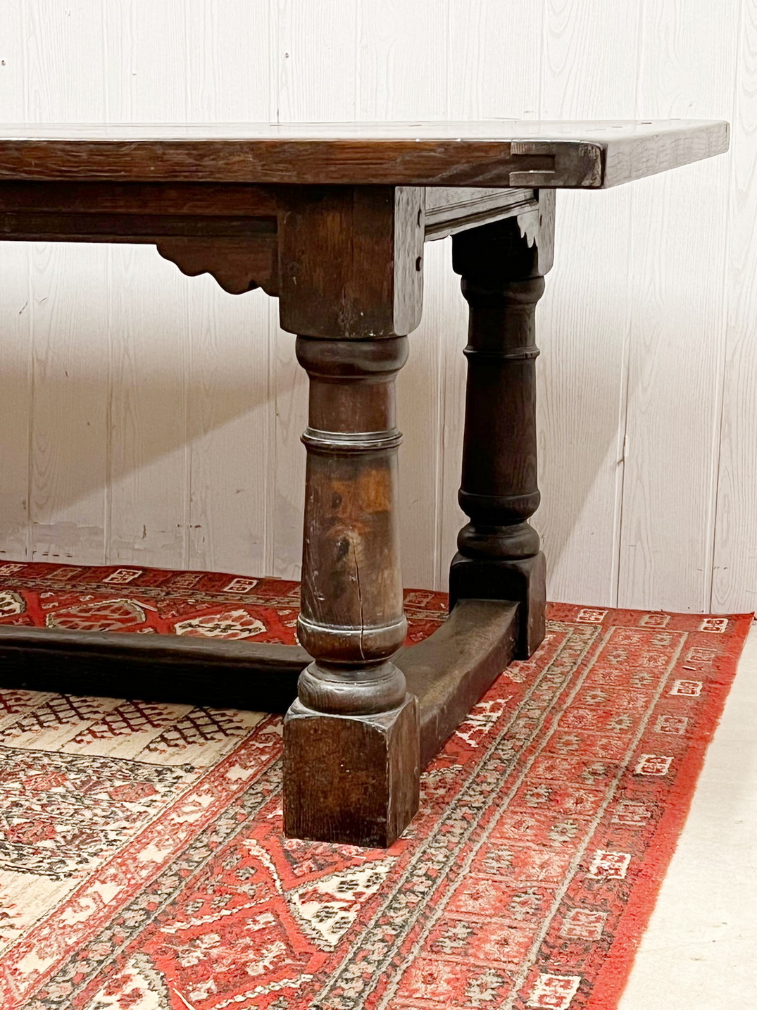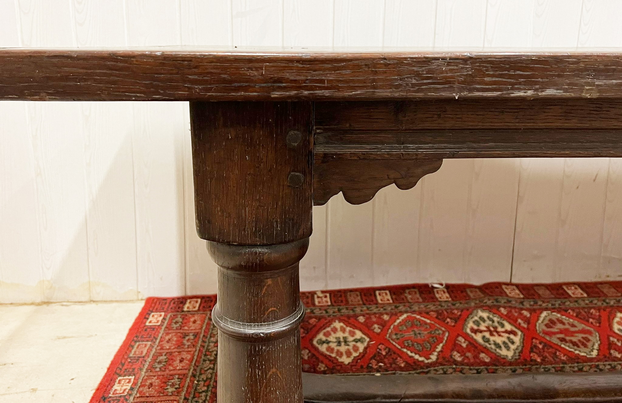 A large and wide 19th century French Louis XIV style solid oak Monastery's refectory table, the 4 cm thick top with a wonderful texture from use, standing on elegant, cannon barrel turned oak legs joined by a sturdy 'H' stretcher, well-worn by feet. Retaining a very good and original patination throughout, the surfaces of the timbers nicely burnished. Please note the large overhangs of the top, at each table end. Area of Normandy, France, circa 1850.Please note: this item is due in Melbourne in mid 2026.