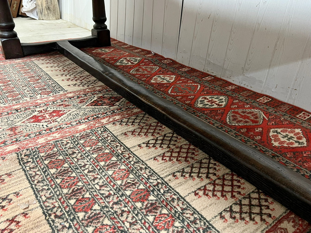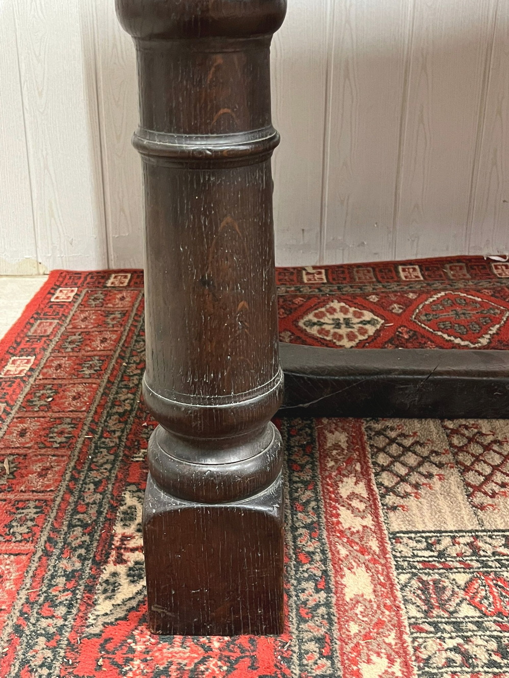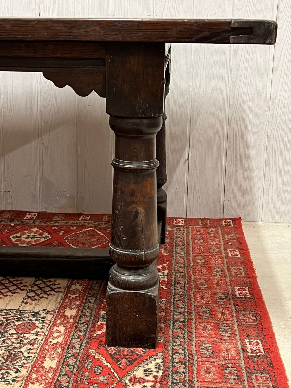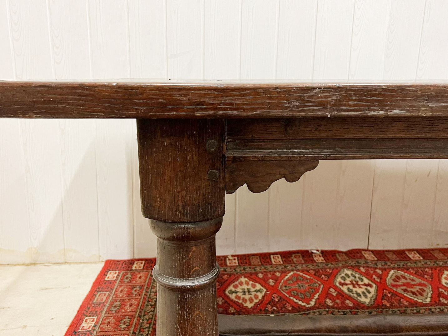 A large and wide 19th century French Louis XIV style solid oak Monastery's refectory table, the 4 cm thick top with a wonderful texture from use, standing on elegant, cannon barrel turned oak legs joined by a sturdy 'H' stretcher, well-worn by feet. Retaining a very good and original patination throughout, the surfaces of the timbers nicely burnished. Please note the large overhangs of the top, at each table end. Area of Normandy, France, circa 1850.Please note: this item is due in Melbourne in mid 2026.