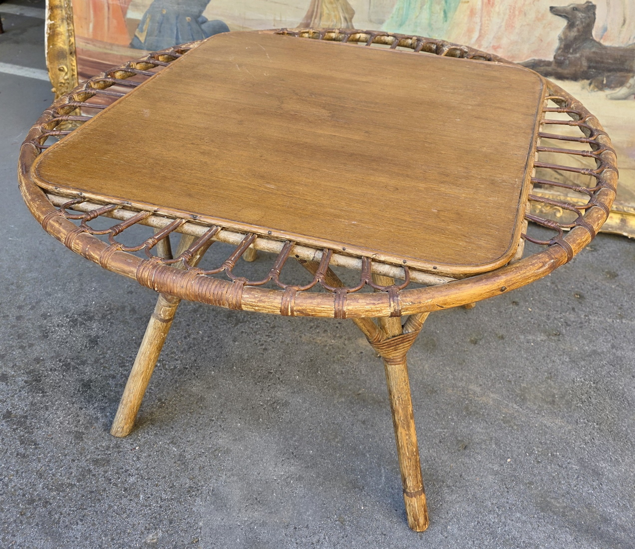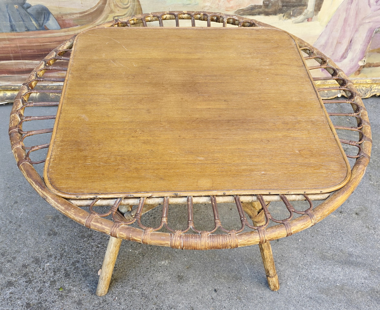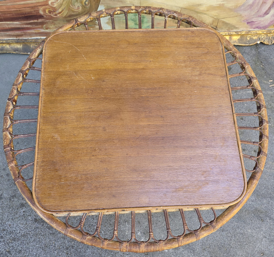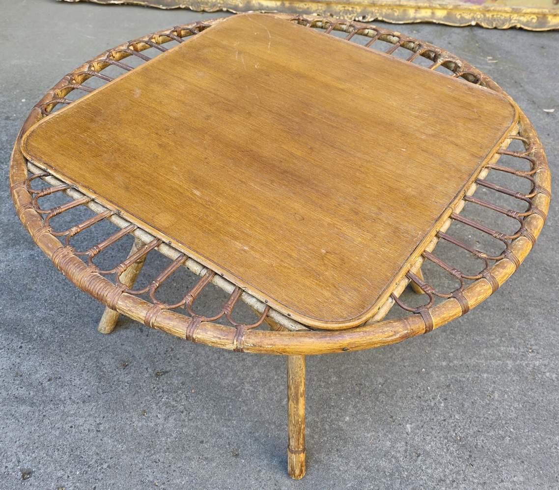 A vintage French 'Trampoline' coffee table designed by Janine Abraham and Dirk Jan Rol, the square timber top within a circle made from woven rattan, standing on four splayed legs with reinforcing arches. France, circa 1950.