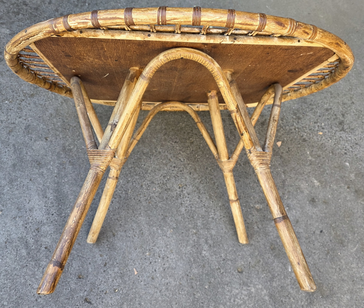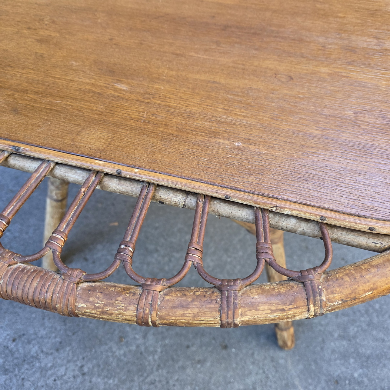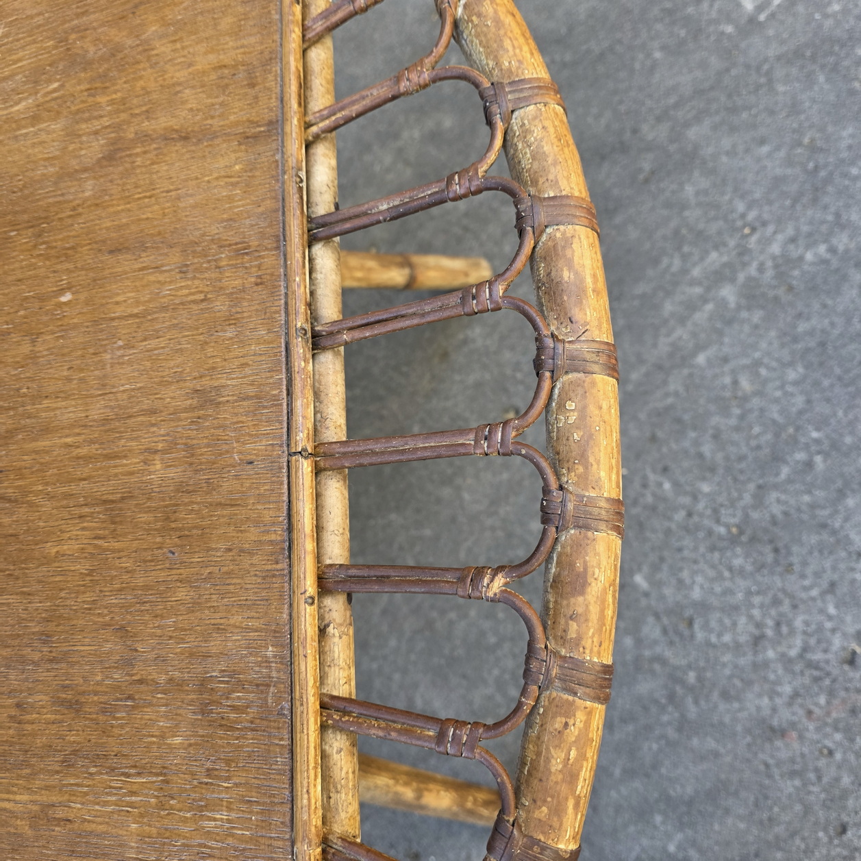 A vintage French 'Trampoline' coffee table designed by Janine Abraham and Dirk Jan Rol, the square timber top within a circle made from woven rattan, standing on four splayed legs with reinforcing arches. France, circa 1950.